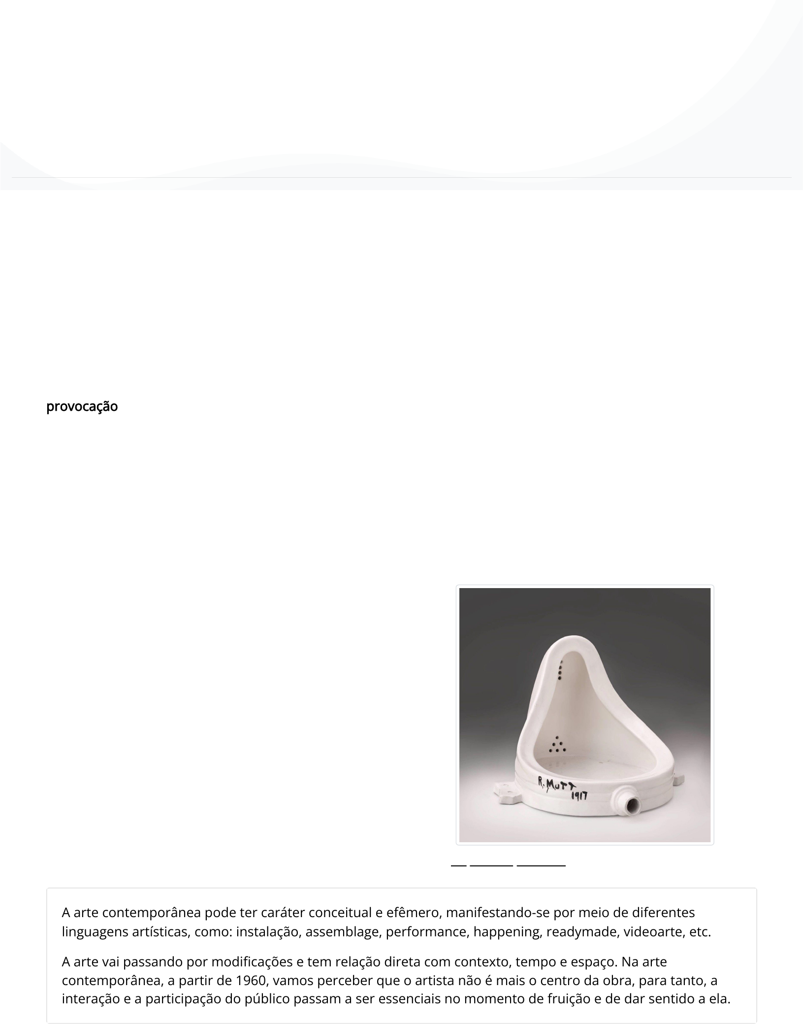 A arte contemporânea é uma manifestação artística que está ultrapassando os meios convencionais de representação e com os avanços tecnológicos vem ganhando espaço em todas as formas de comunicação e expressão. Assim, nesta webaula, estudaremos sobre a arte contemporânea. Arte contemporânea O artista tem maior liberdade de criação por meio das evoluções tecnológicas e sociais, permitindo novas linguagens, o0bjetos e técnicas sejam incorporadas no processo de criação. Uma das características da arte é a provocação – provocação no sentido de gerar discussões, re�exões acerca de determinados temas ou acontecimentos sociais. A arte contemporânea é provocativa e constantemente nos “tira” da zona de conforto. É exatamente o que acontece quando uma mostra apresenta obras mais polêmicas, que questionam crenças e valores socialmente construídos. Marchel Duchamp (1887-1968) Marchel Duchamp foi um artista que in�uenciou fortemente a arte contemporânea. Em meio a um contexto ainda in�uenciado pela arte moderna e meios tradicionais de arte, ele criou obras provocativas e pensadas de maneira bem diferente para a época, como a obra “a fonte”, que marcou o uso de instalação de objetos que passam a ter sentido de arte. A Fonte Fonte: https://bit.ly/2ZrkKIK. Acesso em: 30 ago. 2019. A arte contemporânea pode ter caráter conceitual e efêmero, manifestando-se por meio de diferentes linguagens artísticas, como: instalação, assemblage, performance, happening, readymade, videoarte, etc. A arte vai passando por modi�cações e tem relação direta com contexto, tempo e espaço. Na arte contemporânea, a partir de 1960, vamos perceber que o artista não é mais o centro da obra, para tanto, a interação e a participação do público passam a ser essenciais no momento de fruição e de dar sentido a ela. Educação e Arte Arte na contemporaneidade Você sabia que seu material didático é interativo e multimídia? Isso signi�ca que você pode interagir com o conteúdo de diversas formas, a qualquer hora e lugar. Na versão impressa, porém, alguns conteúdos interativos �cam desabilitados. Por essa razão, �que atento: sempre que possível, opte pela versão digital. Bons estudos! https://bit.ly/2ZrkKIK Linguagens artísticas Todos os processos permitem inúmeras formas de representação e utilização de materiais, desde o mais singelo até o mais inusitado sugerindo reações instintivas e espontâneas ao espectador. Instalação A instalação, embora ainda apresente um conceito muito discutido, é uma técnica experimental que abre um leque de diferentes possibilidades artísticas. O espaço é essencial, tendo em vista que a instalação faz parte da obra. Quando um artista pensa uma instalação, apropria-se de objetos, de diferentes materiais e, até mesmo, de técnicas tradicionais, como desenhos, pinturas e esculturas, ressigni�cando-os por vezes. Nessa linguagem, a obra �ca exposta e o espaço faz parte dela, além de normalmente envolver o espectador por meio de interação. Alguns artistas utilizam materiais diversi�cados, provocando sensações diferentes, que podem ser fruídas por meio de vários sentidos. Happening A linguagem do happening surgiu a partir dos anos 50, em um momento em que a arte foi às ruas, por meio de técnicas de teatro, encenação, improvisações e espontaneidades que envolviam o público, contudo, sem regras, tampouco um início, um meio e um �m, uma vez partindo da improvisação. O termo happening tem origem inglesa e signi�ca “acontecimento”. Foi utilizado pela primeira vez pelo artista Allan Kaprow para se referir a uma linguagem da arte que se apresentava fora de galerias e museus. Assemblage A linguagem da assemblage surge em 1953, por Jean Dubu�et (1901-1985), que relacionou o termo aos trabalhos que vão além da colagem. Trata-se de um conceito que envolve a técnica de colagem, mas em um sentido mais amplo, relativo à acumulação. Os artistas que produzem assemblage podem utilizar diferentes elementos retirados da realidade para que estes incorporem a obra e deem sentido a ela – o que não quer dizer que os elementos perdem o sentido original. Um dos artistas que trabalharam com essa linguagem foi Robert Rauschenberg, ao desenvolver trabalhos que uniram a pintura e a comunicação, retartando a cultura popular, a arte e a vida cotidiana. Readymade A Readymade pode ser entendida como uma linguagem da arte contemporânea que ressigni�ca objetos já fabricados, atribuindo ao público a decisão �nal de, por exemplo, uma roda de bicicleta montada ao contrário sobre um banco, ser ou não uma obra de arte (MILLET, 1997, p. 42). Assim como fez Marcel Duchamp, com as obras A Roda de Bicicleta e A Fonte. Performance Essa linguagem surgiu por volta da década de 1960, por meio da combinação do teatro, da música, da poesia e do vídeo. O artista passa a compor a obra e a se apropriar de diferentes linguagens. Ela pode ter, ou não, a participação do público, como também pode apresentar um tempo determinado pelo artista, que planeja cuidadosamente cada detalhe da obra. A diferença entre o happening e a performance é que existe, no primeiro, uma intencionalidade do artista na interação com o expectador; já na performance, o que prevalece é a espontaneidade. Arte efêmera A arte efêmera teve seu início entre as décadas de 1960 e 1970 e está relacionada à arte de pouca duração, transitória, passageira, tendo em vista que a criação acontece por meio do uso de elementos perecíveis, ou estão relacionadas a instalações, happenings e performances. Dessa forma, a obra é divulgada e registrada por meio de recursos tecnológicos, como a fotogra�a, os vídeos, etc. O público pode até mesmo apresentar um papel ativo nas propostas artísticas. Vicente José de Oliveira Muniz, conhecido como Vik Muniz, é um dos artistas que utiliza esse tipo de linguagem. O ar