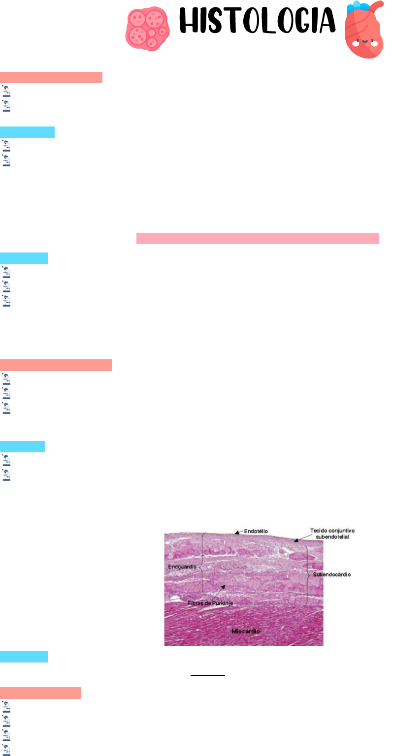 Características Gerais: Camadas do coração têm semelhança com a organização histológica dos grandes vasos. Camadas são formadas por tecidos e podem ter mais de um tecido em sua composição. Endocárdio: Camada mais interna do coração Formada por: • Endotélio: tecido epitelial pavimentoso simples, epitélio que reveste o coração internamente. • Camada Subendotelial: tecido conjuntivo frouxo com fibras elásticas e colágenas, que permitem as contrações cardíacas. • Camada Subendocárdica: conecta o miocárdio à camada subendotelial, presença de Fibras de Purkinje. Um epitélio sempre repousa por um tecido conjuntivo. Miocárdio: Camada intermediária do coração Camada mais robusta do coração Células musculares estriadas cardíacas (cardiomiócitos): • Células alongadas e ramificadas • 1 a 2 núcleos centrais • Unidas por discos intercalares Tipos de Cardiomiócitos: Contráteis: se contraem para bombear o sangue. Mioendócrinos: células que produzem o fator natriurético atrial. Nodais: fazem parte do sistema gerador e condutor do impulso cardíaco, essenciais na transmissão de impulsos, controle da contração rítmica. Epicárdio: Camada mais externa do coração É a lâmina visceral do pericárdio seroso, epicárdio como inteiro compõe o pericárdio seroso - Formado por: • Camada Subepicárdica: tecido conjuntivo frouxo fibroelástico com tecido adiposo • Mesotélio: tecido epitelial pavimentoso simples Pericárdio: É um saco fibroso e cheio de líquido que envolve o corpo muscular do coração e as raízes dos grandes vasos. Pericárdio Seroso: Fechado dentro do pericárdio fibroso. É dividido em duas camadas: Camada Parietal: reveste a superfície interna do pericárdio fibroso. Camada Visceral: forma a camada externa do coração, epicárdio. do coração Entre a camada visceral e parietal do pericárdio seroso existe a cavidade pericárdica, que contém uma pequena quantidade de fluido seroso lubrificante. Pericárdio Fibroso: Contínuo com o tendão central do diafragma Constituído por tecido conjuntivo resistente Estrutura rígida evita o enchimento rápido do coração Conceitos básicos Tecidos: Conjunto de células especializadas, iguais ou não entre si, que desempenham funções semelhantes. Coloração: Células e tecidos = C, O, N, H (baixo peso molecular = baixo contraste) Estudo dos métodos de coloração dos tecidos e células Componentes dos tecidos que coram com corantes básicos: Basófilos Corantes básicos: Hematoxilina, Azul de Toluidina e Azul de Metileno Componentes dos tecidos que coram os corantes ácidos: Acidófilos Corantes ácidos: Eosina, Fucsina A hematoxilina é um corante básico, que tem atração a substâncias ácidas (lembre-se que os opostos se atraem). Essas substâncias ácidas, portanto, são coradas pela hematoxilina, e recebem o nome de basófilas (que fixam corantes básicos, pois “gostam” de básicos). Mas nem tudo é ácido nas células e tecidos. A eosina, ao contrário da hematoxilina, tem caráter ácido e, sendo assim, atrai substâncias básicas, conhecidas como acidófilas (que fixam corantes ácidos). A eosina é um corante vermelho. Dessa forma, tudo aquilo que você observar na lâmina com essa cor é uma substância básica, e que foi atraída pela eosina (que é ácida), sendo, então, uma substância acidófila. Corante Substância corada Característica por afinidade Coloração Hematoxilina (básica) Ácida Basófila Azul-púrpura Eosina (ácida) Básica Acidófila Vermelho Citoplasma: Caráter mais básico, corado em tonalidades de vermelho pela eosina Algumas regiões do citoplasma podem se apresentar azuladas, pois, há RNA (ácido ribonucleico) nelas, que é corado pela hematoxilina Algumas células são inteiras mais ácidas, inclusive o citoplasma, nesses casos o núcleo fica com a coloração rosa e roxa Núcleo: Caráter mais ácido porque o núcleo da célula é rico em DNA (ácido desoxirribonucleico) Coloração azul-púrpura (atraído pela hematoxilina, corante básico) Microscópio de Luz (Óptico): Instrumento óptico, que faz uso da refração da luz oriunda de uma série de lentes, dotadas, ou não, de filtros multicoloridos, para ampliar e regular estruturas invisíveis (ou difíceis de serem visualizadas) a olho nu. Parte ótica: para ampliação das imagens Parte mecânica: para suportar o sistema ótico e realizar a focalização 4 tipos básicos de tecidos: TECIDO CÉLULAS Matriz Extra Celular (MEC) FUNÇÕES PRINCIPAIS Epitelial Poliédricas justapostas Pouca Revestimento, secreção Conjuntivo Vários tipos Abundante Apoio e proteção Muscular Alongadas contráteis Moderada Movimento Nervoso Longos prolongamentos Nenhuma Impulsos nervosos Epitelial: Células poliédricas justapostas MEC: Rara ou Ausente Grande capacidade de coesão entre as células Avascularizado Lâmina Basal: separa do conjuntivo e permite a difusão de substâncias → Nutrição Quando associada com fibras → Membrana Basal Tecido Epitelial de Revestimento: Reveste a superfície externa e as cavidades do corpo Células organizadas em camadas Evita perdas excessivas de água (queratina) Sistema tegumentar, digestório, respiratório, circulatório e urogenital Classificação: ✓ Número de camadas celulares ✓ Morfologia das células MEC: líquido nos espaços entre as células (quanto mais próximas as células, menos MEC) Epitélio Simples: 1 camada (todas tocam a lâmina basal) Epitélio Estratificado: Várias camadas, apenas 1 toca a L.B. Pseudo-Estratificado: 1 camada, núcleos e alturas diferentes Morfologia das células: Células Pavimentosas: - Células Endoteliais - Coração: Endotélio possui Células Cúbicas: - Tireoide Células Cilíndricas: - Intestino Observações: Discos Intercalares: São junções comunicantes que permitem a contração sincronizada das células cardíacas. Células de Purkinje: São estruturas fundamentais no processo de propagação do 