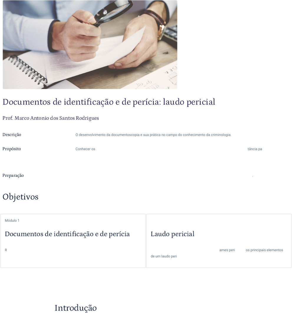 Documentos de identi�cação e de perícia: laudo pericial Prof. Marco Antonio dos Santos Rodrigues Descrição O desenvolvimento da documentoscopia e sua prática no campo do conhecimento da criminologia. Propósito Conhecer os aspectos que envolvem a elaboração de uma perícia grafotécnica, o que é de fundamental importância para os alunos que atuarão no campo do saber jurídico, pois fornecerá uma visão geral e específica das leis que fundamentam o exame pericial, permitindo uma real compreensão dos limites de atuação e das possibilidades de conclusões dos peritos, nos casos de fraudes documentais. Preparação Antes de iniciar a leitura do conteúdo, tenha em mãos o Código de Processo Civil, que será útil para o seu estudo. Objetivos Módulo 1 Documentos de identi�cação e de perícia Reconhecer os conceitos básicos sobre a perícia documentoscópica. Módulo 2 Laudo pericial Analisar a fundamentação legal sobre os exames periciais e os principais elementos de um laudo pericial. Introdução Fraudes e falsificações são práticas realizadas desde os primórdios da humanidade. Suas causas são diversas, como desvio de personalidade, poder, vaidade, dentre outras. Mas este não será o objeto do nosso estudo. Neste curso, você terá contato com uma gama de conhecimentos que são utilizados para auxiliar a Justiça na identificação dos tipos de fraudes e identificação de autenticidade e autoria de falsificadores. No primeiro módulo, você será apresentado aos conceitos inerentes à criação gráfica, como a morfogênese, que é o mecanismo fundamental das operações que produzem o grafismo, bem como ao gesto gráfico e a seu desenvolvimento e variantes, e às fases de evolução do grafismo. Em seguida, serão abordados os princípios, os postulados e as leis que fundamentam cientificamente todo o trabalho realizado pelo perito grafotécnico. Finalizando o primeiro módulo, trataremos das principais causas de modificação do grafismo e dos tipos mais comuns de falsificações. No segundo módulo, você conhecerá os aspectos legais referentes aos exames periciais e as partes constituintes do laudo pericial bem como os procedimentos que os peritos devem adotar na análise das peças questionadas e na coleta dos padrões a serem analisados. 1 - Documentos de identi�cação e de perícia Ao �nal deste módulo, esperamos que você reconheça os conceitos básicos sobre a perícia documentoscópica. Criação grá�ca Iniciação e produção do gra�smo Morfogênese O estudo da morfogênese está fundamentado nas atividades dos órgãos centrais do sistema nervoso, no qual o cérebro e a medula comandam alguns sistemas de nervos, entre eles os que atuam principalmente na criação do grafismo. O sistema nervoso periférico é o que age com grande importância na criação do grafismo, através de duas espécies de nervos: os sensitivos e os motores. Os sensitivos levam informações ao cérebro por meio dos cinco sentidos, e os motores conduzem as instruções do cérebro aos músculos para a execução dos movimentos. Na criação do grafismo, os respectivos nervos atuam da seguinte forma: O sistema nervoso periférico e a criação do grafismo. Podemos dizer então que a morfogênese é o mecanismo fundamental das operações que produzem o grafismo. A morfogênese se estrutura da seguinte forma: Gesto grá�co É o movimento coordenado dos músculos na execução de um grafismo. Veremos a seguir como o gesto gráfico é dividido: Coordenação dos movimentos É o fenômeno de adaptação, pelo qual os músculos se contraem e se distendem para, em combinação com os demais elementos anatômicos, produzirem grafismo. Quando a coordenação é normal e desenvolvida, produz ritmo, criando imagem gráfica rítmica, enquanto a coordenação anormal ou confusa produz escrita com alterações involuntárias afastando a grafia do seu tipo ideal. A coordenação regular do movimento atinge seu máximo com o exercício continuado. Contudo, estudos têm demonstrado que esse desenvolvimento máximo está em íntima relação com as Morfologia Mentalização ou ideação da linguagem gráfica. Gênese Planejamento ou criação de um conjunto gráfico. Sinergia Associação de diversos órgãos para a execução de um grafismo. condições individuais, tais como o temperamento mais ou menos nervoso; a reação intelectual mais ou menos pronta; a maior ou menor sensibilidade, entre outros aspectos. Rapidez dos movimentos São variações de velocidade ocorridas no gesto gráfico e transmitidas ao grafismo. Experiências demonstram que a rapidez dos movimentos obedece a um desenvolvimento do gesto gráfico, crescente e decrescente, em que a maior intensidade se localiza na porção mediana do grafismo. Dessa forma, podemos afirmar que todo o movimento começa e termina em uma progressão crescente e decrescente de velocidade; cada mudança de sentido, ainda que seja graduada, geralmente provoca uma parada parcial, diminuindo a rapidez do movimento, como observaremos na imagem em seguida: Análise de rapidez do movimento do grafismo. Precisão dos movimentos Está nitidamente condicionada à coordenação e à sensibilidade, sendo esta representada pela visão e pelo tato. Se, por um lado, a coordenação imprime ao registro um ritmo, por outro, a sensibilidade, através da visão, participa da harmonia do movimento na sua expressão final, e o tato colabora regulando a extensão e a direção do movimento. In�uência motora das emoções e ideias É a divergência que existe entre o tempo de planejamento no cérebro e o tempo de execução dos músculos na produção do grafismo. A ideia é muito mais rápida que a mão que escreve. Bastaria esse fato para afirmarmos que não haverá duas assinaturas iguais, mesmo que sejam do mesmo indivíduo. Haverá, sim, elementos genéticos ou individuais coincidentes. A ausência de variações (entre duas assinaturas)