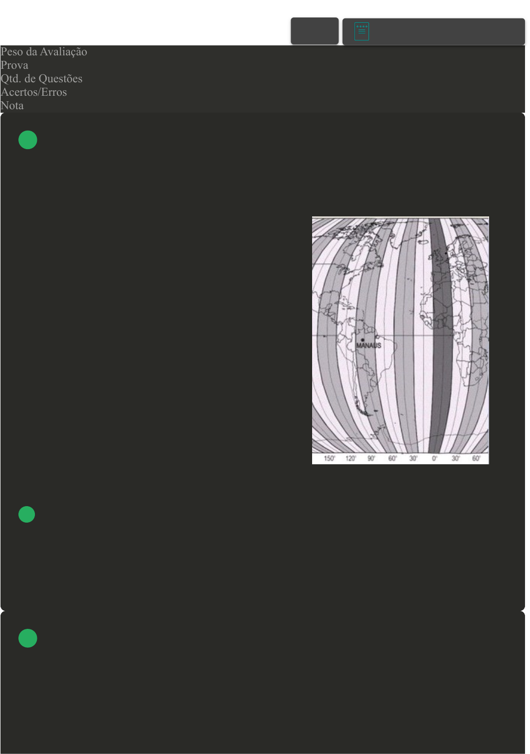 22/08/2023, 14:31 Avaliação II - Individual about:blank 1/6 Prova Impressa GABARITO | Avaliação II - Individual (Cod.:824594) Peso da Avaliação 1,50 Prova 60568405 Qtd. de Questões 10 Acertos/Erros 10/0 Nota 10,00 A medição dos diferentes horários do mundo é dada pelos fusos horários que são separados de 15 em 15 graus. As cidades localizadas a leste sempre estarão com horas adiantadas em relação às cidades que se localizam a oeste. Sabendo disso, um ponto B, localizado no continente Africano, no fuso horário de 30° a leste, são 15 horas. Que horas serão em Manaus, situado a oeste, no fuso horário de 60°? A imagem a seguir pode auxiliá-lo. FONTE: Rachacuca. Adaptado de: . Acesso em: 30 set. 2014. A Em Manaus serão 8 horas. B Em Manaus serão 9 horas. C Em Manaus serão 12 horas. D Em Manaus serão 21 horas. A Carta Internacional do Mundo ao Milionésimo - CIM - fornece subsídios para a execução de estudos e análises de aspectos gerais e estratégicos, em nível continental. Sobre a CIM, analise as sentenças a seguir: I- A Carta é uma representação de toda a superfície terrestre na escala de 1:1.000.000 (motivo da origem do termo milionésimo). II- A Carta fornece uma base através da qual podem ser elaborados mapas temáticos de várias ordens, tais como: recursos naturais, população, solo, geologia etc. VOLTAR A+ Alterar modo de visualização 1 2 22/08/2023, 14:31 Avaliação II - Individual about:blank 2/6 III- A Carta Internacional do Mundo ao Milionésimo é padronizada, e a distribuição geográfica de cada folha deve possuir 6 graus de latitude por 4 graus de longitude. IV- A Carta é uma representação de toda a superfície terrestre, na projeção cônica. Assinale a alternativa CORRETA: A As sentenças II e III estão corretas. B As sentenças I, II e III estão corretas. C As sentenças I, II e IV estão corretas. D As sentenças I, III e IV estão corretas. Ao elaborar um mapa, é necessário optar por uma projeção cartográfica. Algumas projeções beneficiam a projeção com pouca deformação de certas áreas do globo e distorcem outras áreas. A imagem a seguir representa uma das projeções cartográficas, sendo mais utilizada para representar países que estão em latitudes médias. Neste contexto, qual é o tipo de projeção cartográfica representada na imagem? FONTE DA IMAGEM: Disponível em: . Acesso em: 30 set. 2014. A Cilíndrica. B Cônica. C Plana. D Quadrada. O ensino da cartografia pode andar com o ensino geográfico, visto que os mapas temáticos são um grande aliado em vários assuntos lecionados no ensino básico. Para tal, os alunos também devem receber uma alfabetização cartográfica para que consigam interpretar um mapa. Sobre o ensino da cartografia em sala de aula, classifique V para as sentenças verdadeiras e F para as falsas: ( ) A linguagem cartográfica em sala de aula pode ser inserida pela utilização de mapas, maquetes, cartas, plantas, globo terrestre e croquis. ( ) As projeções cartográficas são um assunto muito complexo e não há uma metodologia diferenciada para tratá-lo em sala de aula, assim o professor deverá utilizar somente o livro didático. ( ) Um desenho feito por um aluno sobre algum ambiente que ele conhece bem, como seu quarto ou sala de aula, pode auxiliar o aluno no entendimento de alguns conceitos cartográficos, como a escala. ( ) O globo terrestre pode ser utilizado pelo professor para explicar os movimentos do planeta Terra (rotação e translação), as diferenças entre os horários no mundo e as direções norte, sul, leste e oeste. 3 4 22/08/2023, 14:31 Avaliação II - Individual about:blank 3/6 Assinale a alternativa que apresenta a sequência CORRETA: A V - F - F - V. B F - V - V - F. C V - V - F - V. D V - F - V - V. A palavra mapa teve origem na Idade Média, mas, a partir do século XIV, as representações cartográficas passaram a ser classificadas em cartas, plantas e mapas. Cada uma dessas representações tem suas especificidades e utilidade, sendo que o professor de geografia tem a função de explicar em aula as características de cada uma delas. Sobre o assunto, associe os itens, utilizando o código a seguir: I- Mapa. II- Escala. III- Planta. IV- Carta. ( ) Utiliza grande escala e representa uma pequena área da superfície terrestre, porém com maior detalhe do terreno. Pode representar um quarteirão, um condomínio ou uma praça de uma cidade, por exemplo. ( ) Utiliza escala média ou grande e sua folha é delimitada pelas linhas convencionais (paralelos e meridianos), pode abranger objetivos diversos. ( ) Pode ser uma representação temática de algum fenômeno geográfico ou, também, pode demonstrar divisões territoriais a nível mundial, regional e/ou local. ( ) Pode ser gráfica ou numérica e demonstra a redução das medidas reais da superfície terrestre representada no mapa. Assinale a alternativa que apresenta a sequência CORRETA: A I - III - IV - II. B III - IV - I - II. C II - IV - I - III. D III - I - IV - II. Carta topográfica é a representação, em escala, sobre um plano dos acidentes naturais e artificiais da superfície terrestre de forma mensurável, mostrando suas posições planimétricas e altimétricas. Sobre a cartografia topográfica, classifique V para as sentenças verdadeiras e F para as falsas: ( ) As cartas topográficas reproduzem de forma gráfica planimétricas (vias e obras) e altimétricas (relevo e curvas de nível). ( ) A Cartografia temática consiste em mapas, em qualquer escala, direcionadas a representar o relevo terrestre. 5 6 22/08/2023, 14:31 Avaliação II - Individual about:blank 4/6 ( ) A Cartografia Topográfica tem como objetivo transformar dados e fotografias obtidos pelos levantamentos de campo, bem como fotografias aéreas, em cartas topográficas. ( ) A Cartografia Topográfica, apesar de muito conhecida, é pouco usada, devido à sua escassa utilidade. Assinale a alternativa que apresenta a 
