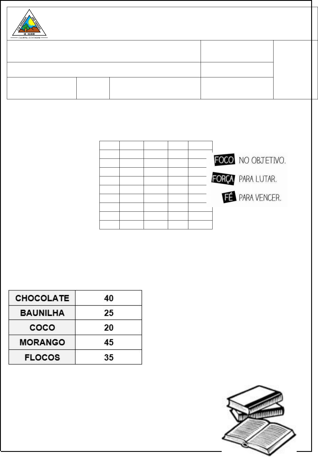 ESCOLA MUNICIPAL VEREADOR JOSÉ FERREIRA DE AGUIAR PROFESSORA: 2ª AVALIAÇÃO TRIMESTRAL DE MATEMÁTICA PEDAGOGA ESTUDANTE: TURMA: ANO 5º CICLO:2º SEGMENTO: FUNDAMENTAL DATA: / /2023 PRESTE MUITA ATENÇAO NA HORA DE MARCAR O GABARITO, RESOLVA TODAS AS QUESTÕES E SÓ DEPOIS MARQUE-AS NO GABARITO: 1 A B C D 2 A B C D 3 A B C D 4 A B C D 5 A B C D 6 A B C D 7 A B C D 8 A B C D 9 A B C D 10 A B C D 1. A tabela abaixo mostra os sabores preferidos de sorvete entre algumas crianças do bairro em que Miguel mora. O sabor preferido e o menos preferido entre as crianças são, respectivamente, a) coco e morango. b) chocolate e baunilha. c) morango e coco. d) chocolate e morango. 2. Os livros de Mateus pesam 3,5 Kg. Quantos gramas os livros de Mateus pesam? a) 3,5g. b) 35g. c) 350g. d) 3500g. 3. A professora de Aline fez um retângulo e o dividiu em 10 quadradinhos e pintou alguns de cinza. Qual das frações abaixo representa a parte pintada em relação ao total de quadradinhos desse desenho? 4. Observe a multiplicação abaixo. O resultado dessa multiplicação é a) 1.295 b) 1.205 c) 1.305 d) 1.395 5. Observe o gráfico abaixo, ele apresenta as notas de alguns alunos do 5° ano. Qual aluno tirou nota 5? a) Milena. b) Carlos. c) Carol. d) Ana. 6. O relógio abaixo mostra o horário que Gabriel vai para o trabalho. Sabendo que Gabriel passa 4 horas no trabalho. Que horas o relógio marcará quando ele sair? a) 8h. b) 8h e 12m. c) 12h e 8 m. d) 12h. 7. Victor ganhou uma nota de R$ 5,00 de seu avô e resolveu trocá-las por moedas de R$ 0,25 para colocar em seu cofre. Quantas moedas ele recebeu? a) 10 b) 15 c) 20 d) 25 8. Observe o cubo abaixo. Marque a alternativa que apresenta uma possível planificação desse cubo. 9. Um litro de água deu para encher os 5 copos abaixo. Qual a medida de capacidade de cada copo? a) 150 ml. b) 200 ml. c) 250 ml. d) 300 ml. 10. Jonas é dono de uma sorveteria. Em uma semana, ele vendeu 230 sorvetes, sendo 86 eram de chocolate e 74 de baunilha e o resto de morango. Quantos sorvetes de morango Jonas vendeu? a) 70 b) 74 c) 80 d) 86