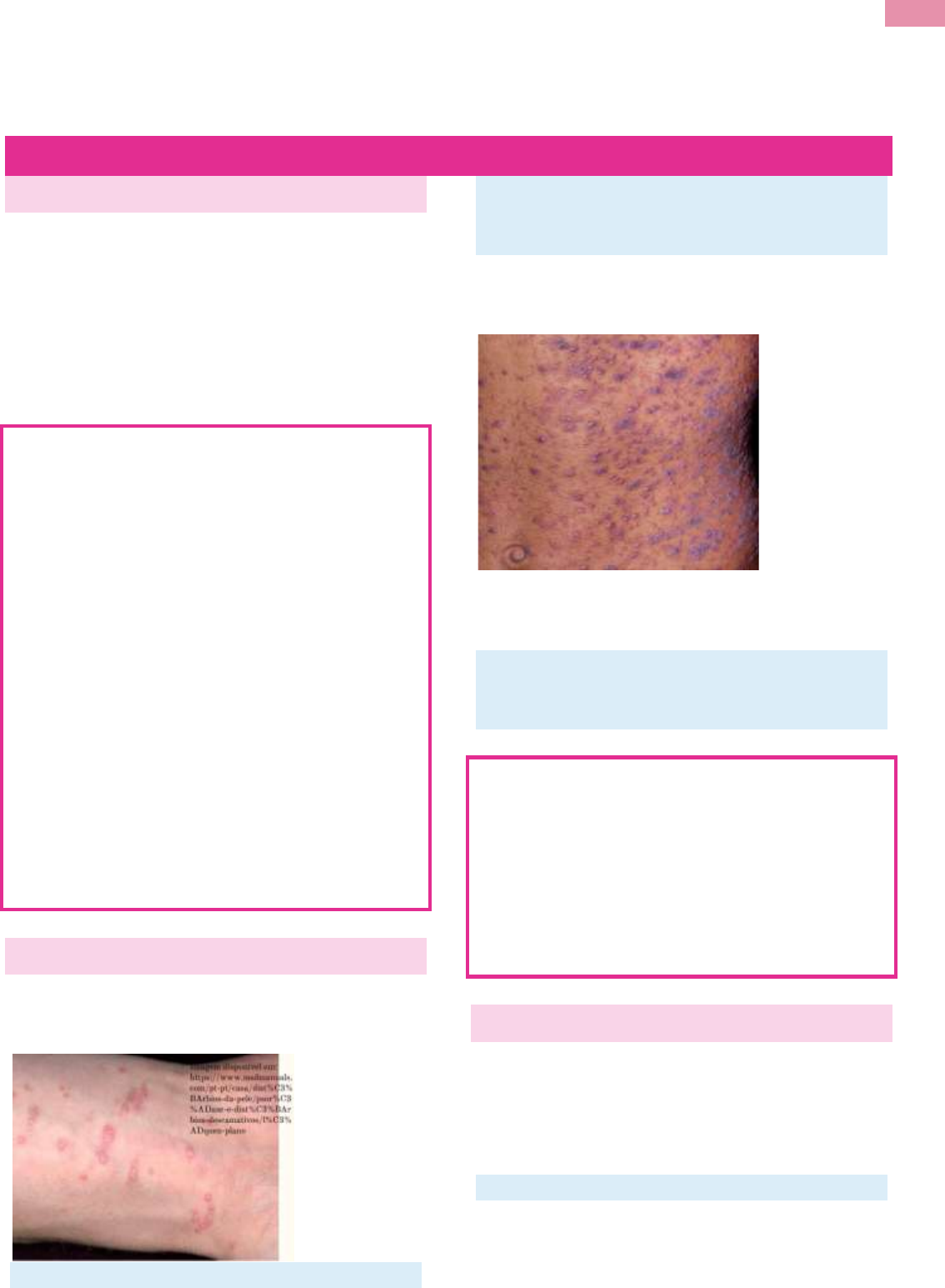 1 Laís Flauzino | DERMATOLOGIA | 8°P Líquen 3M1 – LÍQUEN PLANO DEFINIÇÃO E IMUNOLOGIA: • Doença inflamatória crônica que acomete pele, mucosas, pelos e unhas. • Resposta imunológica celular a alteração antigênica induzida. • Mediada por linfócitos T aos queratinócitos da membrana basal. • Causa desconhecida. Líquen: usado para dermatoses muito diferentes entre si. Líquen plano é uma doença inflamatória crônica que compromete a pele, mucosas, unhas, pelos e raramente o conduto auditivo. Representa uma resposta imunológica celular a uma alteração antigênica induzida na pele, mucosa ou anexos – causa ainda desconhecida. Imunologia: Reação imunológica mediada por linfócitos T dirigida aos queratinócitos da membrana basal. A imunofluorescência direta demonstra positividade para fibrina na junção dermoepidérmica - O depósito de fibrina, isoladamente, é suficiente como critério diagnóstico de líquen plano. QUADRO CLÍNICO: Lesão elementar Pápulas eritematosas, brilhantes, distribuídas em punho. Lesões elevadas, sólidas sem líquido. A lesão linear pode ter sido um arranhão/lesão nessa região que precedeu o líquen. Prurido variável, evoluem com estriação acinzentada típica (estrias de Wickham). Pápulas violáceas acinzentadas, múltiplas com estriação acinzentada, distribuída difusamente em região abdominal. Estriação – aspecto de rede, rendilhado são as estrias de Wickham – bem característico de líquen. Manifestações clínicas: Lesão elementar: pápula dermoepidérmica, poligonal, brilhante, de coloração inicialmente rósea, que se torna violácea quando passa a apresentar fina estriação acinzentada típica (estrias de Wickham). Sintomatologia frequente é o prurido de intensidade variável. FORMAS CLÍNICAS: Líquen Agudo: Pouco frequente, com aparecimento abrupto e explosivo de lesões polimorfas disseminadas pelo tronco e membros, associado a prurido intenso. Polimorfas – pápula, mácula Pode haver o comprometimento do estado geral, como astenia e febre. Em pouco dias a febre cessa e as lesões assumem o aspecto típico. 2 Laís Flauzino | DERMATOLOGIA | 8°P É praticamente uma eritrodermia, faz diagnóstico diferencial com várias outras coisas, mas entra o quadro de ser muito pruriginosa associada a febre. Mas precisa mesmo de biopsia. As lesões aparecem abruptamente, são disseminadas e polimorfas com pápulas psoriasiformes, lesões urticadas e, eventualmente, bolhas que são consequência do aumento exagerado da fenda subepidérmica (espaço de Max Joseph). Líquen plano actínico: Lesões que aparecem em áreas fotoexpostas – pescoço, face, MMSS, colo do decote. O termo actiníco está relacionado a dano solar. Lesão: máculo castanho acinzentada no nariz. Lesões ocorrem exclusivamente nas regiões expostas à radiação solar, principalmente a fronte, MMSS e dorso das mãos. Placas anulares, com bordos discretamente elevados e centro hiperpigmentado. Duas outras apresentações clínicas foram descritas: • Pigmentada – é semelhante ao Melasma • Discrômica – se apresenta sob a forma de pápulas achatadas, esbranquiçadas que se agrupam e formam placas. Prurido ausente ou discreto. Incide mais em crianças e adultos jovens. Comprometimento de unhas e couro cabeludo, bem como o fenômeno do isomorfismo está ausente. Líquen plano anular: Borda elevada fazendo formato de anel – centro mais atrófico. Aparece mais em mucosa. Resulta de pápulas dispostas em anel ou de uma evolução centrífuga de uma pápula com bordo ativo e centro tendendo à involução. Mais frequentes no pênis e escroto. Quando regridem, deixam lesão residual pigmentada ou atrófica. 3 Laís Flauzino | DERMATOLOGIA | 8°P Líquen plano atrófico: Lesões tem atrofia no centro e borda papulosa (mais elevada) É resultado da resolução do LP hipertrófico localizado principalmente nos membros inferiores ou das lesões anulares penianas e escrotais. Eventualmente, um líquen plano agudo desenvolve lesões anulares e estas, por sua vez, evolvem com atrofia central. Liquen plano bolhoso Sobre as pápulas típicas de LP, de longa duração, aparecem vesículas – estas não comprometem a pele normal, o que permite o diagnóstico diferencial com LP penfigoide. A bolha ocorre pela ampla separação dermoepidérmica em consequência do denso processo inflamatório linfocitário. Lesões associadas a bolhas Liquen plano folicular Uma das causas de alopecia. Lesões atróficas cicatriciais – não nasce mais pelo O comprometimento folicular no couro cabeludo leva a um quadro de atrofia cicatricial – mais frequente em mulheres. Pode se manifestar como alopecia extensa sem atrofia perceptível. Liquen plano hipertrófico (mais comum em MMII – forma mais pruriginosa) 4 Laís Flauzino | DERMATOLOGIA | 8°P Pápulas e nódulos ceratoticos, lesões verrucosas. Entra como diagnóstico diferencial das micoses profundas – paracococidiomicose, criptococose, leishmaniose tegumentar. Tem que fazer biopsia para tratamento adequado. Após um surto da doença, desenvolve-se nos MMII – regiões pré-tibiais e tornozelos. Lesões papuloceratósicas, as vezes formando placas verrucosas. É a variante mais pruriginosa. Ao regredir pode deixar uma sequela atrofia ou hiperpigmenaçao. Líquen plano mucoso: Aspecto rendilhado. Estrias atróficas. Aspecto de rede. As lesões podem ser de 3 tipos: reticulada, erosiva ou atrófica. Líquen plano pigmentoso (3-4 décadas de vida). Mais comum em face e pescoço. Máculas acastanhadas – indivíduos de fototipo mais alto. Tem superfície mais rugosa. Diagnóstico diferencial de Melasma. Face e pescoço são os locais mais afetados. As lesões são simétricas, predominando nas áreas expostas, na região pré-auricular, nas têmporas e na região frontal. A coloração varia do cinza claro ou marrom escuro. Inicia-se como pequenas lesões maldefinidas que confluem formando grandes ár