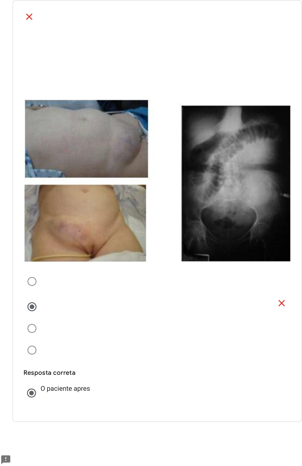 0/30 O paciente apresenta ruídos hidroaéreos aumentados e abaulamento doloroso à palpação em região inguinal direita O paciente apresenta ruídos hidroaéreos diminuídos e abaulamento doloroso à palpação em região inguinal direita O paciente tem provável diagnóstico de apendicite devido quadro clínico típico. O paciente não deve apresentar alterações nos ruídos hidroaéreos, mas apenas abaulamento doloroso à palpação em região inguinal direita. Resposta correta O paciente apresenta ruídos hidroaéreos aumentados e abaulamento doloroso à palpação em região inguinal direita Mulher de 65 anos deu entrada no pronto-socorro com queixa de dor abdominal intensa, vômitos fecalóides e abaulamento doloroso em região inguinal direita, que surgiu de forma súbita e evoluiu com hiperemia local, conforme ilustrado na figura. O exame físico mostra distensão abdominal e abaulamento em região inguinocrural. Toque retal: ampola vazia. Qual é a afirmação correta, a respeito deste caso, neste momento da doença? * 30/30 Cordão posterior Cerebelo Labirinto direito Labirinto esquerdo Feedback Na prática clínica, a análise do desvio da marcha fornece uma medida objetiva para identi�car a disfunção no sistema vestibular e é realizada rotineiramente pela aplicação do teste de caminhada de Babinski-Weill ou estrela. Neste teste, o paciente é solicitado a dar um passo repetidamente para frente e depois para trás dentro de um espaço delimitado por um círculo, de 5 a 10 vezes, mantendo os olhos fechados. A marcha em estrela é o resultado da assimetria postural que causa desvio para o lado ipsilateral à lesão durante os passos para frente e para o lado contralateral durante os passos para trás. Esses desvios, quando reunidos em tentativas sucessivas, traçam uma forma de estrela. Espera-se em indivíduos saudáveis que não ocorra desvio da marcha. No caso de lesão vestibular unilateral, o tônus muscular será assimétrico, provocando desvio da marcha para o lado lesado, descrevendo uma marcha em estrela. Martins CR, França MC, Nucci A, Martinez ARM, Faber I. Semiologia Neurológica Unicamp: Thieme Revinter; 2017. Campbell WW. DeJong's The Neurologic Examination: Wolters Kluwer Health; 2012 HLM, 64 anos, relata episódios de tontura e quando anda parece ter algo “o empurrando” para a direita. Ao realizar a marcha de Babinski- Weil, que consiste em realizar 03 passos para frente e 03 passos para trás, várias vezes, o paciente apresentou rotação para a direita. Dessa forma, onde está a lesão? * 0/30 Ocorreu aumento da pressão hidrostática no intravascular Ocorreu aumento da pressão oncótica do interstício Ocorreu aumento da pressão hidrostática do interstício Ocorreu redução da pressão oncótica no intravascular Resposta correta Ocorreu aumento da pressão oncótica do interstício Homem, 48 anos, está em seguimento clínico com endocrinologista por hipotireoidismo. Infelizmente não faz o tratamento de maneira adequada e médica nota a alteração abaixo ao exame físico. À palpação o edema é duro e com temperatura habitual da pele. Levando em consideração a fisiopatologia da alteração apresentada, escolha alternativa correta * 0/30 Diástase de reto abdominal Hérnia umbilical Hérnia incisional Hérnia encarcerada Resposta correta Diástase de reto abdominal Feedback Não se trata de hérnia umbilical pois nada se encontra na descrição do umbigo. Não há cicatrizes no abdômen do caso em questão Não há no caso da questão abaulamento abdominal no repouso ao exame físico, logo não é provável que seja encarcerada. Paciente feminina de 29 anos, sem doenças prévias, com duas gestações anteriores, ambas de parto vaginal, queixa-se de abaulamento abdominal aos esforços, sem alteração do trânsito intestinal, sem febre, há 02 anos. Ao exame: Abdômen plano sem abaulamento a inspeção estática, sem alterações na cicatriz umbilical. À manobra de valsalva nota-se abaulamento mediano supraumbilical de 8,0 cm de extensão. Ruídos hidroaéreos normais em timbre e frequência. À palpação da cicatriz umbilical não há alterações. Qual o diagnóstico mais provável? * 30/30 A falta de dados a respeito da situação vacinal do paciente não interfere nem na elaboração das hipóteses diagnósticas nas síndromes exantemáticas e nem nas suas evoluções clínicas. O exantema e a febre não possuem relação, devendo o médico elaborar duas hipóteses diagnósticas diferentes. O fato de a febre ter desaparecido logo antes do surgimento do exantema é importante na elaboração da hipótese diagnóstica. A foto mostra um exantema vesicular com pústulas claramente visíveis. Feedback individual Correto. A relação temporal entre a febre e o exantema é uma informação fundamental a ser explorada na anamnese para elaboração da hipótese diagnóstica. Lactente de 6 meses vem a consulta médica com queixa de febre de 39 graus há 4 dias, persistente, associada com irritabilidade e choro intenso noturno. Nega outros sintomas associados e não havia sinais claros de localização de foco infeccioso. Há 1 dia, a febre cedeu e a mãe notou surgimento de lesões róseas espalhadas no tronco do bebê (vide figura abaixo). A respeito dos exantemas em pediatria, assinale a alternativa correta: * 30/30 O diagnóstico sindrômico é de síndrome pulmonar parenquimatosa pois há sinais claros de pneumonia. O paciente pode ser tratado ambulatorialmente pois não há sinais clínicos indicativos de internação hospitalar. O dado da recorrência no exame físico sugere a possibilidade de imunode�ciência devido às pneumonias de repetição. O quadro clínico sugere uma síndrome brônquica com obstrução ao �uxo de ar levando aos sinais de insu�ciência respiratória. Feedback individual Correto. A história de recorrência e os achados do exame físico são típicos da asma, que é a principal síndrome brônquica em p
