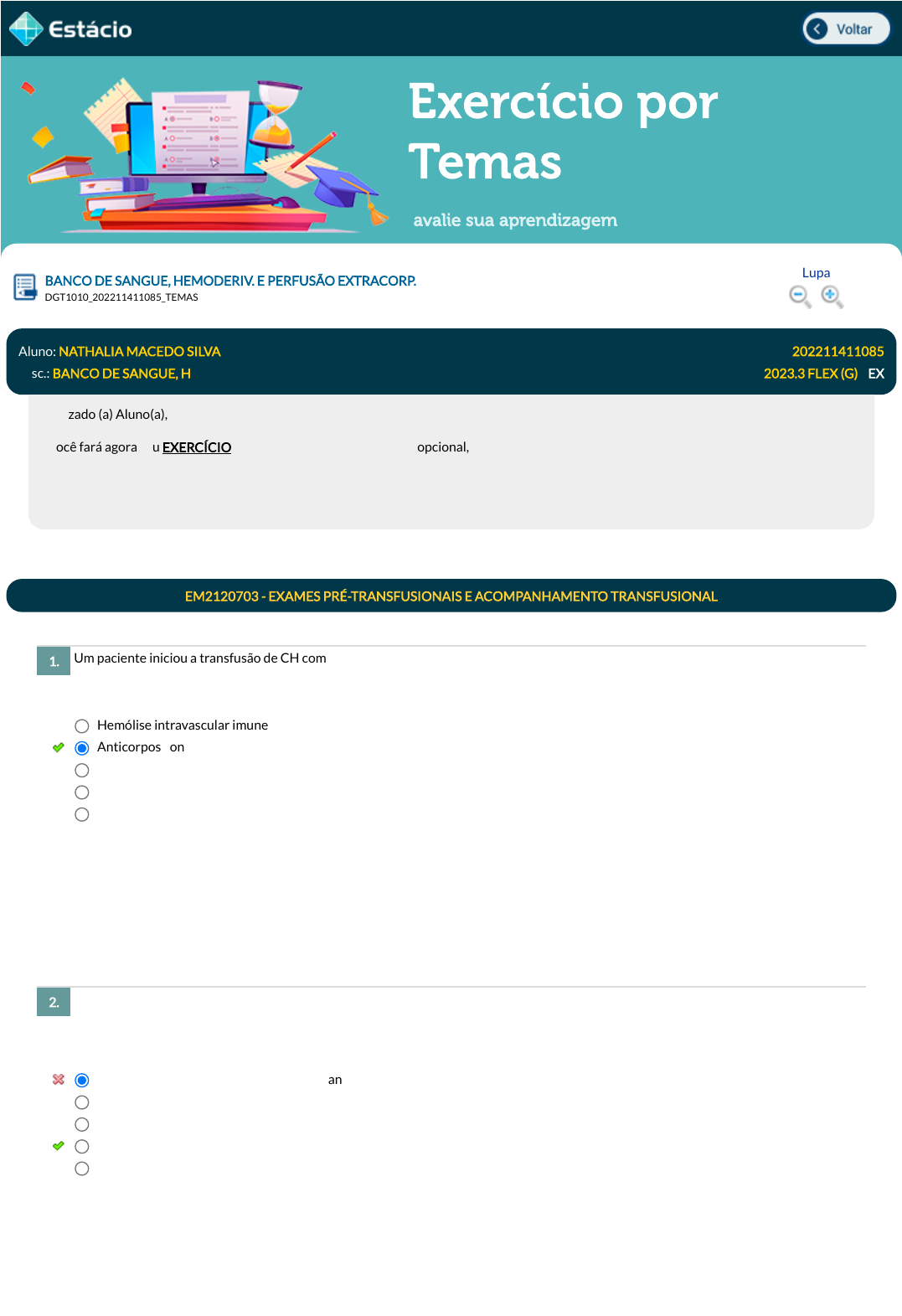 23/08/2023 21:23 Estácio: Alunos https://simulado.estacio.br/alunos/ 1/5 Exercício por Temas avalie sua aprendizagem Um paciente iniciou a transfusão de CH com temperatura de 36 °C, apresentando, após 20 minutos de transfusão, temperatura de 37,5 °C, sem calafrios, sensação de frio e desconforto, mas sem outros motivos associados. O médico assistente suspeitou que o paciente estava sofrendo uma reação febril não hemolítica transfusional (RFNH). Qual é a etiologia que está, mais provavelmente, associada? (Defensoria Pública do Estado do Rio Grande do Sul (DPE-RS) - Farmacêutico (FCC /2017) Um indivíduo apresentou perda de consciência e hipotensão arterial com necessidade de reposição volêmica, após duas horas da doação de sangue em um hospital público. O quadro pode ter correlação com a doação? BANCO DE SANGUE, HEMODERIV. E PERFUSÃO EXTRACORP. Lupa DGT1010_202211411085_TEMAS Aluno: NATHALIA MACEDO SILVA Matr.: 202211411085 Disc.: BANCO DE SANGUE, H 2023.3 FLEX (G) / EX Prezado (a) Aluno(a), Você fará agora seu EXERCÍCIO! Lembre-se que este exercício é opcional, mas não valerá ponto para sua avaliação. O mesmo será composto de questões de múltipla escolha. Após responde cada questão, você terá acesso ao gabarito comentado e/ou à explicação da mesma. Aproveite para se familiarizar com este modelo de questões que será usado na sua AV e AVS. EM2120703 - EXAMES PRÉ-TRANSFUSIONAIS E ACOMPANHAMENTO TRANSFUSIONAL 1. Hemólise intravascular imune Anticorpos contra antígenos leucocitários Proteínas plasmáticas Hemólise extravascular imune Anticorpos plaquetários Data Resp.: 23/08/2023 21:22:46 Explicação: A resposta certa é: Anticorpos contra antígenos leucocitários 2. Não, pois a reação adversa à doação de sangue se limita à dor no local da venopunção. Sim, mas a correlação de�nitiva será impossibilitada por falta de vínculo temporal. Não, pois as reações adversas ocorrem dentro do prazo de 30 minutos pós-doação. Sim, a correlação poderá ser con�rmada como reação adversa à doação. Não, pois as investigações de tal correlação são sempre inconclusivas. Data Resp.: 23/08/2023 21:22:51 Explicação: A resposta certa é: Sim, a correlação poderá ser con�rmada como reação adversa à doação. javascript:voltar(); javascript:voltar(); javascript:diminui(); javascript:aumenta(); 23/08/2023 21:23 Estácio: Alunos https://simulado.estacio.br/alunos/ 2/5 Durante o plantão em um hospital de emergência, foi solicitada ao plantonista, pelo médico hemoterapeuta, uma transfusão de plasma em caráter de urgência. Para a transfusão, foi selecionada uma bolsa AB. Sobre a conduta do plantonista, podemos a�rmar que: ''No Brasil existem inúmeros dados relativos ao estudo dos fenótipos eritrocitários na população indígena, em especial quanto aos sistemas ABO e Rh. Entretanto, Salzano, em 1971, já referia que as informações relativas ao polimor�smo eritrocitário na população brasileira eram insatisfatórias, tanto em número como em qualidade, e indicava a necessidade da realização de outras pesquisas, inclusive para o sistema ABO e Rh. Desde então, vários trabalhos têm sido publicados a nível nacional quanto aos sistemas de grupos sanguíneos ABO, Rh e MNS. Para outros sistemas de grupos sanguíneos, tais como Kell, Kidd, Duffy, Lewis, Lutheran e P, as informações são escassas, sendo poucos os trabalhos com número signi�cativo de indivíduos estudados com metodologia clara e precisa.'' fONTE: Novaretti, M. C. Z.; Dorlhiac-Llacer, P. E.; CHAMONE, D. A. F. Estudo de grupos sanguíneos em doadores de sangue caucasoides e negroides na cidade de São Paulo. In: Rev. bras. hematol. hemoter., 2000, 22(1):23-32. De todos os antígenos eritrocitários, sem dúvida, os mais importantes para a medicina transfusional são os antígenos ABO e Rh. Em relação, aos antígenos ABO, a diferença entre eles está em enzimas glicosiltransferases que modi�cam uma substância precursora ''H'' na superfície das hemácias, adicionando açúcares especí�cos e transformando o antígeno H em antígenos A ou B, a depender dos genes herdados. Em pessoas do grupo A, qual é a enzima responsável por essa especi�cidade? Durante o plantão no banco de sangue, um pro�ssional recebeu um pedido de transfusão de CH de um paciente que tem histórico de um anticorpo anti-K. Durante a pesquisa de anticorpos irregulares, foram utilizadas as hemácias I e II, com os fenótipos descritos a seguir: Como resultado, o pro�ssional encontrou a hemácia I negativa e a hemácia II positiva. Em relação a esses resultados, o pro�ssional deveria tomar algumas atitudes. A seguir, são listadas algumas condutas a serem analisadas: I. Esse resultado con�rma o anticorpo anti-k, não sendo necessário qualquer teste adicional; II. O PAI é um teste de triagem, sendo necessário um teste de identi�cação para descobrir qual é o anticorpo irregular. III. O anticorpo detectado durante a triagem essa triagem não é o anti-K, podendo ser, por exemplo, um anti-E ou anti-c. Está correto o que se a�rma em: 3. Foi errada, pois ele deveria ter selecionado um plasma A para a transfusão. Foi errada, pois ele só poderia transfundir plasmas com grupo sanguíneo compatível. Foi errada, pois ele deveria ter selecionado um plasma O para a transfusão. Foi certa, pois nas transfusões de plasma não precisamos seguir a classi�cação sanguínea. Foi certa, pois o plasma AB não apresenta anticorpos Anti-A e Anti-B. Data Resp.: 23/08/2023 21:22:57 Explicação: A resposta certa é: Foi certa, pois o plasma AB não apresenta anticorpos Anti-A e Anti-B. 4. Galactose L-Fucosil transferase D-Galactosil transferase N-acetil galactosamil transferase + Galactosil transferase N-acetil-galactosaminil transfrase Data Resp.: 23/08/2023 21:23:01 Explicação: A resposta certa é: N-acetil-galactosaminil transfrase 5. I II 23/08/202