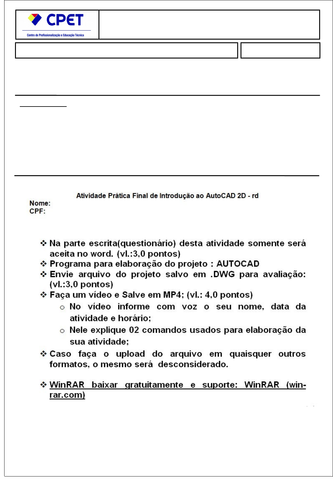 Introdução ao AutoCAD 2D - rd Aluno(a): Data: Atividade Prática Final INSTRUÇÕES: · Esta Atividade contém 1 questão totalizando 10 (dez) pontos; · Você deve preencher dos dados no Cabeçalho para sua identificação: · Nome / Data de entrega. · As respostas devem ser digitadas abaixo de cada pergunta; · Ao terminar salve o arquivo no formato Word parte escrita – projeto em .DWG e vídeo em MP4; · Caso faça o upload do arquivo em quaisquer outros formatos, o mesmo será desconsiderado · Envio o arquivo pelo sistema no local indicado; · Em caso de dúvidas consulte o seu Tutor. 1 – Model(space) – é um espaço inicial o espaço aonde os desenhos são criados sempre em escalas real e o Paper Space(Espaço de Impressão) -onde são criados layouts para apresentação de desenho. 2 – Para ocultar a guia devemos clicar na guia camada . 4 – Na Guia Seleção , em visualização , selecionamos ou desmarcamos o tipo de visualização do comando. 5 – E.ERASE – apaga uma entidade ou um grupo de entidades selecionadas. 6- New Layer (Nova Layer -Cria uma camada com um nome padrão que você pode mudar imediatamente. New Layer Frozen VP In All Viewports - Cria uma camada e congela em todas as visualizações de layout existentes. Delete Layer - Exclui as camadas selecionadas. As seguintes camadas não podem ser excluídas: Set Current - Define a camada selecionada como a camada atual Layer List - Modifica as propriedades da camada usando a lista de camadas. Name -Exibe o nome da camada ou filtro On -Liga e desliga as camadas selecionadas. Quando uma camada está ativada, é visível e disponível para plotar. Quando uma camada está desligada, é invisível e não é plotada, mesmo que a configuração na coluna Plot esteja ativada. Freeze -Congele as camadas selecionadas. Lock - Bloqueia e desbloqueia as camadas selecionadas. Color - Exibe a caixa de diálogo Selecionar cor, onde você pode especificar uma cor para as camadas selecionadas. Linetype -Exibe a caixa de diálogo Selecionar tipo de linha, onde você pode especificar um tipo de linha para as camadas selecionadas. Lineweight -Exibe a caixa de diálogo Lineweight, onde você pode especificar um lineweight para as camadas selecionadas. Transparency -Exibe a caixa de diálogo Transparência, onde você pode especificar uma transparência para as camadas selecionadas. Plot Style - Exibe a caixa de diálogo Selecionar estilo de traçado onde você pode alterar o estilo de plotagem para as camadas selecionadas. Plot -Controla se as camadas selecionadas são plotadas. Se você desligar o enredo para uma camada, os objetos nessa camada ainda são exibidos. New VP Freeze -Congele camadas selecionadas em novas visualizações de layout. Por exemplo, o congelamento da camada DIMENSIONS em todas as novas viewports restringe a exibição de dimensões em todas as visualizações de layout recém-criadas, mas não afeta a camada DIMENSIONS em viewports existentes . VP Freeze -Congelar as camadas selecionadas apenas na viewport de layout atual. Se uma camada já estiver congelada ou desligada no desenho, você não pode descongelar a camada na viewport de layout atual. VP Color -Define uma substituição para a cor associada à camada selecionada para a viewport de layout atual. VP Linetype -Define uma substituição para o tipo de linha associado à camada selecionada para a viewport de layout atual. VP Lineweight - Define uma substituição para o peso da linha associado à camada selecionada para a viewport de layout atual. VP Transparency -Define uma substituição para a transparência associada à camada selecionada para a viewport de layout atual VP Plot Style - Define uma substituição para o estilo de plotagem associado à camada selecionada para a viewport de layout atua Description - Descreve a camada ou o filtro de camada Atividade Prática Atividade Prática