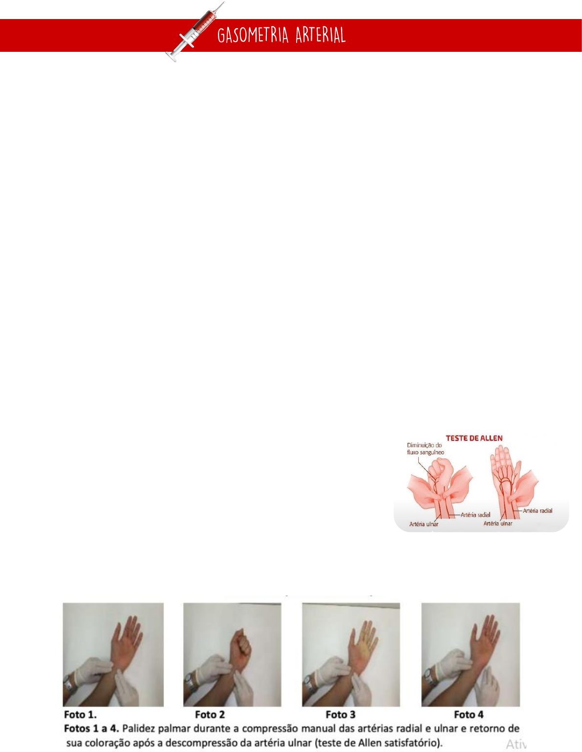 AVALIAÇÃO DOS GASES NA CORRENTE SANGUINEA Pacientes críticos / graves necessitam de mais atenção pH neutro → compatível com a vida, manter o equilíbrio ácido básico para manter homeostase A identificação do distúrbio ácido base é importante no diagnostico da causa da alteração e na determinação do tratamento apropriado, portanto o conhecimento dos princípios fisiopatológicos e o uso de ferramentas diagnósticas simples são fundamentais para propor medidas terapêuticas a serem adotadas. A análise dos gases sanguíneos é utilizada para identificação do distúrbio o equilíbrio ácido básico, e do grau de compensação que aconteceu. Essa analise se baseia na amostra de SANGUE ARTERIAL (rico em O2) Resultados: fornecem informações sobre a ventilação alveolar, oxigenação e equilíbrio ácido base Gasometria arterial é uma determinação quantitativa do potencial hidrogeniônico (pH) e dos gases sanguíneos arteriais a partir de certos parâmetros e cálculos específicos Aparelho de gasometria mede o pH e os gases sanguíneos sob a forma de pressão parcial de oxigênio (PaO2 ou pO2) e pressão parcial de dióxido de carbono (PaCO2 ou pCO2), ao passo que os demais parâmetros são calculados A analise revela- o estado ácido básico e a adequação da ventilação e oxigenação Quanto mais rápido a analise mais fidedigno o resultado, pois o tempo pode dispersar gases da amostra Realizar teste de Allen antes de puncionar a artéria radial do paciente. Teste De Allen Garante a segurança para a realização de um acesso arterial no antebraço do paciente Realização: - aplique a pressão tanto na arterial ulnar, quanto na radial, da mão selecionada - os dedos da mão devem ficar pálidos e esmaecidos, indicando falta de fluxo sanguíneo arterial (cianose) -libere a pressão sobre a artéria ulnar e observe retorno da coloração dos dedos e nas mãos, o que indica que existe circulação adequada para a mão e para os tecidos através da artéria ulnar -o teste garante que paciente terá fluxo sanguíneo adequado da artéria ulnar para a mão caso a artéria radial seja lesionada ou complicação - quando a coloração não retorna, NÃO realize a punção da artéria radial naquele braço -teste rápido e simples, pode ser feito durante palpação dos pulsos. Uso do sangue arterial ➜ O sangue arterial proporciona melhor maneira para coletar a amostra de uma mistura de sangue de varias regiões do corpo ➜ As medições do sangue arterial indicam quão bem os pulmões estão oxigenando o sangue, se tem trabalho satisfatório (pO2 alta ) ou insatisfatório (pO2 baixa) ➜ As amostras arteriais fornecem informações sobre a capacidade dos pulmões para regular o equilíbrio ácido básico pela retenção ou liberação de CO2 As amostras podem ser coletadas a partir de punções arteriais diretas ou a partir de linhas arteriais de demora já existentes. Procedimento 1. Observar as precauções padrão e seguir protocolos 2. Fazer paciente sentar ou ficar em decúbito dorsal 3. Realizar teste de Allen modificado para avaliar circulação colateral antes de efetuar a punção radial 4. Elevar punho do paciente com um pequeno travesseiro e pedir para estender os dedos para baixo – isso flexiona o punho e posiciona a artéria radial mais próxima da superfície 5. Palpar a artéria e manobrar a mão do paciente para frente e para trás, até percebido pulso satisfatório e separar as estruturas. 6. Limpar região de modo liberal com agente antisséptico 7. Preparar agulha 25x7 em uma seringa a vácuo pré heparinizada (3 ou 5ml), puncionar a artéria e coletar uma amostra de 3 a 5 ml 8. Retirar a agulha e colocar atadura absorvente de 10 x 10 cm sobre o local de punção. 9. Manter pressão sobre o local com dois dedos durante um mínimo de 2 minutos ou até não ter mais sangramentos evidentes. Pode ser necessário uso de curativo compressivo por horas 10. Garantir que todas as bolhas de ar na amostra de sangue sejam expelidas o mais rapidamente possível. O ar na amostra altera os valores da gasometria arterial. Tampar a seringa e girar suavemente para misturar heparina com sangue. 11. Rotular a amostra com nome, numero de id., data, horário, modo de terapia com O2 e velocidade do fluxo 12. Colocar amostra no gelo e caixa térmica e leva-la para laboratório, isso impede alterações nas pressões dos gases decorrentes dos processos metabólicos que continuam depois que o sangue é coletado. IDEAL- COLETAR E JÁ FAZER LEITURA Valores de Referência -O pH plasmático é um indicador de concentração de íon hidrogênio (H+) -Os mecanismos homeostáticos (sistemas tampão renal e pulmonar) mantem o pH dentro de uma: faixa de normalidade→ 7,35 a 7,45 Quanto (H+) ácida pH Quanto (H+) alcalina pH -CONCENTRAÇÃO DE (H+) NO PLASMA SANGUINEO AUMETADA (pH < 7,4) = ACIDEMIA, PODE SER SECUNDÁRIA A ACIDOSE METABÓLICA OU ACIDOSE RESPIRATÓRIA -CONCENTRAÇÃO DE (H+) NO PLASMA SANGUÍNEO DIMINUIDA (pH > 7,4) = ALCALEMIA, PODE SER SECUNDÁRIA A ALCALOSE METABÓLICA OU ALCALOSE RESPIRATÓRIA Para a correra identificação do distúrbio acido base, é fundamental a associação entre o quadro clinico apresentado pelo paciente e os dados obtidos por meio dos exames laboratoriais Quem regula sistema respiratório → pulmão Quem regula sistema metabólico → sistema urinário Avaliação da Gasometria 1- Observar o pH 2- Avaliar PaCO2 e o HCO3 em relação ao pH : OBS→ o objetivo é determinar se os sinais e sintomas clínicos são compatíveis com a analise acidobásica. Além da avaliação dos resultados da gasometria e do exame físico, informações relacionadas à história clinica devem ser coletadas para determinar as causas do distúrbio ácido básico para tratamento assertivo. Analisar resultados isolados de gasometria = Grande chance de erros.