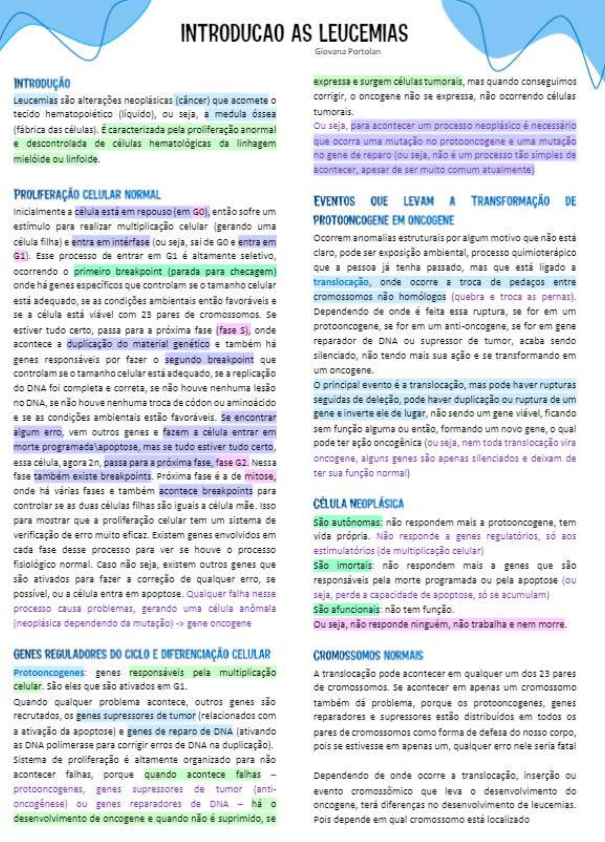 Impresso por cicloclinicomed, E-mail medcicloclinico2023@gmail.com para uso pessoal e privado. Este material pode ser protegido por direitos autorais e não pode ser reproduzido ou repassado para terceiros. 19/08/2023, 00:40:29 É uma proliferação anômala descontrolada que acontece por algum evento que ocorreu na célula progenitora, a qual se diferencia na medula óssea e agora passa a não obedecer a sinais regulatórios nem estimulatórios. Ou seja, acomete uma célula progenitora que passa a se multiplicar indiscriminadamente na fábrica (medula óssea) Uma célula que se multiplica descontroladamente causa um desarranjo na medula óssea e uma displasia (troca do tecido normal por tecido canceroso que está se multiplicando sem regulação). Depois da medula óssea, todas essas células cancerosas migram para o sangue periférico. Qual o problema? Primeiro que vai suprimir a hematopoese normal da medula óssea e depois que, quando estão no sangue periférico, não tem ação nenhuma, muito pelo contrário, elas são células autônomas, imortais e afuncionais, apenas tomando espaço, podendo se alojar em órgãos linfoides secundários (baço, linfonodos, podendo acometer até fígado) Acomete o tecido hematopoiético, então pode causar falha na produção de eritrócitos (gerando anemia) e de plaquetas (sangramento, sem homeostase) além de falha da produção , de leucócitos saudáveis (causando infecções, baixa de imunidade, etc) Como todo câncer, ainda não se tem uma causa exata, mas se acredita que pode haver translocações por: hereditariedade (maior nas leucemias crônicas e menor nas agudas) radiações , ionizantes (como no caso de raio X, por isso os profissionais se paramentam), exposição ocupacional (derivados de benzeno, agrotóxicos, etc), fármacos (cloranfenicol, ciclosfamida, outros quimioterápicos. Ou seja, é comum uma pessoa tratar um câncer sólido com quimioterapia e radioterapia e depois de anos surgir leucemia) 2,3 casos de leucemia a cada 100.000 habitantes por ano Pico entre 40 e 60 anos (>80 é raro) Alguns adultos jovens (20/30 anos) Dita de leucemia dos jovens Normalmente é feito pelo quadro clínico que o paciente apresenta (canseira, palidez, febre recorrente, sangramentos) No hemograma: Citopenias e uma quantidade grande de blastos. Pela OMS: 20% de mieloblastos para fechar diagnóstico de leucemia aguda O normal de células blásticas no sangue periférico é de nenhuma, já na medula é de 1 a 2%. Quando tem 20% já fecha o diagnóstico. Na LMA o evento pode ser em diferentes etapas: podia ser na fase de mieloblasto, monoblasto, proeritroblasto, a qual aparecia em maior número no sangue periférico, devido a multiplicação indiscriminada. FAB ( ): French-American-British Cooperative Group Classification É de fácil compreensão e leva em consideração a morfologia (qual o blasto que está aumentado) Classificou de M0 a M7. . OMS: mais atual (2016), mas não é didática para ensinar . Leva em consideração principalmente seguintes critérios: os morfológico, imunofenotipagem (é a característica imunológica da célula), citoquímica (quase em desuso) e citogenética. Inicialmente, FAB levava em consideração apenas a morfologia dos blastos, mas é um critério muito subjetivo, pois os mielóides são muito parecidos com os linfoides, precursores são semelhantes. Depois usaram a citoquímica para diagnóstico, aliada a morfologia, fazendo colorações específicas para algumas características nessas células e se coravam diferente devido a constituição diferente, por exemplo: um monoblasto tem características diferentes de um mieloblasto, eles são de linhagens diferentes, o primeiro da origem ao monócito e o segundo pode vir a ser um mieloblasto eosinofílico, segmentado ou basofílico. Posteriormente surgiu a imunofenotipagem, a qual identifica em qual fase a célula está (muito específica), com a utilização de anticorpos monoclonais (hoje em dia já sabe o que cada um expressa). A célula progenitora tem uma característica e conforme vai sofrendo ação de citocinas, ela vai se transformando, amadurecendo, adquirindo constituintes na célula, na membrana. Ela fez analogia com uma criança que passa para a adolescência e dá sinais físicos que está mudando de fase, como as espinhas e a voz. Um exemplo: na célula progenitora só tem receptor CD34, depois de sofrer ação de fatores de crescimento e interleucinas, ela já passa a desenvolver o HLa Dr, CD33, CD117, além do CD34, passando a ser um precursor mielóide (diferenciada para linhagem mielóide). Então, usando a imunofenotipagem, visualiza esses CDs, entre outros, e assim descobre em qual fase está, porque já se sabe o que tem em cada fase. Isso tudo é importante porque o tratamento é diferente para cada uma dessas fases. Quanto melhor conseguir precisar onde a leucemia está, melhor conseguimos colocar o alvo terapêutico para ela Na citogenética conseguimos observar qual foi o evento que ocorreu naquele blasto que originou a leucemia. Isso para ter um alvo terapêutico certeiro. Antigamente o tratamento era leucemias mieloides agudas Giovana Portolan Impresso por cicloclinicomed, E-mail medcicloclinico2023@gmail.com para uso pessoal e privado. Este material pode ser protegido por direitos autorais e não pode ser reproduzido ou repassado para terceiros. 19/08/2023, 00:40:29 mais agressivo justamente por não ter essas artimanhas para identificar e então dava “tiro de canhão” que matava as células viáveis e não viáveis, pacientes até chegavam a ir a óbito devido as doses serem toxicas Coletava sangue ou microrganismo, fazia extensão e fazia coloração. Tinha que fazer várias colorações, montar um quebra cabe ça (“essa célula corou positiva e essa negativa”). Essa técnica está praticamente em desuso pois ela só dá um norte, não tem muita exatidão. É usada mais fenotipagem Ácido periódico de Schiff: reação + na pre