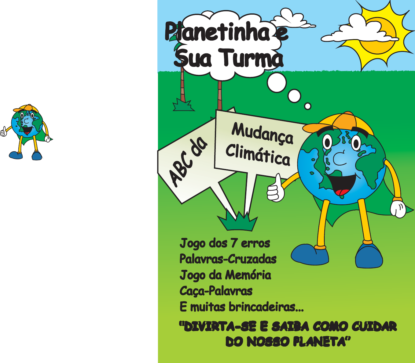 Planetinha e Sua Turma AB C d a Mudança Climática "DIVIRTA-SE E SAIBA COMO CUIDAR DO NOSSO PLANETA” Jogo dos 7 erros Palavras-Cruzadas Caça-Palavras E muitas brincadeiras... Jogo da Memória Palavras-cruzadas Desembaralhe Labirinto Caça-Palavras Jogo dos 7 erros Planetinha e Sua Turma26 Pla S r netin a ha e u Tu ma Temos que agir! O Planetinha está tristinho por não estamos fazendo nossa parte Conheça agora algumas curiosidades sobre o nosso dia-a-dia e o ambiente! Pense no que você e seus amigos podem fazer para ajudar a natureza. Se os brasileiros usassem a energia corretamente, poderiam poupar cerca de 16 milhões de barris de petróleo por ano, ou seja, muitos milhares de reais. Cerca de 75% da água que gastamos nas nossas casas é usada na hora do banho. Uma torneira pingando, pode desperdiçar mais de 190 litros de água por dia. Apagar a luz ao sair de um recinto quando não houver mais ninguém. Está mais do que comprovado que 84% do lixo doméstico é reciclável. Você sabia que o papel alumínio usado para embrulhar os alimentos é reciclável? A fabricação de fraldas descartáveis consome mais de 1 bilhão de árvores por ano. Cu dr eios sida Planetinha e Sua Turma 25 Idealizadora e Organizadora Josiane C. M. De Oliveira - josi@cptec.inpe.br Criador Giuliano G. M. Marcelino - giulianomarcelino@hotmail.com Designer Leandro Guarino de Vasconcelos - le@2guarinos.com Coordenador José Antonio Marengo Orsini - marengo@cptec.inpe.br Esta cartilha foi idealizada por , acreditando que, com a ajuda das crianças, pode-se conseguir um futuro melhor para o clima do planeta. O personagem foi criado por , estudante, onze anos. O projeto é coordenado pelo (pesquisador titular do CPTEC) Josiane Cristina Mendonça de Oliveira Planetinha Giuliano Guerra Mendonça Marcelino Dr.José Antonio Marengo Orsini Onde estão as palavras ? Ajude o Planetinha a encontrar as palavras: EFEITO ESTUFA OZÔNIO GÁS CARBÔNICO OXIGÊNIO OCEANO AQUECIMENTO POLUIÇÃO CHUVA NATUREZA ECOLOGIA DESMATAMENTO PETRÓLEO MEIO AMBIENTE FLORESTA C O S T I F K Y A N D U W I P S E N H O P T Ç N A D A Z G B H C B I T R E T Ç I E T L M G Y S S W P F M U O H T F H A J I E C U P J T H D A Q Z X E R L R J Y N G K F U B K A S Q Y R O R X Ç J O U M A O C A S T I S D M V B R R S H F P G O M A Ç S E A R P M I A J O E G N A T U R E Z A C K L M Y D I A E Y T S Q R A R F Ç N X J G T N C O D G E P K O O S S O L U Ç T K F K R W G G J Z M Y L C B O V A X T N E F E I T O S T U F A K Z B I Ç H U L P M N A Q P V C J L J C L I H T S L P N T E D M U P B U J M T Y I W P J O R P A B C X J D F Ç J N I H I M K R U T M L E J L Ç R N I A C L N G Y M M Ç R E A M S D J E K Y P O I K H L R P S S M H W P A N N A O C E A N O I L G Y F D L B E O B Ç M G G O E T A L W I G T Y O N I R G U N O K Y G E Z X T E Q E M D E A U O T R J A L I M V N R E M Y Ç B K J S W A E N G T O R F P K P N L O X I G E N I O L N K H M B Ç P R L K M G T R E K P Ç C L I M J U K N Z T B V U N G Z X Y O P L U Y R J O Z V N L B C P O K L R B T A F G D E S M A T A M E N T O I U Y R D E A A C aa vça-Pala r s Planetinha e Sua Turma 5Planetinha e Sua Turma24 Olá, Amiguinho! Você sabe o que é ? Vou contar para você, mas preste bastante atenção, viu? mudança climática Que bom que podemos ter informações que fazem de nós uma galera que sabe cuidar do planeta! Vamos aproveitar e agir! Falar de mudança climática é também falar do aumento do . O planeta precisa se aquecer para que tudo funcione corretamente, mas não pode aquecer demais. No inverno, precisamos de cobertor na hora de dormir, mas se colocarmos muitos cobertores ficaremos com calor. Hoje em dia é isto o que está acontecendo com a Terra. A poluição produzida pelos homens equivale à colocação de mais cobertores sobre nosso planeta. Isso faz com que a Terra se aqueça. Quando a Terra fica mais quente o clima muda, e muda muito rápido. Efeito Estufa A e j e nd e n e i e i c a e o m d e l n v r e e b c P r A i r M b l a o n ta d a s e u o a ti ha p e i t O aq ?u me té M áu Cd lan i cç ia da M á u t da C n a ç i a ml ic Quando nossas árvores estão bem cuidadas, temos ar puro para respirar. As árvores e todos nós também precisamos de água boa para sermos saudáveis, daí a importância do cuidado com a mãe natureza.AArÁguaÁrvore Recorte e brinque com sua galerinha! Planetinha e Sua Turma 23Planetinha e Sua Turma6 Jogo da Memória Planetinha e Sua Turma 7 Nossa! O planeta Terra está com muito calor e vai acabar esquentando demais para todos nós. Vamos cuidar melhor da natureza.Calor Que legal existir vários tipos de plantas e de animais vivendo num mesmo lugar. Isto se chama biodiversidade. As mudanças no clima estão modificando a vegetação de diversas regiões e levando os animais para fora de seu ambiente natural. Isto pode provocar o desaparecimento de várias espécies de planta e de animais do planeta. Biodiversidade C B Planetinha e Sua Turma22 V b n a u n m l e p r a t m m c e s l o r e a a a v s i r e d s a s i e r s a a ca s o s a t r r u T m o b s p ? e d alh s a Você pode me ajudar? O precisa ajudar o planeta Terra! Planetinha RTERA TLANEPA IEOM TIEEMBNA INGÊIXOO UTOQIEANMCE ACHVU CEOOIGAL FITEEO SAUTFE ÇADMUAN CMLAICIÁT LINEHAAPTN A preservação do meio ambiente é muito importante para que não falte energia para ninguém. Energia Devemos tomar muito cuidado com nossas árvores e evitar o desmatamento e as queimadas, pois sem as florestas o planeta vai ficar cada vez mais quente. Desmatamento E D Planetinha e Sua Turma 21Planetinha e Sua Turma8 1 2 3 4 5 6 8 9 10 11 12 13 14 16 17 18 19 20 21 22 23 24 25 26 27 28 29 30 31 32 33 34 35 7 15 Vamos colorir ? Ligue os Pontos Gases A floresta tropical é muito importante para atmosfera terrestre, pois fornece uma grande quantidade de oxigênio para respirarmos. Por isso devemos evitar o desmatamento. Floresta Tropical G F Existem gases que fazem muito mal para a nossa saúde!!! Os gases que saem dos ca