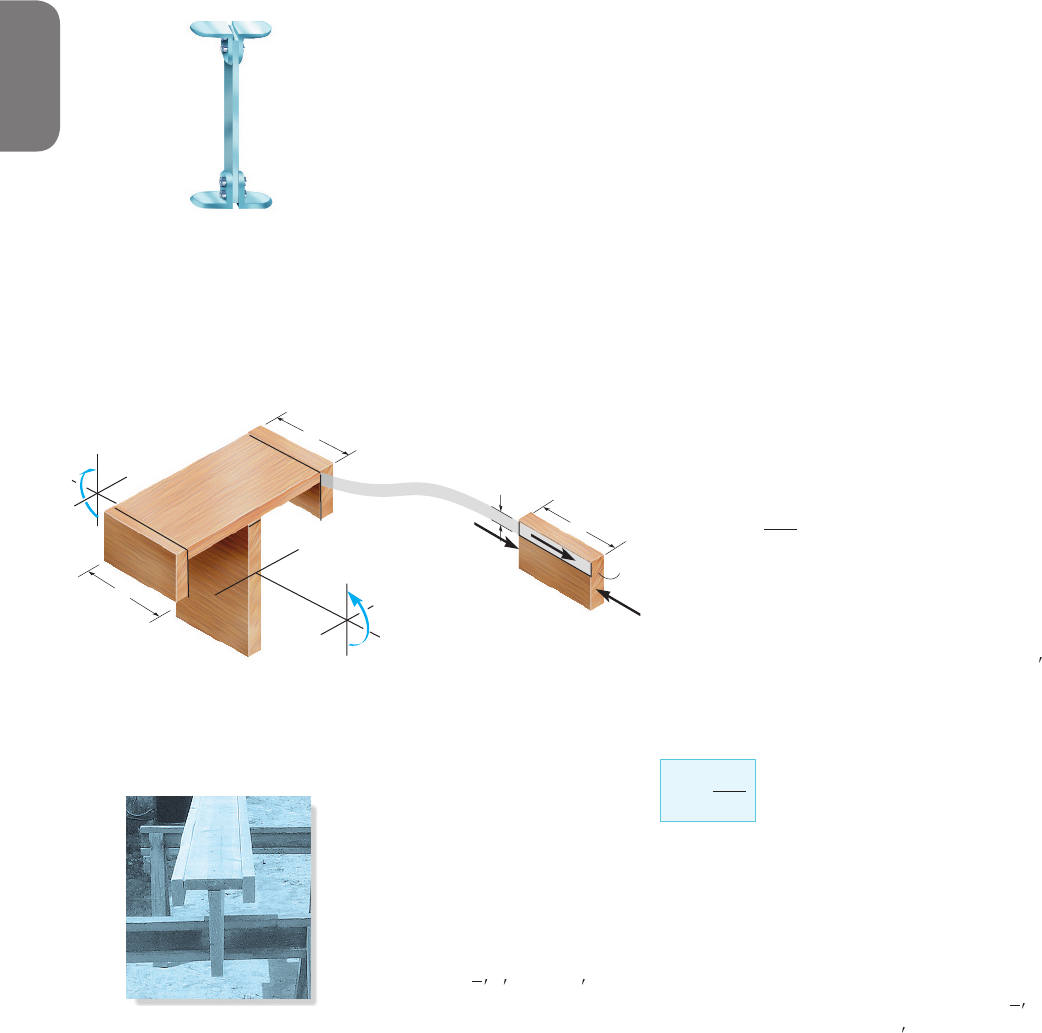 404 Chapter 7 transverse shear 7 Fig. 7–13 dx dx M � dM M (a) dx dF F � dF (b) t F A¿ *The use of the word “flow” in this terminology will become meaningful as it pertains to the discussion in Sec. 7.4. 7.3 Shear Flow in built-up MeMberS Occasionally in engineering practice, members are “built up” from several composite parts in order to achieve a greater resistance to loads. An example is shown in Fig. 7–13. If the loads cause the members to bend, fasteners such as nails, bolts, welding material, or glue will be needed to keep the component parts from sliding relative to one another, Fig. 7–2. In order to design these fasteners or determine their spacing, it is necessary to know the shear force that they must resist. This loading, when measured as a force per unit length of beam, is referred to as shear flow, q.* The magnitude of the shear flow is obtained using a procedure similar to that for finding the shear stress in a beam. To illustrate, consider finding the shear flow along the juncture where the segment in Fig. 7–14a is connected to the flange of the beam. Three horizontal forces must act on this segment, Fig. 7–14b. Two of these forces, F and F + dF, are the result of the normal stresses caused by the moments M and M + dM, respectively. The third force, which for equilibrium equals dF, acts at the juncture. Realizing that dF is the result of dM, then, like Eq. 7–1, we have dF = dM I LA′y dA′ The integral represents Q, that is, the moment of the segment’s area A′ about the neutral axis. Since the segment has a length dx, the shear flow, or force per unit length along the beam, is q = dF>dx. Hence dividing both sides by dx and noting that V = dM>dx, Eq. 6–2, we have q = VQ I (7–4) Here q = the shear flow, measured as a force per unit length along the beam V = the shear force, determined from the method of sections and the equations of equilibrium I = the moment of inertia of the entire cross-sectional area calculated about the neutral axis Q = y′A′, where A′ is the cross-sectional area of the segment that is connected to the beam at the juncture where the shear flow is calculated, and y′ is the distance from the neutral axis to the centroid of A′ Fig. 7–14 7.3 shear Flow in Built-up memBers 405 7 Fastener Spacing. When segments of a beam are connected by fasteners, such as nails or bolts, their spacing s along the beam can be determined. For example, let’s say that a fastener, such as a nail, can support a maximum shear force of F (N) before it fails, Fig. 7–15a. If these nails are used to construct the beam made from two boards, as shown in Fig. 7–15b, then the nails must resist the shear flow q (N>m) between the boards. In other words, the nails are used to “hold” the top board to the bottom board so that no slipping occurs during bending. (See Fig. 7–2a.) As shown in Fig. 7–15c, the nail spacing is therefore determined from F (N) = q (N>m) s (m) The examples that follow illustrate application of this equation. Other examples of shaded segments connected to built-up beams by fasteners are shown in Fig. 7–16. The shear flow here must be found at the thick black line, and is determined by using a value of Q calculated from A ′ and y′ indicated in each figure. This value of q will be resisted by a single fastener in Fig. 7–16a, by two fasteners in Fig. 7–16b, and by three fasteners in Fig. 7–16c. In other words, the fastener in Fig. 7–16a supports the calculated value of q, and in Figs. 7–16b and 7–16c each fastener supports q>2 and q>3, respectively. _ y ¿ A¿ AN (a) N A (b) A¿ A¿ AN (c) _ y ¿ _ y ¿ Fig. 7–16 Important poInt • Shear flow is a measure of the force per unit length along the axis of a beam. This value is found from the shear formula and is used to determine the shear force developed in fasteners and glue that holds the various segments of a composite beam together. (a) F F A N V � (b) � � � � (c) F � Fig. 7–15 406 Chapter 7 transverse shear 7 The beam is constructed from three boards glued together as shown in Fig. 7–17a. If it is subjected to a shear of V = 850 kN, determine the shear flow at B and B ′ that must be resisted by the glue. SOLUTION Section Properties. The neutral axis (centroid) will be located from the bottom of the beam, Fig. 7–17a. Working in units of meters, we have y = Σy�A ΣA = 2[0.15 m](0.3 m)(0.01 m) + [0.305 m](0.250 m)(0.01 m) 2(0.3 m)(0.01 m) + (0.250 m)(0.01 m) = 0.1956 m The moment of inertia of the cross section about the neutral axis is thus I = 2 c 1 12 (0.01 m)(0.3 m)3 + (0.01 m)(0.3 m)(0.1956 m - 0.150 m)2 d + c 1 12 (0.250 m)(0.01 m)3 + (0.250 m)(0.01 m)(0.305 m - 0.1956 m)2 d = 87.42(10-6) m4 The glue at both B and B ′ in Fig. 7–17a “holds” the top board to the beam. Here QB = y=BA=B = [0.305 m - 0.1956 m](0.250 m)(0.01 m) = 0.2735(10-3) m3 Shear Flow. q = VQB I = 850(103) N(0.2735(10-3) m3) 87.42(10-6) m4 = 2.66 MN>m Since two seams are used to secure the board, the glue per meter length of beam at each seam must be strong enough to resist one-half of this shear flow. Thus, qB = qB′ = q 2 = 1.33 MN>m Ans. NOTE: If the board CC' is added to the beam, Fig. 7–17b, then y and I have to be recalculated, and the shear flow at C and C′ determined from q = V y′ C A′ C>I. Finally, this value is divided by one-half to obtain qC and qC′. ExampLE 7.4 250 mm 10 mm 300 mm 125 mm 10 mm10 mm AN _ y _ y¿B V � 850 kN B B¿ (a) A¿B _ y¿C AN C (b) C ¿ A¿C Fig. 7–17 7.3 shear Flow in Built-up memBers 407 7 A box beam is constructed from four boards nailed together as shown in Fig. 7–18a. If each nail can support a shear force of 30 N, determine the maximum spacing s of the nails at B and at C to the nearest 5 mm so that the beam will support the force of 80 N. SOLUTION Internal Shear. If the beam is sectioned at an arbitrary point along its length, the internal shear required for equilibrium is always V = 80 
