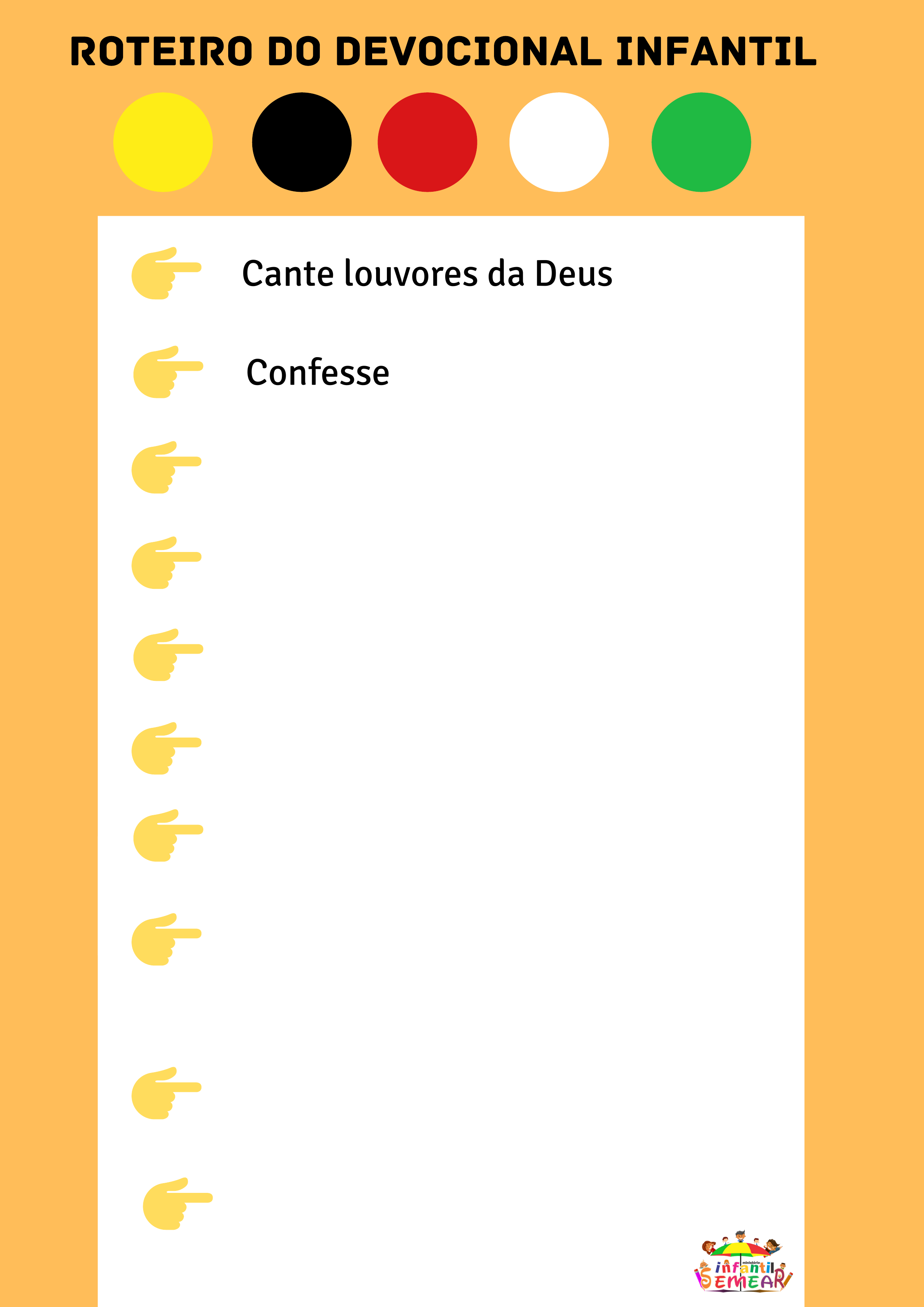 Faça a leitura Biblica conforme o devocional diário Termine agradecendo a Deus por tudo Siga as orientações do caderno Meu Devocional roteiro do Devocional Infantil Cante louvores da Deus Confesse seus pecados Ore por você e sua família Ore pelos Amigos e a Igreja Ore pelos Missionários Ore pelas Autoridades Ore pelas Nações