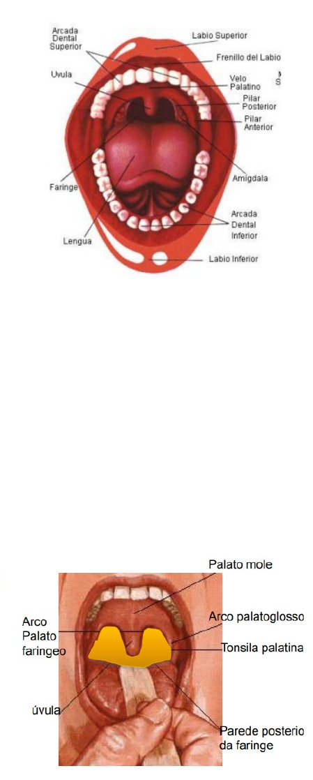 Anatomia – 10/04 Sistema Digestório Funções - preensao - mastigação - deglutição - digestão -absorção dos alimentos - exclusão dos residuos Canal Alimentar que esta relacionado a varios orgãos - boca - faringe - esofago - estomago - intestino *orgãos acessorios - dentes - lingua - figado - vesicula biliar - pancreas - glandulas salivares Boca - limites Anterior – rima labial Posterior – istmo das fauces(garganta) dor de garganta: faringite Cavidade Bucal divisão - vestibulo da boca (assim que passou a rima labial, esta entre os labios, dentes e gengiva) - cavidade bucal propriamente dita(dos dentes para tras) *palato duro – limite superior (parte dela é ossea) *palato mole – limite posterior (formado por musculos liso, a uvula é o limite) *labios – limite anterior *língua – limite inferior *bochechas - limites laterais Visão antero-posterior no limite posterior - primeiro arco – palatoglosso(anterior, onde esta a uvula - a uvula vai fazer junto com a prega vocal a vibração para o tom de algumas palavra e ajuda na deglutição -) entre os arcos existe uma fossa – fossa tonsilar(onde se encontra a tonsila palatina, chamada amidala) - segundo arco – palatofaringico (posterior) - lingua (inferiormente) * dividida em duas partes (raiz e corpo). da regiaõ do arco palatoglosso ate arco palatofarigico na região da epiglote : raiz do arco palatoglosso para frente : corpo da lingua. * papilas linguais – estruturas pequenas encontradas no dorso lingua, são terminacoes para que possa perceber sensibilidade gustativa. foliadas, filiformes, fungiformes e valadas(estão no limite posterior da lingua, proximo a raiz. Essa região é chamada sulco terminal, onde se encontra um forame cego) Inervação da lingua Nervo Facial(VIII); 2/3 anterior capaz de levar informção motora e traser informaçao sensorial ao cortez. Nervo Glossofaringeo(IX); 1/3 posterior capaz de perceber informação sensorial na região posterior da lingua. Nervo Vago(X); inerva a epiglote * frênulo lingual – faz a medida do posicionamento da lingua - ostio das glandulas salivares Musculos da lingua - musculos intrisecos musculos longitudinal, tranversos e verticais. - musculos extrinsecos Musculos hioglosso e estiloglosso Deglutição Primeira Fase – Voluntaria - bolo alimentar é levado, posterior e superiormente, para os espaço entre os arcos palatoglosso - respiração é suspensa e o istmo é bloqueado Segunda Fase - Involuntaria - bolo alimentar passa atraves da orofaringe e laringofaringe para alcançar a parte superior do esofago. - relaxamento do esficter cricofaringeo pela ação mecanica do alimento. - apos a passagem do alimento a abertura da faringe esta bloqueado. Esofago tubo que transporte do alimento ate o estomago. dividida em partes - porção cervical - porção toracica - porção abdominal 17/04 Estomago Limite superior: junção com o esofago (esofagogastrico). Limite inferior: junção com o duodeno (gastroduodenal). - saco fibromuscular, capaz de acumular material nutritivo e passa-lo au duodeno apos ser parcialmete digerido. Posição: parte superior da cavidade abdominal, inferior ao diafragma. Partes do estomago - ostio cardio (abertura) - parte cardia (inicio do estomago) - fundo (começa a partir da incisura cardia para cima, normalmente esta vazia cheia de ar) - corpo curvatura maior curvatura menor(da cardia ate a inscisura angular) - pilorico (final do estomago, da incisura angular ate o duodedo) antro pilorico, começo da regiao pilorica canal pilorico, para o bolo alimentar entrar no duodeno - ostio pilorico Mucosa do estomago - pregas gastricas(existem para que o alimento fique preso no estomago para a mistura), mais evidentes na curvatura menor(canal gastrico) - absorção pequena - principal função de digestão enzimatica - transformação do bolo alimentar em quimo Intestino Delgado Limite superior: na junção gastroduodenal Limite inferior: junção ileocecocólica - órgão indispensavel – digetão e absorção Três partes: - duodeno, mais curto - jejuno, fica vazio - ileo, fica cheio O jejuno e o ileo são partes longas, presas à parede posterior do abdomem pelo mesenterio Duodeno - comprimento de 12 dedos - dividido em 4 partes: primeira parte superior - bulbo duodenal. segunda parte descendente – esta na abertura do ducto pancreatico e o ducto colecloco. terceira parte horinzontal ou inferior – parte a esquerda quarta parte ascendente – ascende, curva-se para a flexura duodenojejunal Jejuno e Íleo - aproximadamente 5 metros - duas ultimas porçoes do intestino delgad. - tubo longo que forma alças intestinais - dificil de determinar a transição entre as partes - 2/5 proximais formam o jejuno e os 3/5 distais o ileo. - Jejuno Limite superior: flexura duodenojejunal - Ileo Limite inferior : na junção ileocecocólica Intestino Grosso - cécum - colon ascendente e flexura hepatica(colica direita) - colon tranverso e flexura lienal(colica esquerda ou esplenica) -colon descendente - colon sigmoide - reto e canal anal - mais calibroso do que o intestino delgado - apêndice vermiforme – orgão oco, estreito e muscular. - apêndice epiplóicos – massa de teciso adiposos - haustro – gomos do intestino - tenias do colon limite superior: inicio no cecum limite inferior: colon sigmóide Função: Formação, transporte e evacuação de fezes Apresenta: Mobilidade – atividade muscular do colon, movimento de massa-. Capacidade de absorção de agua e de secreção de muco - protege a mucosa -. Peritônio - Membrana serosa de dupla parede que forra a parede abdominal - peritonio parietal-, e o peritonio visceral, recobre as visceras Mesenterio , comunica o intestino da parede posterior do abdomem. Órgãos acessorios e anexos - Fígado e vias biliares * maior glandula do corpo humano *a bile é secretada e conduzia ao duodedo pelas vias biliares * vesicula biliar, amazena a bile feita pelo figado Funçoes - modificar a estrutura 