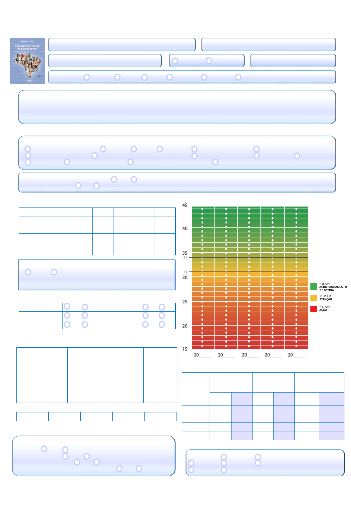 FICHA ESPELHO DA CADERNETA DE SAÚDE DA PESSOA IDOSA Data de Nascimento: ___/____/________ 1. IDENTIFICAÇÃO Nome: Como quer ser chamado: Endereço: ________________________________________________________________________________________________ Telefones: ______________________ Pessoa de Referência: __________________________ Tel.: ____________________ Unidade de saúde de Referência: ____________________________ CNS: _________________ Nº Prontuário: ______________ Data de entrega da Caderneta: _____/_____/_______ Responsável pela entrega:______________________________________ Estado civilFeminino Masculino Raça/Cor: Branca Preta Parda Amarela Indígena Não declarada 2. AVALIAÇÃO CLÍNICA Doenças prévias ou já diagnosticadas: Acidente Vascular cerebral Anemia Asma Diabetes Hipertensão arterial Doença arterial coronariana Insuficiência cardíaca Doença pulmonar obstrutiva crônica Úlcera gastrointestinal Epilepsia Depressão Ansiedade Incontinência Urinária Declínio cognitivo ou Demência Outras:________________________________ 20___ 20___ 20___ 20___ 20___ Peso Altura IMC= peso/altura2 Perímetro da Panturrilha (PP) esquerda Dados antropométricos Perímetro da Panturrilha Mais de 2 internações no último ano: Sim Não Motivo 1a_____________ Motivo 2a____________ Motivo 3a_____________ Cirurgia (s) prévia (s): Sim Não Tipo: _____________________________________________ Ano: __________________ Presença de dor com duração igual ou superior à 3 meses? DATA LOCALIZAÇÃO DA DOR INTENSIDADE (LEVE, MODERADA, INTENSA) DATA LOCALIZAÇÃO DA DOR INTENSIDADE (LEVE, MODERADA, INTENSA) Polifarmácia: uso concomitante de 5 ou mais medicamentos? DATA / / SIM NÃO DATA / / SIM NÃO DATA / / SIM NÃO DATA / / SIM NÃO DATA / / SIM NÃO DATA / / SIM NÃO Emagrecimento não intencional no último ano: Sim Não Quanto: _________ kg Glicemia Jejum ______________________________________ Glicemia casual ______________________________________ Avaliações odontológicas realizadas / / / / / / / / / / Data da queda (mês/ano) Qual foi o local da queda? A queda causou alguma fratura? Você parou de realizar alguma ativiade por medo de cair novamente? Dentro de casa Fora de casa Sim/Qual? Não Sim Não Hábitos de vida Fumante: Sim Não Faz uso de álcool: Sim Não Prática atividade física: Sim Não Atividades sociais ou algum tipo de lazer: Sim Não Deficiência: Sim Não Auditiva Visual Intelectual / Cognitiva Física Outra: ________________________ 3. AVALIAÇÃO PSICOSSOCIAL Alteração de Cognição (Questões dirigidas à pessoa idosa, familiar ou cuidador) Alteração de Humor (Questões dirigidas à pessoa idosa, familiar ou cuidador) Suporte Familiar 4. AVALIACAO FUNCIONAL PROTOCOLO DE IDENTIFICAÇÃO DO IDOSO VULNERÁVEL (VES-13) 1. Idade 20___ 20___ 20___ 20___ 20___ 60 a 74 anos 0 pontos 75 a 84 anos 1 ponto ≥ 85 anos 3 pontos 2. Auto percepção de saúde: 20___ 20___ 20___ 20___ 20___ Em geral, comparando com outras pessoas de sua idade, você diria que sua saúde é: Excelente| 0 pontos Bom| 0 pontos Muito bom| 0 pontos Ruim| 1 pontos Regular| 1 pontos 3. Limitação física Em média, quanta dificuldade você tem para fazer as seguintes atividades físicas: Pontuação: As respostas “muita dificuldade” ou “incapaz de fazer” valem 1 ponto cada. Todavia, a pontuação máxima nesse tópico é de 2 pontos, ainda que a pessoa tenha marcado ter “muita dificuldade” ou ser “incapaz de fazer” as 6 atividades listadas. A | B | C | D | E 20___ 20___ 20___ 20___ 20___ Curvar-se, agachar ou ajoelhar-se Levantar ou carregar objetos com peso aproximado de 5 kg Elevar ou estender os braços acima do nível do ombro Escrever ou manusear e segurar pequenos objetos Andar 400 metros (aproximadamente quatro quarteirões) Fazer serviço doméstico pesado, como esfregar o chão ou limpar janelas Chave de respostas: A| Nenhuma dificuldade B| Pouca dificuldade C| Média (alguma) dificuldade D| Muita dificuldade E| Incapaz de fazer (não consegue fazer) 4. Incapacidades Pontuação: As respostas positivas (”sim”) valem 4 pontos cada. Todavia, a pontuação máxima nesse tópico é de 4 pontos, mesmo que a pessoa idosa tenha respondido “sim” para todas as perguntas. 20___ 20___ 20___ 20___ 20___ Por causa de sua saúde ou condição física, você deixou de fazer compras? Sim. Não ou não faz compras por outros motivos que não a saúde. Por causa de sua saúde ou condição física, você deixou de controlar seu dinheiro, seus gastos ou pagar contas? Sim. Não ou não controla o dinheiro por outros motivos que não a saúde. Por causa de sua saúde ou condição física, você deixou de caminhar dentro de casa? Sim. Não ou não caminha dentro de casa por outros motivos que não a saúde. Por causa de sua saúde ou condição física, você deixou de realizar tarefas domésticas leves, como lavar louça ou fazer limpeza leve? Sim. Não ou não realiza tarefas domésticas leves por outros motivos que não a saúde. Por causa de sua saúde ou condição física, você deixou de tomar banho sozinho(a)? Sim. Não ou não toma banho sozinho(a) por outros motivos que não a saúde. Acesso a serviços: Acesso a transporte público: Sim Não Acesso fácil a supermercado, farmácia, padaria, etc.: Sim Não Em caso de necessidade, conta com alguém para acompanhá-lo à UBS: Sim NãoMora só Mora com cônjuge Mora com familiares /parentes ILPI Outros: ______________ No último mês, você ficou com desânimo, tristeza ou desesperança? Sim Não No último mês, você perdeu o interesse em atividades anteriormente prazerosas? Sim Não Sabe ler e escrever: Sim Não Escolaridade: Nenhuma De 1 a 3 anos De 4 a 7 anos 8 anos ou mais Trabalha atualmente ou possui algum tipo de atividade remunerada: Sim Não Aposentado: Sim Não Recebe algum tipo de benefício: Sim Não Qual: _____________________________________ Alguém (família ou amigo) falou que você está ficando esquecido? 