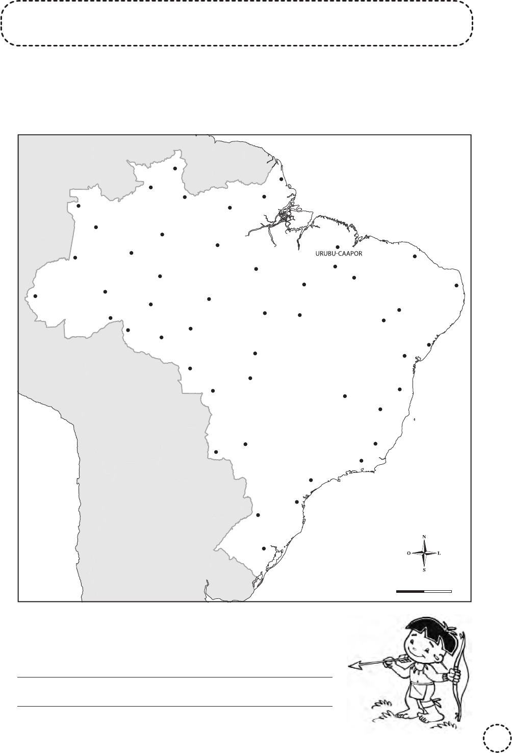 Nome: ________________________________________ Data: ____ /____ /____ 117 POVOS INDÍGENAS DO BRASIL � Observe este mapa do Brasil e leia as palavras nele distribuídas. MAUÉ ARAUETÉ KRIKATI APINAJÉ TAPEBA GUAJAJARA GUARANI GUARANI GUARANI CAINGUANGUE XOCIENGUE MURA DERI NUQUINI CAXINAUÁ TICUNA TUCANO MUNDUCURU CARAJÁ CAIAPÓ PANCARARU XOCÓ KIRIN PATAXÓ MAXACALI XACRIABÁ KRENAKTERENA BORORO CAMBIUÁ POTIGUARA XAVANTE NAMBIQUARA CARIPUNA TENHARIM APURINÃ MACU MACUXI IANOMAMI WAIWAI WAIMIRI ATROARI ARIPUANÃ SURUÍ PARQUE DO XINGU WALÁPI CARIPUNA DO AMAPÁ ZO’É CANDIUÉU 0 270 540 km 1. O que o mapa acima apresenta? ATIV_GEOGRAFIA_5oANO.indd 117ATIV_GEOGRAFIA_5oANO.indd 117 19/03/20 11:0819/03/20 11:08 118 2. Localize neste diagrama dez nomes de povos indígenas brasileiros mencionados no mapa. J K S A S H O S B L O H U T K E U A G J H T U C A N O O A M I R E D U B P J K M X B G R H U V Z Q H A J A G C A R A J Á T N T U P P R L N J A S E P S A K D O T T N A S C Y F P K S J U U U Z E V H N K A P C A I A P Ó H R G R C G I O R L T T L I A E T U E E T W U F A H F A A M W O J C B N E O M O R A E X E S T I C U N A S D S T U U T Ó U T C R B A T K P H M I F L R T P K A C U E E V A M I A N O M Â M I P L S Y L I L Y O G U F R S B T A Y C A D V 3. Desembaralhe as letras e forme nomes de algumas das contribuições indígenas à alimentação do povo brasileiro. Comece pela letra destacada. a) L H O I M _____________________________ b) M I O D A C N A ________________________ c) A P H N A M O _________________________ d) C A P O I P ____________________________ e) J A C N I A C __________________________ f) P Ã I R O _______________________________ g) J E B I U _______________________________ h) G I M A N U ___________________________ ATIV_GEOGRAFIA_5oANO.indd 118ATIV_GEOGRAFIA_5oANO.indd 118 19/03/20 11:0819/03/20 11:08