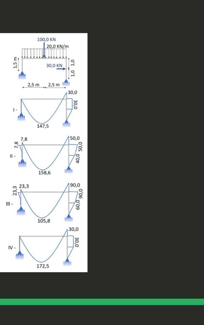 1O momento fletor representa a soma algébrica dos momentos relativos à seção YX, contidos no eixo da peça, gerados por cargas aplicadas transversalmente ao eixo longitudinal. Produzindo esforço que tende a curvar o eixo longitudinal, provocando tensões normais de tração e compressão na estrutura. Para o pórtico a seguir, verifique qual desenho corresponde ao diagrama de momento fletor: A Diagrama III. B Diagrama I. C Diagrama IV. D Diagrama II. 2Viga Gerber (Gerberträger ou Gelenkträger) é designada em estática das construções uma viga sobre diversos suportes, composta com rótulas de forma tal que seus trechos são estaticamente determinados, possibilitando assim a determinação das equações de força cortante e momento fletor apenas pelos princípios da estática. Sobre as vigas Gerber e a análise de estruturas, classifique V para as sentenças verdadeiras e F para as falsas: ( ) Quando temos mais de uma carga atuante em uma viga, pode ser aplicado o princípio da superposição dos efeitos. ( ) A rótula é uma ligação entre barras de uma estrutura em que não há transmissão de momento fletor. ( ) A rótula não é capaz de absorver os esforços e transmiti-los para a barra de ligação. ( ) Na rótula que representa o apoio Gerber, os esforços solicitantes são nulos. Assinale a alternativa que apresenta a sequência CORRETA: A V - V - F - V. B V - F - V - V. C F - V - F - F. D V - F - V - F. 3Esforços internos representam o efeito de forças e momentos entre duas porções de uma estrutura reticulada resultantes de um corte em uma seção transversal. Os esforços internos correspondentes de cada lado da seção seccionada são iguais e contrários, pois correspondem uma ação e a reação correspondente. Sobre os esforços internos em vigas, analise as sentenças a seguir: I- O diagrama de esforço cortante (DEC) de uma viga, no ponto em que está submetida a um momento fletor concentrado, apresentará descontinuidade no ponto do carregamento. II- O diagrama de momento fletor (DMF) de uma viga, no ponto em que está submetida a um momento concentrado, apresentará descontinuidade no ponto do carregamento, com valor distinto do momento concentrado, em seu ponto de aplicação. III- A presença de rótulas na estrutura faz com que os esforços horizontais e verticais sejam transferidos, mas não transferem os esforços de momento fletor, portanto no nó rotulado, o diagrama de momento fletor é necessariamente zero. Assinale a alternativa CORRETA: A Somente a sentença II está correta. B As sentenças II e III estão corretas. C As sentenças I e III estão corretas. D Somente a sentença III está correta. 4Os esforços que uma estrutura está submetida podem ser descritos através de expressões analíticas. Em atenção à viga anexa, classifique V para as sentenças verdadeiras e F para as falsas: ( ) A viga é simétrica, desta forma, as reações de apoio possuem o mesmo valor e sentido. ( ) O esforço normal ao longo da viga é nulo, ou seja, em qualquer ponto N(x) = 0. ( ) A expressão analítica que representa o esforço cortante no tramo B-C é Q(x) = 200 - 30.x kN; considerando x=0 em B. ( ) A expressão analítica que representa o momento fletor no tramo B-C é M(x) = -15.x² + 200.x + 200 KNm; considerando x=0 em B. Assinale a alternativa que apresenta a sequência CORRETA: A V - F - V - V. B V - V - V - V. C V - V - V - F. D F - V - F - F. 5 As estruturas espaciais são caraterizadas por apresentar os eixos das diversas barras não contidos em um mesmo plano. Para que as estruturas sejam espaciais, elas devem apresentar três dimensões. Sobre o exposto, assinale a alternativa CORRETA: A Para efeitos de cálculo (dimensionamento), podemos dizer que o cálculo para isostaticidade de estruturas espaciais é muito parecido com as estruturas planas e paralelas, que englobam a terceira dimensão. B Para efeitos de cálculo (dimensionamento), podemos dizer que o cálculo para isostaticidade de estruturas espaciais é muito parecido com as estruturas tridimensionais, porém engloba a terceira dimensão. C Para efeitos de cálculo (dimensionamento), podemos dizer que o cálculo para isostaticidade de estruturas espaciais é muito parecido com as estruturas espaciais retas, porém engloba a terceira dimensão. D Para efeitos de cálculo (dimensionamento), podemos dizer que o cálculo para isostaticidade de estruturas espaciais é muito parecido com as estruturas planas, porém engloba a terceira dimensão. 6Em uma estrutura denominam-se as ações sobre a estrutura como cargas atuantes e as reações de apoio como cargas resistentes. Em atenção à viga biapoiada da figura anexa, considerando as distâncias "a" e "b" diferentes, analise as sentenças a seguir: I- A reação de apoio VA e igual a VB, com valor de [P / 2]. II- O momento fletor no ponto C equivale a [(P*a*b) / L]. III- O esforço cortante na metade da distância "b" equivale a [(P*b - P*L) / L]. Assinale a alternativa CORRETA: A As sentenças II e III estão corretas. B Somente a sentença II está correta. C As sentenças I e II estão corretas. D Somente a sentença III está correta. 7As estruturas são compostas por elementos estruturais como: lajes, vigas, pilares e fundações. As vigas são elementos que geralmente se apresentam na horizontal, com a função de receber as cargas das lajes e transmiti-las aos pilares. Considerando a viga da figura em anexo, assinale a alternativa CORRETA: A É uma viga biapoiada simples com reações de apoio de 20 kN. B É uma viga biapoiada simples com reação de apoio Rby 21,34 kN. C É uma viga engastada com reações de apoio Rby de 21,34 kN. D É uma viga engastada simples com reações de apoio de 20 kN. 8 São elementos estruturais do tipo "BARRAS", que têm a função de distribuir as cargas de um elemento estrutural para outro. De acordo com o descrito no texto, o mesmo se refere a qual tipo de elemento estrutural? A Vigas. B Lajes. C 