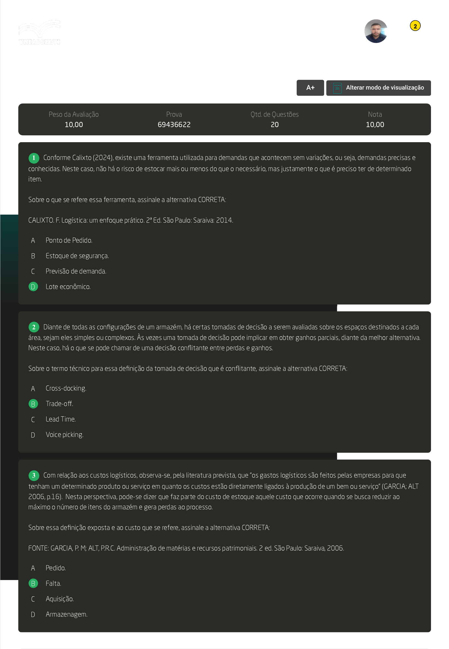 27/08/2023 16:53 AVA https://ava2.uniasselvi.com.br/subject/grades-and-tests/answer-book/eyJ0ZXN0Ijp7InRlc3RDb2RlIjoiNjc4MDg0IiwiZGVzY3JpcHRpb24iOiJBdmFsaWHDp8OjbyBkYSBEaXNjaXBsaW5hIiwicGFyYW1ldGVyIjpudWxsL… 1/6 GABARITO | Avaliação da Disciplina (Cod.:678084) Peso da Avaliação 10,00 Prova 69436622 Qtd. de Questões 20 Nota 10,00 Conforme Calixto (2024), existe uma ferramenta utilizada para demandas que acontecem sem variações, ou seja, demandas precisas e conhecidas. Neste caso, não há o risco de estocar mais ou menos do que o necessário, mas justamente o que é preciso ter de determinado item. Sobre o que se refere essa ferramenta, assinale a alternativa CORRETA: CALIXTO. F. Logística: um enfoque prático. 2ª Ed. São Paulo: Saraiva: 2014. A Ponto de Pedido. B Estoque de segurança. C Previsão de demanda. D Lote econômico. Diante de todas as configurações de um armazém, há certas tomadas de decisão a serem avaliadas sobre os espaços destinados a cada área, sejam eles simples ou complexos. Às vezes uma tomada de decisão pode implicar em obter ganhos parciais, diante da melhor alternativa. Neste caso, há o que se pode chamar de uma decisão conflitante entre perdas e ganhos. Sobre o termo técnico para essa definição da tomada de decisão que é conflitante, assinale a alternativa CORRETA: A Cross-docking. B Trade-off. C Lead Time. D Voice picking. Com relação aos custos logísticos, observa-se, pela literatura prevista, que “os gastos logísticos são feitos pelas empresas para que tenham um determinado produto ou serviço em quanto os custos estão diretamente ligados à produção de um bem ou serviço” (GARCIA; ALT 2006, p.16). Nesta perspectiva, pode-se dizer que faz parte do custo de estoque aquele custo que ocorre quando se busca reduzir ao máximo o número de itens do armazém e gera perdas ao processo. Sobre essa definição exposta e ao custo que se refere, assinale a alternativa CORRETA: FONTE: GARCIA, P. M; ALT, P.R.C. Administração de matérias e recursos patrimoniais. 2 ed. São Paulo: Saraiva, 2006. A Pedido. B Falta. C Aquisição. D Armazenagem. VOLTAR A+ Alterar modo de visualização 1 2 3 Luiz Antonio Soares de Carvalho Engenharia de Produção (5608741) 2 27/08/2023 16:53 AVA https://ava2.uniasselvi.com.br/subject/grades-and-tests/answer-book/eyJ0ZXN0Ijp7InRlc3RDb2RlIjoiNjc4MDg0IiwiZGVzY3JpcHRpb24iOiJBdmFsaWHDp8OjbyBkYSBEaXNjaXBsaW5hIiwicGFyYW1ldGVyIjpudWxsL… 2/6 Uma das maneiras de analisar os custos de um estoque é a regra 80/20, em que a maior parte das vendas é gerada por alguns produtos e é a regra que menciona que uma pequena proporção dos itens totais contidos em estoque representa uma grande proporção do valor total em estoque (SLACK, 2009). Sobre o nome dessa técnica de análise dos custos do estoque, assinale a alternativa CORRETA: FONTE: SLACK, N.; CHAMBERS, S.; JOHNSTON, R. Administração da produção. 3. ed. São Paulo: Atlas, 2009. A Curva ABC. B Histograma. C Grant Chart. D Diagrama de dispersão. Diante de uma das principais funções da organização que se refere ao Marketing ser sobre atender as exigências do atual mercado consumidor, a competência Logística passa a ser grande diferencial no momento de comercializar qualquer produto ou serviço. Para tanto, a Logística precisa apoiar o conceito dos principais aspectos que são os 4Ps, segundo Kotler e Keller (2006). Sobre o conceito dos 4Ps, associe os itens, utilizando o código a seguir: FONTE: KOTLER, P.; KELLER, K. L. Administração de Marketing. 12 ed. São Paulo: Pearson Prentice Hall, 2006. I - Preço. II - Produto. III - Praça. IV - Promoção. ( ) É o bem de consumo ou serviço produzido pelo negócio. ( ) É a forma de promover o produto com interferência da praça e da publicidade. ( ) É o valor a ser cobrado pelo produto, especificando que o preço menos o custo. ( ) É o local de distribuição do produto em que se concretiza a transmissão da posse. A II – I – IV – III. B II – IV – I – III. C II – I – III – IV. D II – III – IV – I. O planejamento é uma das funções básicas da administração de qualquer organização e pessoa, seja no ramo empresarial, educacional ou pessoal, sendo uma ferramenta que possibilita prever problemas e reduzir os impactos que eles trarão. Nesse sentido, podemos afirmar que o planejamento permite que... Assinale a alternativa que completa corretamente a frase: A Sejam organizados os recursos que serão utilizados, identificando pessoas para atribuir tarefas e funções. B Sejam corrigidas imperfeições nos processos de trabalho, adequando o ambiente interno. C Sejam definidas as ações a serem seguidas, analisando o que é mais adequado de acordo com os objetivos. D Sejam analisados os caminhos e suas chances de sucesso, rumo ao alcance dos objetivos. 4 5 6 Luiz Antonio Soares de Carvalho Engenharia de Produção (5608741) 2 27/08/2023 16:53 AVA https://ava2.uniasselvi.com.br/subject/grades-and-tests/answer-book/eyJ0ZXN0Ijp7InRlc3RDb2RlIjoiNjc4MDg0IiwiZGVzY3JpcHRpb24iOiJBdmFsaWHDp8OjbyBkYSBEaXNjaXBsaW5hIiwicGFyYW1ldGVyIjpudWxsL… 3/6 Para garantir o sucesso de um planejamento, ele deve seguir uma sequência de ações que são ordenadas de modo a analisar o presente e o futuro, sempre tendo como ponto final nossos objetivos. Sobre o planejamento, assinale a alternativa correta: A Não podemos definir um plano de ação como o mais adequado, pois os cenários estão em constante mudança. B O plano de ação deve considerar apenas o cenário futuro, realizando previsões baseadas na emoção e na razão. C Uma vez definido, o plano de ação deve ser implantado e, caso julgado incoerente, deve ser refeito. D Depois de elaborado, o plano de ação deve ser implantado, avaliado e adotadas medidas de correção sempre que necessário. Uma informação importante na gestão dos estoques é verificar quanto aos itens disponíveis no armazém, pensando em rotatividade dos produ