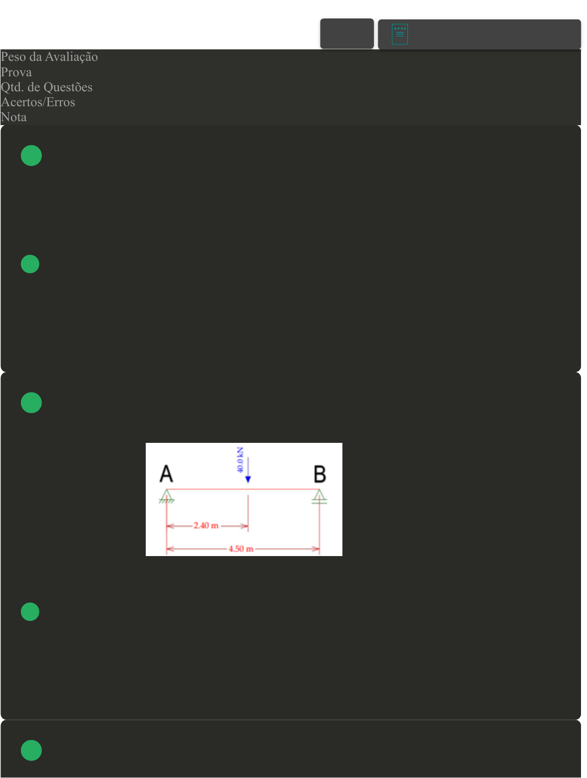 Prova Impressa GABARITO | Avaliação II - Individual (Cod.:886219) Peso da Avaliação 1,50 Prova 68140292 Qtd. de Questões 10 Acertos/Erros 10/0 Nota 10,00 Em uma estrutura de uma edificação residencial, localiza-se uma viga biapoiada com 18,0 metros de vão entre eixo de apoios. A viga está submetida a um carregamento vertical, devido à carga da laje, distribuído em toda a sua extensão, cujo valor é de Q = 55 KN.m. O momento fletor no meio do vão, o qual, neste caso também é o momento máximo, possui qual valor? A 990 KN.m B 2227,5 KN.m C 4455,5 KN.m D 1485 KN.m As estruturas são compostas por elementos estruturais como: lajes, vigas, pilares e fundações. As vigas são elementos que geralmente se apresentam na horizontal, com a função de receber as cargas das lajes e transmiti-las aos pilares. Considerando a viga da figura em anexo, assinale a alternativa CORRETA: A É uma viga engastada com reações de apoio Rby de 21,34 kN. B É uma viga biapoiada simples com reação de apoio Rby 21,34 kN. C É uma viga biapoiada simples com reações de apoio de 20 kN. D É uma viga engastada simples com reações de apoio de 20 kN. A mecânica dos corpos rígidos divide-se em duas áreas: estática e dinâmica. A estática trata do equilíbrio dos corpos, ou seja, aqueles que estão em repouso ou em movimento, com velocidade VOLTAR A+ Alterar modo de visualização 1 2 3 constante; enquanto a dinâmica preocupa-se com o movimento acelerado dos corpos (HIBBELER, 2010). Sobre o exposto, classifique V para as sentenças verdadeiras e F para as falsas: ( ) O momento em um determinado ponto P pode ser calculado se conhecermos a área do diagrama de esforços cortantes no trecho considerado. ( ) A ligação entre as barras dos pórticos é realizada através de engates ou rótulas internas, resultando comportamentos iguais na estrutura. ( ) O momento fletor e o esforço cortante nos cabos são nulos, estes apresentando apenas esforços de tração. ( ) Um carregamento distribuído em uma barra inclinada, atuando perpendicularmente a ela, apresentará os mesmos esforços internos do que um carregamento distribuído no sentido vertical. Assinale a alternativa que apresenta a sequência CORRETA: FONTE: HIBBELER, R. C. Resistência dos materiais. São Paulo: Pearson Educação, 2010. A F - F - V - F. B V - V - V - F. C V - F - V - F. D F - V - F - V. O momento fletor representa a soma algébrica dos momentos relativos à seção YX, contidos no eixo da peça, gerados por cargas aplicadas transversalmente ao eixo longitudinal. Produzindo esforço que tende a curvar o eixo longitudinal, provocando tensões normais de tração e compressão 4 na estrutura. Para o pórtico a seguir, verifique qual desenho corresponde ao diagrama de momento fletor: A Diagrama III. B Diagrama IV. C Diagrama II. D Diagrama I. Esforços internos representam o efeito de forças e momentos entre duas porções de uma estrutura reticulada resultantes de um corte em uma seção transversal. Os esforços internos correspondentes de cada lado da seção seccionada são iguais e contrários, pois correspondem uma 5 ação e a reação correspondente. Sobre os esforços internos em vigas, analise as sentenças a seguir: I- O diagrama de esforço cortante (DEC) de uma viga, no ponto em que está submetida a um momento fletor concentrado, apresentará descontinuidade no ponto do carregamento. II- O diagrama de momento fletor (DMF) de uma viga, no ponto em que está submetida a um momento concentrado, apresentará descontinuidade no ponto do carregamento, com valor distinto do momento concentrado, em seu ponto de aplicação. III- A presença de rótulas na estrutura faz com que os esforços horizontais e verticais sejam transferidos, mas não transferem os esforços de momento fletor, portanto no nó rotulado, o diagrama de momento fletor é necessariamente zero. Assinale a alternativa CORRETA: A Somente a sentença III está correta. B As sentenças II e III estão corretas. C Somente a sentença II está correta. D As sentenças I e III estão corretas. Viga Gerber (Gerberträger ou Gelenkträger) é designada em estática das construções uma viga sobre diversos suportes, composta com rótulas de forma tal que seus trechos são estaticamente determinados, possibilitando assim a determinação das equações de força cortante e momento fletor apenas pelos princípios da estática. Sobre as vigas Gerber e a análise de estruturas, classifique V para as sentenças verdadeiras e F para as falsas: ( ) Quando temos mais de uma carga atuante em uma viga, pode ser aplicado o princípio da superposição dos efeitos. ( ) A rótula é uma ligação entre barras de uma estrutura em que não há transmissão de momento fletor. ( ) A rótula não é capaz de absorver os esforços e transmiti-los para a barra de ligação. ( ) Na rótula que representa o apoio Gerber, os esforços solicitantes são nulos. Assinale a alternativa que apresenta a sequência CORRETA: A V - F - V - F. B V - V - F - V. C F - V - F - F. D V - F - V - V. Pórticos são estruturas lineares constituídas por barras retas ligadas entre si. Para o pórtico da figura anexa, analise as sentenças a seguir: 6 7 I- O diagrama de esforço cortante entre os pontos "C" e "D" é representado por uma reta inclinada. II- O esforço cortante na rótula em "E" é nulo. III- O momento fletor no ponto "C" equivale a 200 kN.m. IV- O diagrama de momento fletor em "G" apresenta uma descontinuidade de 100 kN.m. Assinale a alternativa CORRETA: A Somente a sentença III está correta. B As sentenças I, III e IV estão corretas. C As sentenças II e IV estão corretas. D As sentenças I, II e III estão corretas. Esforço cortante, força cortante ou força de cisalhamento é a força interna desenvolvida em membros estruturais que atua tangencialmente sobre a área de seção transversal de uma peça (HIBBELER, 2010). Para a viga a seguir, verifique qual desenho corresponde ao di