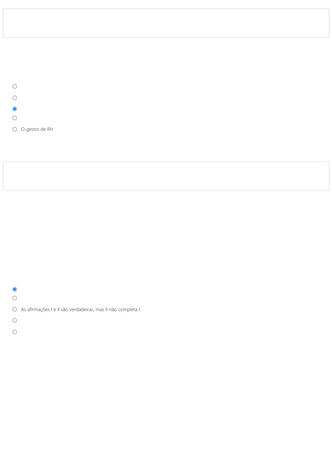 07/08/2023, 18:56 Teste 2 https://avaead.unisanta.br/mod/quiz/attempt.php 1/5 Questão 1 Resposta salva Vale 1,00 ponto(s). Questão 2 Resposta salva Vale 1,00 ponto(s). Na avaliação de desempenho do tipo 90°, o responsável por acompanhar e executar as funções, desempenho, avaliação e comunicação dos funcionários seria: Escolha uma opção: O executivo maior da empresa O responsável pelo plano de ação O gestor suportado pelo RH O terceirizado encarregado da atividade O gestor de RH Limpar minha escolha Considere as asserções abaixo: I. Podemos considerar que a gestão do clima organizacional é uma atividade que exige atenção permanente, trabalho constante e participação de toda a hierarquia PORQUE II. Dessa forma, as empresas podem garantir a satisfação de seus empregados, através de alguns princípios básicos que exigem coerência, respeito, reconhecimento e equidade. Assinale a alternativa correta: Escolha uma opção: As afirmações I e II são verdadeiras e a afirmação II completa a afirmação I. A afirmação II é verdadeira e a afirmação I é falsa. As afirmações I e II são verdadeiras, mas II não completa I. A afirmação I é verdadeira e a afirmação II é falsa. As afirmações I e II são falsas. Limpar minha escolha Cleide Batista Highlight Cleide Batista Highlight 07/08/2023, 18:56 Teste 2 https://avaead.unisanta.br/mod/quiz/attempt.php 2/5 Questão 3 Resposta salva Vale 1,00 ponto(s). Questão 4 Resposta salva Vale 1,00 ponto(s). NÃO se trata de uma das fases que integram um programa de gestão de cargos e salários: Escolha uma opção: Construção da estrutura salarial Avaliação de cargos Descrição de salários Política de remuneração Análise de função Limpar minha escolha Em relação à avaliação de desempenho, considere as asserções abaixo: I. É um dos principais métodos para que o LNT possa ser realizado, pois considera a visão de quem está diretamente ligado aos resultados realizados pelo funcionário: ele próprio e o gestor II. Visa identificar, diagnosticar e analisar o comportamento do funcionário durante determinado período, sua postura, conhecimento técnico, relacionamentos, etc. III. Não há um sistema padrão de avaliação de desempenho. Cada organização utiliza a que seja mais conveniente. Assinale a alternativa correta: Escolha uma opção: Somente a asserção II é verdadeira Somente as asserções II e III são verdadeiras As asserções I, II e III são falsas As asserções I, II e III são verdadeiras Somente as asserções I e III são verdadeiras Limpar minha escolha Cleide Batista Highlight Cleide Batista Highlight 07/08/2023, 18:56 Teste 2 https://avaead.unisanta.br/mod/quiz/attempt.php 3/5 Questão 5 Resposta salva Vale 1,00 ponto(s). Questão 6 Resposta salva Vale 1,00 ponto(s). Considere as asserções abaixo: I. A empresa não deve acompanhar o mercado a fim de identificar como os concorrentes estão remunerando seus funcionários porque ela deve definir um sistema que lhe seja conveniente de cargos e salários. Este processo é de grande relevância PORQUE II. Se uma empresa oferece um salário bem maior que outras empresas oferecem para a mesma função, provocará uma correria de candidatos buscando uma oportunidade e ao mesmo tempo, a empresa que não paga os mesmos valores terá dificuldades em contratar e em manter seus funcionários. Assinale a alternativa correta: Escolha uma opção: As afirmações I e II são verdadeiras, mas II não completa I. As afirmações I e II são verdadeiras e a afirmação II completa a afirmação I. As afirmações I e II são falsas. A afirmação II é verdadeira e a afirmação I é falsa. A afirmação I é verdadeira e a afirmação II é falsa. Limpar minha escolha Em relação à metodologia conhecida como “Funil para avaliação de desempenho”, um dos passos estabelece a comunicação e preparação para o processo no cumprimento dos procedimentos. Reforça os objetivos e a responsabilidade da gestão. “A avaliação de Desempenho é uma ferramenta de Gestão e não de RH”. Trata-se da(o): Escolha uma opção: Desenvolvimento e Competitividade Análise da Cultura e Valores da Empresa Acompanhamento dos Planos de Ação Monitoramento do Processo Comunicação e Treinamento Limpar minha escolha Cleide Batista Highlight Cleide Batista Highlight 07/08/2023, 18:56 Teste 2 https://avaead.unisanta.br/mod/quiz/attempt.php 4/5 Questão 7 Resposta salva Vale 1,00 ponto(s). Questão 8 Resposta salva Vale 1,00 ponto(s). A gestão do clima organizacional é composta por três fases. I. Diagnosticar a situação II. Analisar e planejar as ações para correções e melhorias III. Implementar e acompanhar as ações. Assinale a alternativa correta: Escolha uma opção: Somente a asserção II é verdadeira As asserções I, II e III são falsas Somente as asserções I e III são verdadeiras As asserções I, II e III são verdadeiras Somente as asserções II e III são verdadeiras Limpar minha escolha Trata-se de um conjunto de valores, atitudes e padrões de comportamento, formais e informais, existentes em uma organização. É uma avaliação de até que ponto as expectativas das pessoas estão sendo atendidas dentro da organização. Este conceito refere-se a: Escolha uma opção: Avaliação de Desempenho Comportamento Organizacional Cultura Organizacional Missão, Visão e Valores Clima Organizacional Limpar minha escolha Cleide Batista Highlight Cleide Batista Highlight 07/08/2023, 18:56 Teste 2 https://avaead.unisanta.br/mod/quiz/attempt.php 5/5 Questão 9 Resposta salva Vale 1,00 ponto(s). Questão 10 Resposta salva Vale 1,00 ponto(s). Considere as afirmações abaixo: I. Salário nominal é o valor efetivamente recebido pelo empregado, já descontadas as obrigações legais (INSS, IR, etc.). II. Salário efetivo é o que tem inserido no seu bojo toda e qualquer parcela adicional (hora extra, por exemplo). III. Salário relativo