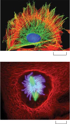 NESTE CAPÍTULO FUNÇÃO E ORIGEM DO CITOESQUELETO ACTINA E PROTEÍNAS DE LIGAÇÃO À ACTINA MIOSINA E ACTINA MICROTÚBULOS FILAMENTOS INTERMEDIÁRIOS E SEPTINAS POLARIZAÇÃO E MIGRAÇÃO CELULAR Citoesqueleto CAPÍTULO 16 Para que as células funcionem de forma adequada, elas devem se organizar no espaço e interagir mecanicamente uma com a outra e com o ambiente ao seu redor. Elas devem apresentar uma conformação correta, ser fisicamente robustas e estar estruturadas de forma adequada internamente. Muitas células também devem ser capazes de modificar sua forma e migrar para outros locais. Além disso, toda célula deve ser capaz de reorgani- zar seus componentes internos como decorrência dos processos de crescimento, divisão e/ou adaptação a mudanças no ambiente. Essas funções espaciais e mecânicas depen- dem de um incrível sistema de filamentos chamado citoesqueleto (Figura 16-1). As diversas funções do citoesqueleto dependem da atuação das três famílias de proteínas de filamento – filamentos de actina, microtúbulos e filamentos intermediários. Cada tipo de filamento possui funções biológicas, propriedades mecânicas e dinâmicas distintas; no entanto certas características fundamentais são comuns a todos eles. Da mesma forma que necessitamos da ação conjunta de nossos tendões, ossos e músculos, os três sistemas de filamentos do citoesqueleto devem atuar coletivamente para fornecer a uma determinada célula sua resistência, forma e capacidade de locomoção. Neste capítulo, descrevemos a função e a conservação dos três principais sistemas de filamentos. Vamos explicar os princípios básicos subjacentes à associação e dissocia- ção dos filamentos, e como outras proteínas interagem com os filamentos alterando a sua dinâmica, permitindo que a célula estabeleça e mantenha sua organização interna, para dar forma e remodelar a sua superfície e para mover organelas de forma controlada de um lugar para outro. Finalmente, discutiremos como a integração e a regulação do citoesqueleto permite que uma célula mova-se para outros locais. FUNÇÃO E ORIGEM DO CITOESQUELETO Os três principais filamentos do citoesqueleto são responsáveis por diferentes aspectos da organização espacial e propriedades mecânicas da célula. Os filamentos de actina de- terminam a forma da superfície da célula e são necessários para a locomoção das células como um todo; eles também conduzem a divisão de uma célula em duas. Os microtúbu- los determinam o posicionamento das organelas delimitadas por membrana, promovem o transporte intracelular e formam o fuso mitótico que segrega os cromossomos durante a divisão celular. Os filamentos intermediários proporcionam resistência mecânica. To- dos esses filamentos do citoesqueleto interagem com centenas de proteínas acessórias que regulam e ligam os filamentos uns aos outros e a outros componentes da célula. As proteínas acessórias são essenciais para a polimerização controlada dos filamentos do citoesqueleto em locais específicos, e incluem as proteínas motoras, incríveis máquinas moleculares que convertem a energia da hidrólise de ATP em força mecânica e que po- dem mover organelas ao longo dos filamentos ou mover os próprios filamentos. Nesta seção, discutiremos as características gerais das proteínas que formam os filamentos do citoesqueleto. Focaremos na sua capacidade para formar estruturas in- trinsecamente polarizadas e auto-organizadas que são altamente dinâmicas, permitindo que a célula modifique rapidamente a estrutura e a função do citoesqueleto sob diferen- tes condições. Figura 16-1 O citoesqueleto. (A) Uma célula em cultura foi fixada e marcada para mostrar seus arranjos cito- plasmáticos de microtúbulos (verde) e de filamentos de actina (vermelho). (B) Esta célula em divisão foi marcada para mostrar seus microtúbulos do fuso (verde) e a rede de filamentos intermediários (vermelho). O DNA de am- bas as células está marcado em azul. (A, cortesia de Albert Tousson; B, cortesia de Conly Rieder.) 10 �m 20 �m (A) (B) 890 PARTE IV Organização interna da célula Filamentos do citoesqueleto adaptam-se para formar estruturas estáveis ou dinâmicas Os sistemas do citoesqueleto são dinâmicos e adaptáveis, organizados de tal forma que podem ser melhor comparados a uma trilha de formigas do que a uma grande via ex- pressa. Uma trilha de formigas pode persistir por várias horas do ninho até um delicioso local de piquenique, mas, considerando-se uma única formiga nessa trilha, teremos cer- tamente que afirmar que ela não se encontra estática. Se as formigas de reconhecimento encontrarem uma nova e melhor fonte de alimento, ou se os turistas limparem o local e terminarem seu piquenique, a estrutura dinâmica adaptar-se-á a uma velocidade es- tonteante. De modo semelhante, grandes estruturas citoesqueléticas podem persistir ou sofrer modificações de acordo com as necessidades, podendo apresentar uma duração que varia de menos de um minuto ao período total de vida da célula. No entanto, os com- ponentes macromoleculares individuais que compõem estas estruturas encontram-se sob um fluxo constante. Assim, da mesma forma que ocorre quando existe uma altera- ção na trilha das formigas, o rearranjo estrutural em uma célula requer uma quantidade de energia extra relativamente pequena quando as condições sofrem alteração. A regulação do comportamento dinâmico e a polimerização dos filamentos do cito- esqueleto permitem que a célula eucariótica construa uma enorme variedade de estruturas a partir dos três sistemas básicos de filamentos. As fotomicrografias do Painel 16-1 ilustram algumas dessas estruturas. Os filamentos de actina revestem a face interna da membrana plasmática de células animais, conferindo resistência e forma a essa fina bicapa lipídica. Eles também formam diversos tipos de projeções na superfície das células.