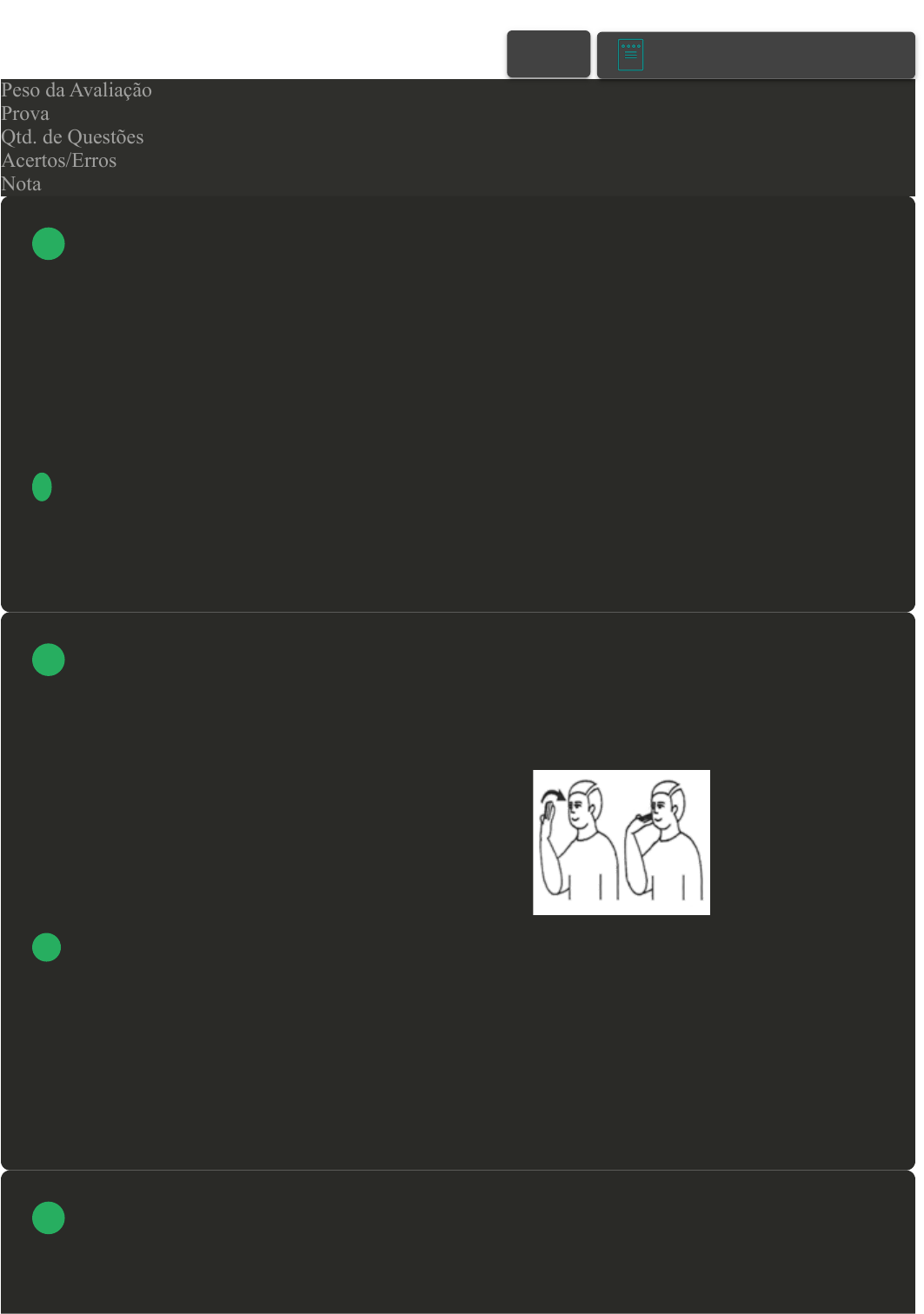 25/08/2023, 16:35 Avaliação II - Individual about:blank 1/5 Prova Impressa GABARITO | Avaliação II - Individual (Cod.:655693) Peso da Avaliação 1,50 Prova 26136962 Qtd. de Questões 10 Acertos/Erros 10/0 Nota 10,00 Segundo os estudos linguísticos, para dar significado a uma língua, existe um sistema de representação ou símbolos que resulta em uma escrita dessa língua. Na Libras também encontramos símbolos para representar sua escrita criada nos Estados Unidos, por volta do ano de 1974. Sobre essa escrita, assinale a alternativa CORRETA: A Registros mostram que os pesquisadores dos Estados Unidos com um grupo de surdos aprendendo a escrita dos sinais, chamada "sign línguas". B Com base nesses registros, pesquisadores dos Estados Unidos com um grupo de surdos, aprenderam a escrita dos sinais, chamada "sinais vivos". C Com base nesses registros, pesquisadores dos Estados Unidos com um grupo de surdos, aprenderam a escrita dos sinais, chamada "sign writing". D Registros de pesquisadores dos Estados Unidos, ouvintes e um grupo de surdos aprenderam a escrita dos sinais, chamada "Sign sinais". Cada sinal em Libras possui característica própria, geralmente se remete a uma letra, palavra, objeto etc. Conforme a frase que está sendo feita, o sinal pode ter sentidos diferentes. Observe a imagem a seguir e assinale a alternativa CORRETA: FONTE DA IMAGEM: CAPOVILLA, Fernando Cesar; RAPHAEL, Walkíria Duarte. Dicionário Enciclopédico ilustrado trilíngue. São Paulo: EDUSP, 2001. A Palavra passado. B Palavra estudar. C Palavra fedido. D Palavra laranja. Sabemos que para adquirir uma nova língua, precisamos de muito estudo e dedicação para a realização deste objetivo. Para os ouvintes, aprender Libras é como aprender uma: A Nova forma de se relacionar. VOLTAR A+ Alterar modo de visualização 1 2 3 25/08/2023, 16:35 Avaliação II - Individual about:blank 2/5 B Terceira língua. C Segunda língua. D Língua estrangeira. A Libras possui autonomia estrutural, ou seja, ela não é um simples soletramento ou tradução das palavras do português. A Libras possui sistema de gramática, morfologia própria da língua. Quanto aos sinais da Libras, analise as seguintes sentenças: I- Sinais icônicos: esses tipos de sinais representam a imagem igual ao formato do objeto. II- Sinais arbitrários: são os sinais que não apresentam nenhuma semelhança com o objeto. III- Sinais icônicos: são os sinais que mudam de significado, dependendo do local do corpo onde ele é realizado. IV- Sinais arbitrários: são os sinais que representam a imagem igual ao formato do objeto. Agora, assinale a alternativa CORRETA: A As sentenças I e II estão corretas. B As sentenças II e III estão corretas. C Somente a sentença IV está correta. D As sentenças III e IV estão corretas. A Libras é a Língua Brasileira de Sinais usada para a comunicação entre surdos e ouvintes. Nela usamos os sinais como forma de comunicação. Com base na imagem a seguir, assinale a alternativa CORRETA: FONTE DA IMAGEM: CAPOVILLA, Fernando Cesar; RAPHAEL, Walkiria Duarte. Dicionário Enciclopédio ilustrado trilíngue. São Paulo: EDUSP, 2001. A Trabalhar. B Vir. C Idade. D Estudar. 4 5 25/08/2023, 16:35 Avaliação II - Individual about:blank 3/5 Os classificadores são descritos pela literatura em língua de sinais como um fenômeno que decorre de um grupo de procedimentos verbais e não verbais ou formas usadas para descrever um determinado item lexical que não há em língua de sinais. Sobre o uso de classificadores durante a comunicação em Língua de Sinais, assinale a alternativa INCORRETA: FONTE: https://encrypted-tbn0.gstatic.com/images? q=tbn%3AANd9GcRKk08M6Ht1tS8nh5bn5bcBOFuH9OirLw7XuuRDEMyTnlOkqEP_. Acesso em: 2 dez. 2019. A São estruturas simples de serem utilizadas pela comunidade ouvinte e pouco exploradas pelos surdos. B Representam algumas características físicas, tamanho, formas e movimentos de sinais. C Refere-se aos diferentes modos como um sinal é produzido durante a comunicação. D Possui elementos visuais próprios da cultura surda, muito utilizado em contação de histórias. De nada adianta o aluno ser fluente em Libras se o professor desconhece esta forma de comunicação. Assim, é essencial que esse educador seja proficiente na Libras ou use meios que contribuam para o aprendizado do aluno. Na prática, existe um método simultâneo que se caracteriza pelo uso concomitante da fala e sinalização na ordem sintática da língua da comunidade ouvinte. Nesse processo, acontece o que chamamos de Bimodalismo ou português sinalizado. A partir destas informações, analise as sentenças a seguir: I- Se o aluno surdo dominar a Língua de Sinais e seu processo de alfabetização ocorrer somente em Língua Portuguesa, ele não terá dificuldades em reter o conhecimento. II- O bimodalismo refere-se à exposição ou ao uso de uma só língua, produzida em duas modalidades: oral e gestual, mas não é considerado o melhor método de ensino para o surdo. 6 7 25/08/2023, 16:35 Avaliação II - Individual about:blank 4/5 III- São encorajadas todas as formas de comunicação, inclusive o português sinalizado ou pidgin, para de fato ocorrer o processo de alfabetização do aluno surdo. IV- Para um melhor aproveitamento escolar, o aprendizado bilíngue deve ocorrer na seguinte ordem: Primeira - Língua Brasileira de Sinais, segunda - Língua Portuguesa. Assinale a alternativa CORRETA: A As sentenças II e III estão corretas. B As sentenças I, II e III estão corretas. C As sentenças III e IV estão corretas. D As sentenças I, III e IV estão corretas. A Língua Brasileira de Sinais é considerada uma língua viva, com sua própria estrutura, uma vez que é composta pelos níveis linguísticos semelhantes à Língua Portuguesa que integra o mundo dos ouvintes. Neste sentido, classifique V para as sentenças verdadeiras e F para as falsas: ( ) A Libras, enquanto língua gestual-visual-espacial, 