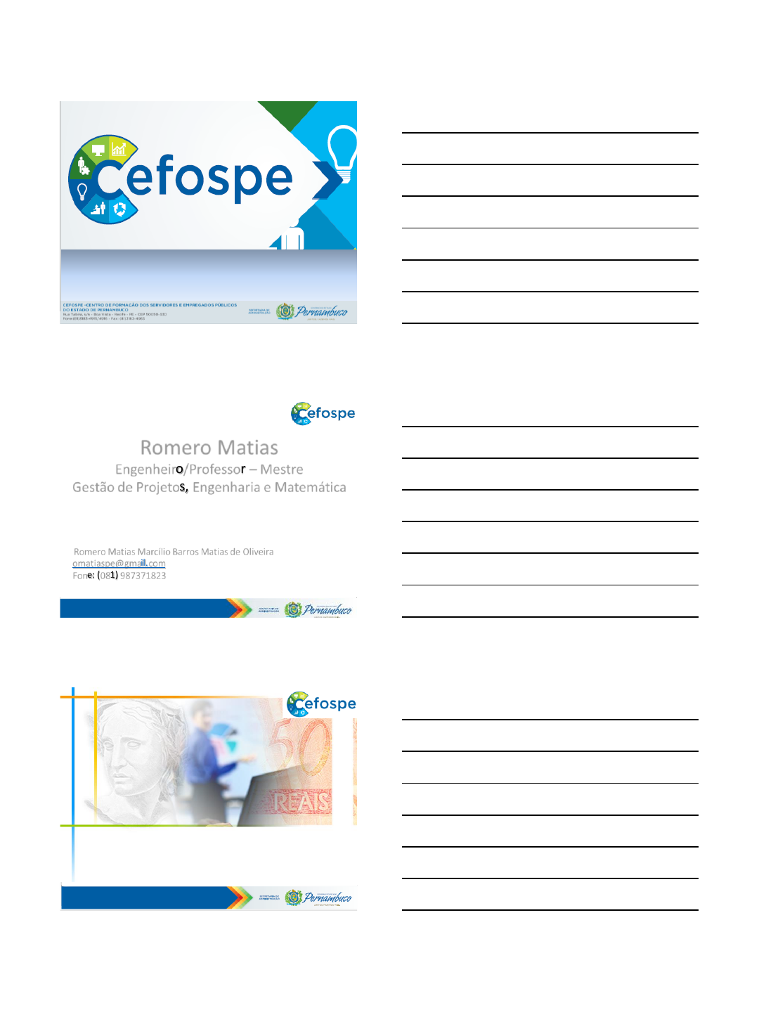 23/06/2016 1 Matemática Financeira com Foco no Modelo Gerencial Romero Matias Engenheiro/Professor – Mestre Gestão de Projetos, Engenharia e Matemática Romero Matias Marcílio Barros Matias de Oliveira omatiaspe@gmail.com Fone: (081) 987371823 Matemática Financeira mailto:omatiaspe@gmail.com 23/06/2016 2 Introdução Matemática Financeira: É a disciplina que estuda o quanto vale o dinheiro ao longo do tempo. É o instrumento usado para avaliar e regular as operações à prazo e nos permite comparar valores monetários ao longo do tempo. Numa visão aplicada, é o conjunto de técnicas e fórmulas extraídas da Matemática, com o objetivo específico de avaliar as operações de investimento e empréstimo. Ex: Taxas de juros simples e compostos, capitalizações e atualizações, mecanismos de financiamentos e aplicações de recursos, instrumentos e recursos do mercado financeiro. Por que estudar Matemática Financeira? • Para responder dúvidas frequentes do nosso dia-a- dia: • Comprar à vista ou em 3 vezes iguais? • Quanto poupar por mês, durante quantos meses, para comprar algo no futuro? • Mesmo produto com diferentes condições de pagamento. Qual a melhor opção? Entender o “Marketing Financeiro” Na experiência prática, o conceito de juros, se encontra associado a quantias monetárias, representando a remuneração ganha ao emprestar ou o custo pago ao tomar um emprestado, tendo transcorrido certo período que pode ser um dia, um mês, um ano etc. Unidades 12% ao ano = 12% a.a. 14% ao semestre = 14% a.s. 1% ao mês = a.m. JUROS 23/06/2016 3 • Remuneração do Capital • Preço que se paga pelo uso do dinheiro • Produtividade do Capital • Preço que se cobra pelo risco de ficar sem o capital • Preço que se atribui à falta de capital JUROS CONCLUSÃO: Dinheiro é um bem que pode ser negociável e possui um preço pelo uso: OS JUROS • Exemplo: Um capital de R$ 1.000,00 aplicado a uma taxa de 8% a.a. proporcionará, no final do 1o ano, o juro de: • Notação: A taxa de juros pode ser expressa em porcentagem ( 8 %a.a.) ou fração decimal (0,08 a.a.) 8 8%.1000 .1000 80 100 EXEMPLO 9 Capital pode ser definido como sendo a quantia inicial que se tem ou que se recebe. Outras denominações para capital inicial são capital (C0), principal (P), valor presente (present value) (VP), valor inicial, valor aplicado ou depósito inicial. CAPITAL INICIAL 23/06/2016 4 10 É o resultado total que se obtém da aplicação do capital, ou seja, é quanto se recebe ou se paga pelo “empréstimo” do capital. O montante também é chamado de montante (M ou S), capital final (Ct), valor futuro (future value) (VF), valor de resgate, “capital + juros”, valor final ou valor capitalizado. MONTANTE 11 Período (t ou n) é definido como sendo o espaço de tempo pelo qual o capital ficou aplicado. Este dado vem representado por um número de períodos que podem ser, por exemplo, dias, meses, trimestres ou anos. Representamos o número de períodos pela letra n, mas ele também pode ser identificado pela letra t, de tempo. PERÍODO Na resolução de problemas de Matemática Financeira, pode-se adotar duas convenções para a contagem do prazo das aplicações. • ANO CIVIL (ou ano calendário) O ano terá 365 ou 366 dias e os meses 31, 30 29 ou 28 dias (dependendo do mês considerado e do ano ser bisexto ou não) • ANO COMERCIAL – O ano terá 360 dias e os meses 30 dias. PERÍODO 23/06/2016 5 13 • Nas fórmulas de matemática financeira, tanto o prazo da operação como a taxa de juros devem necessariamente estar expressos na mesma unidade de tempo. • Os critérios de transformação do prazo e da taxa para a mesma unidade de tempo podem ser efetuados através das regras de juros simples (média aritmética) e de juros compostos (média geométrica), dependendo do regime de capitalização definido para a operação. REGRAS BÁSICAS 14 Os critérios (regras) de capitalização demonstram como os juros são transformados e sucessivamente incorporados ao capital no decorrer do tempo. Nesta conceituação podem ser identificados dois regimes de capitalização dos juros: simples (ou linear) e composto (ou exponencial). CRITÉRIOS DE CAPITALIZAÇÃO DOS JUROS Juros Simples: Nessa hipótese os juros de cada período são calculados sempre em função do capital inicial empregado. Exemplo: Qual o montante acumulado em 3 meses a uma taxa de 20% a.m., no regime de juros simples, a partir de um capital inicial de R$ 10.000,00? Período Juros Montante 0 0 10.000 1 2.000 12.000 2 2.000 14.000 3 2.000 16.000 ........ ................ ............ n 2.000 10.000 + 2000.n JUROS SIMPLES 23/06/2016 6 Assim temos: e e onde M = P + J No caso anterior, P = 10.000,00 , i = 0,2 a.m. e n = 3 logo, M = 10000. (1+0,2.3) M = 16.000,00 Simbologia: P = Principal ou Valor Inicial M = Montante ou Valor Final J = Juros da aplicação obtidos durante a aplicação n = número de período i = Taxa de juros efetiva em cada período . .J P i n .(1 . )M P i n JUROS SIMPLES 17 Suponha um indivíduo que deposita R$1.000,00 em um banco que lhe promete juros simples de 10% a.a. Qual será seu saldo ao final de 4 anos? Ano Saldo inicial Juros Saldo final 1 2 3 4 1.000 1.100 1.200 1.300 0,1 x 1.000 = 100 0,1 x 1.000 = 100 0,1 x 1.000 = 100 0,1 x 1.000 = 100 1.100 1.200 1.300 1.400 EXEMPLO 18 EXEMPLO 23/06/2016 7 19 O regime de capitalização simples comporta-se como se fosse uma progressão aritmética (PA), crescendo os juros de forma linear ao longo do tempo. Neste critério, os juros apenas incidem sobre o capital inicial da operação (aplicação ou empréstimo), não se registrando juros sobre o saldo dos juros acumulados. JUROS SIMPLES Se limita a: Cobrança dos juros pela utilização dos limites nos cheques especiais, Desconto de duplicatas e promissórias, Pró-rata na atualização de dívidas, Concursos Públicos que restringem a utilização de calculadoras financeiras. Pro-rata: é u