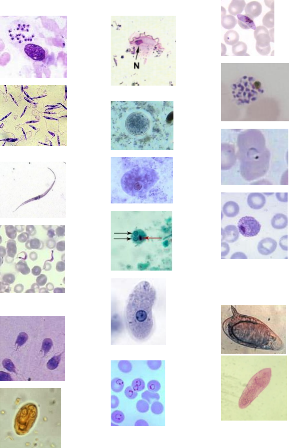 Protozoários: 1. Leishmaniose, amastigota progastigota 2. Doença de Chagas, epimastigota tripomastigota sanguíneo 3. Giardíase, trofozoíto cisto 4. Tricomoníase, trofozoíto 5. Amebíase, cisto E. coli trofozoíto E. coli cisto E. díspar trofozoíto E. díspar 6. Malária e trofozoíto P. falciparum gametócito P. falciparum esquizonte P. Falciparum trofozoíto P. vivax esquizonte P. vivax 7. Toxoplasmose Helmintos: 1. Esquistossomose, ovo miracídio cercaria vermes adultos macho adulto 2. Teníase/Cisticercose, proglote grávida T. solium ovo 3. Himenolepíase, ovo H. nana Escolex H. nana ovo H. diminuta escolex H. diminuta 4. Ascaridíase, ovo fértil c/ membrana ovo infértil com membrana ovo decorticado verme adulto femea e macho 5. Ancilostomose, ovo 6. Tricuríase, ovo adulto macho e fêmea 7. Enterobiose, ovo femea adulta 8. Estrongiloidíase e larva rabdtoide larva filarioide cauda entalhada 9. Filarídeos microfilária Panstrongylus sp. Triatoma sp. Rhodnius sp. Lutzomya macho Lutzomya fêmea Anopheles fêmea Anopheles macho simulium sp