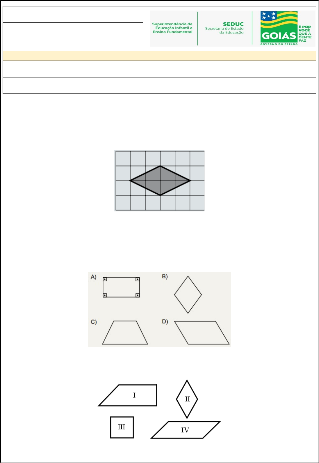 ENSINO FUNDAMENTAL MATEMÁTICA 9ª ANO A/B ATIVIDADE DE RECOMPOSIÇÃO DE HABILIDADES COLÉGIO ESTADUAL MACOB RODRIGUES GALVÃO TEMA: QUADRILÁTEROS, COORDENADAS CARTESIANAS. D4 - Identificar relação entre quadriláteros por meio de suas propriedades D9 - Interpretar informações apresentadas por meio de coordenadas cartesianas. D4 - Identificar relação entre quadriláteros por meio de suas propriedades 1. Veja a figura que Marcos fez na malha quadriculada abaixo. Essa figura é um A) losango. B) quadrado. C) retângulo. D) trapézio. 2. Qual das Figuras abaixo é um retângulo? 3. (P.B. - 2013). Uma loja de materiais para construção coloca em exposição os seguintes formatos de janelas como mostram as figuras abaixo: Um cliente exige um modelo com as seguintes características: · Dois pares de lados paralelos; · Os ângulos internos de 90º. O modelo solicitado pelo cliente foi: A) I B) II B) III C) IV 4. (Mat. Aplicada - Seduc-GO). 08. Para fazer um trabalho de matemática, Marina pegou uma cartolina e traçou duas retas paralelas onde desenhou alguns quadriláteros, que identificou com os nomes: figura 1, figura 2, figura 3 e figura 4. Em qual figura Marina desenhou o trapézio? A) 1 B) 2 C) 3 D) 4 5. Observe as figuras a seguir: Analisando essas figuras, podemos dizer que, (A) o retângulo e o quadrado não são quadriláteros. (B) o retângulo tem todos os lados com a mesma medida. (C) os ângulos do quadrado e do retângulo são iguais. (D) somente o retângulo é um quadrilátero. 6. (SAEGO-2012 - Adaptado). Patrícia na aula de artes desenhou um barquinho como representado na figura abaixo: O quadrilátero que Patrícia utilizou no seu desenho é A) quadrado B) retângulo C) paralelogramo D) trapézio. 7. (SAEPE). O convite do aniversário de Ana tem a forma de um quadrilátero com dois lados opostos paralelos e dois não paralelos. O convite tem a forma de um A) losango. B) quadrado. C) retângulo. D) trapézio. D9 - Interpretar informações apresentadas por meio de coordenadas cartesianas. 8. Sobre o plano cartesiano, julgue as afirmativas a seguir: I - O eixo horizontal é conhecido também como eixo das abscissas. II - O ponto A (-5, 3) é um ponto do terceiro quadrante. III - O eixo vertical é conhecido também como eixo das coordenadas. Podemos afirmar que: A) Somente a afirmativa I é verdadeira. B) Somente a afirmativa II é verdadeira. C) Somente a afirmativa III é verdadeira. D) Somente as afirmativas II e III são verdadeiras. E) Somente as afirmativas I e III são verdadeiras. 9. Em um plano cartesiano, foram marcados os pontos A (2, 3), B(-1, 2), C (2, -3) e D (1, 0). O único quadrante em que não há nenhum ponto marcado é: A) I B) II C) III D) IV 10. (USP) Uma das diagonais de um quadrado tem extremidades A (1; 1) e C (3; 3). As coordenadas dos outros dois vértices são: A) (2; 3) e (3; 2) B) (3; 1) e (1; 3) C) (3; 0) e (1; 4) D) (5; 2) e (4; 1) E) nenhuma das anteriores 11. No plano cartesiano a seguir, estão marcados alguns pontos. Podemos afirmar que pertencem ao quarto quadrante os pontos: A) G e E B) D e A C) D, A e J D) F e J E) G, E, O e B 12. Nas aulas de geografia, a professora Kárita registrou num sistema ortogonal as coordenadas de alguns pontos estratégicos da cidade, em que os valores da abscissa e da ordenada são dados em quilômetros. Além disso, a origem é o centro da cidade. Analisando o plano, as coordenadas do banco são: A) (2, -3) B) (-3, 2) C) (3, 2) D) (2, 3) E) (2, -3) 13. Sobre o plano cartesiano, julgue as afirmativas a seguir: I - Os pontos no plano cartesiano são conhecidos como par ordenado. II - No primeiro quadrante, o par ordenado (x, y) é composto por dois números positivos. III - No quarto quadrante, o par ordenado (x, y) é composto por dois números negativos. As afirmativas I, II e III são, respectivamente: A) Verdadeira, falsa e verdadeira. B) Falsa, verdadeira e verdadeira. C) Verdadeira, verdadeira e falsa. D) Falsa, verdadeira e falsa. E) Verdadeira, verdadeira e verdadeira. 14. Localize os pares ordenados no plano cartesiano: a) (-9, 4) b) (8, 3) c) (0, -3) d) (-4, -9) e) (8, 0)