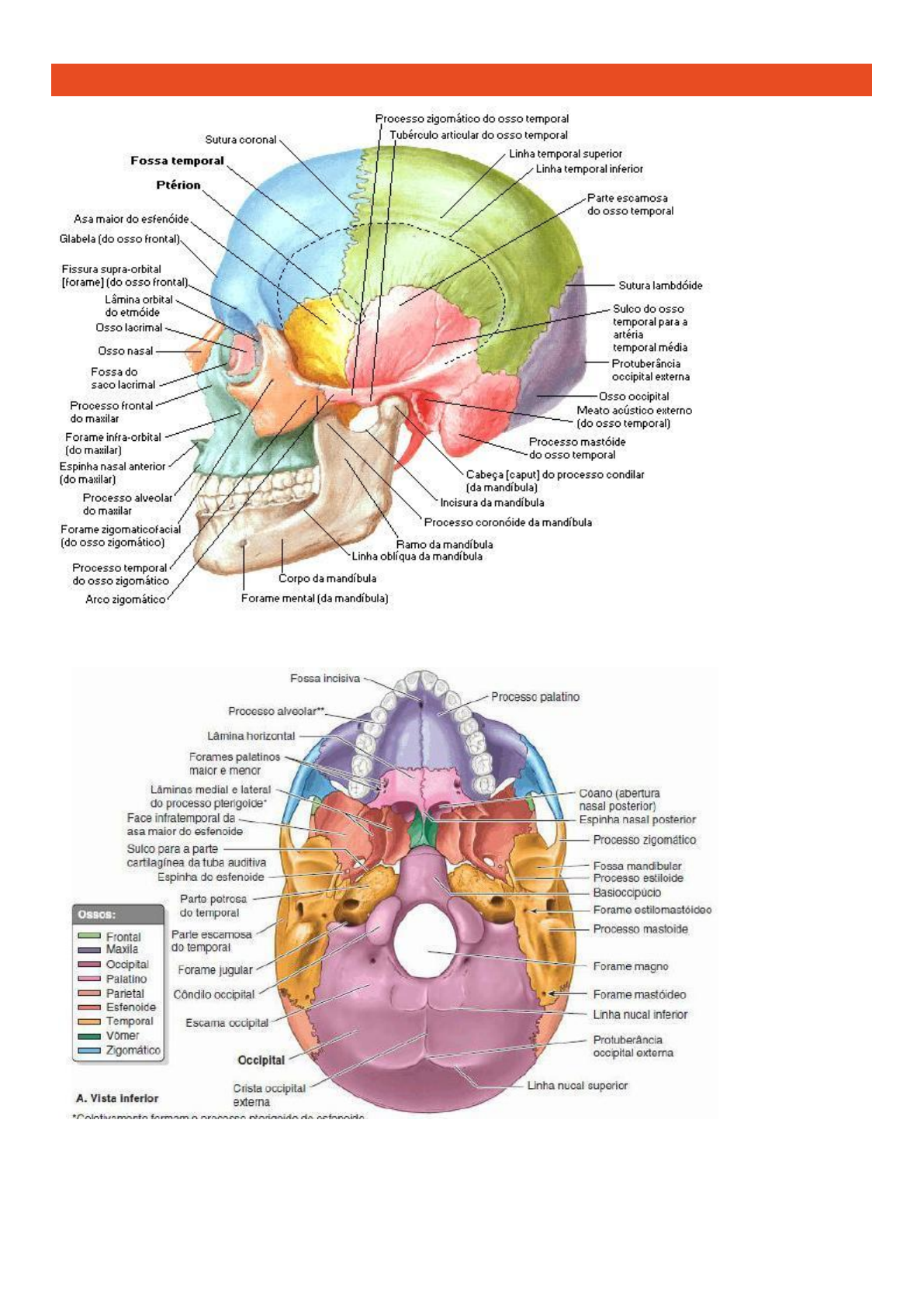 ANATOMIA DA CABEÇA E PESCOÇO: OSTEOLOGIA NEUROCRÂN0 Os oito ossos cranianos são divididos entre calvário (calota) e base. Cada uma dessas duas áreas é constituída principalmente de quatro ossos. Calvário (calota) 1. Frontal 2. Parietal direito 3. Parietal esquerdo 4. Occipital Base 5. Temporal direito 6. Temporal esquerdo 7. Esfenóide 8. Etmóide FRONTAL Esse osso, que forma a fronte, a parte superior, o teto da órbita ocular e a maior parte da fossa craniana anterior. É um osso pneumático (seio frontal) e possui uma pequena depressão entre os arcos superciliares denominada Glabela. Vista anterior Vista inferior PARIETAIS Os ossos parietais, formam os lados e a abóboda craniana. É um osso par, possuindo dois lados: esquerdo e direito. Estes lados são unidos pela sutura Sagital. É um osso achatado. Vista lateral Vista Medial OCCIPTAL Localizado na parte posterior do crânio e, é dividido em quatro partes: uma basilar, uma escamosa e duas laterais. O principal acidente anatômico encontrado é o forame magno. A região delimitada pelo forame, além de ser o local de comunicação entre a cavidade craniana e o canal vertebral, é também onde a medula espinhal se converte em medula oblonga – contínua com o bulbo do tronco encefálico. Pelo forame magno passam as meninges, raízes espinhais, ramos meníngeos do primeiro ao terceiro nervos cervicais, artérias vertebrais e artérias espinhais. Vista superior Vista inferior: TEMPORAIS O osso temporal é um osso par que forma as laterais do crânio ou têmporas. É um osso irregular e situa-se na região lateral e inferior do crânio, constituem as paredes laterais do crânio e na sua cavidade timpânica localizam-se os 3 ossículos da orelha média. A saliência óssea atrás da orelha : Apófise Mastoide. Os principais acidentes anatômicos encontrados são: ● Processo mastóideo; ● Parte petrosa; ● Parte escamosa; ● M.A.E. (meato acústico externo); ● M.A.I. (meato acústico interno); ● Processo estilóide; ● Processo zigomático. Vista lateral Vista medial Vista inferior ESFENÓIDE Osso situado na base do crânio na frente das partes temporal e basilar do osso occipital. Formato semelhante a uma borboleta ou morcego com as asas estendidas. Os principais acidentes anatômicos encontrados são: Corpo; ● Asa maior; ● Asa menor; ● Processo clinóide anterior; ● Processo clinóide posterior; ● Fossa hipofisária (Sela turca); ● Canal óptico; ● Seio esfenoidal. Vista anterior Vista posterior FOSSA HIPOFISÁRIA (SELA TURCA) A depressão da sela turca e o dorso da sela são mais bem vistos no perfil. Os processos clinóides anteriores são superiores a sela turca, e os processos clinóides posteriores são vistos como pequenas extensões localizadas acima do dorso da sela. Posterior ao dorso em direção ao forame magno, localiza-se o Clivo. Vista superior ETMÓIDE Osso denominado curto. Este osso localiza-se na base do crânio, na zona anterior medial. A lâmina horizontal é também chamada lâmina crivosa devido aos crivos (orifícios) que possui. Os principais acidentes anatômicos encontrados são: ● Lâmina perpendicular; ● Concha nasal média; ● Concha nasal superior; ● Crista etmoidal; ● Células etmoidais (seio etmoidal); ● Lâmina orbital; ● Lâmina cribiforme ou crivosa. Vista superior Vista lateral MÚSCULOS DA FACE MÚSCULOS DA MASTIGAÇÃO A fibra muscular contrai, ele sempre puxa, nunca empurra! Masseter, temporal pterigoideo medial e lateral e digástrico. O masseter e o temporal são superficiais e de fácil palpação. MASSETER � Porção superficial= margem inferior do arco zigomático até a sutura zigomático temporal � Porção Profunda= de toda margem inferior do arco zigomático. TEMPORAL PTERIGOIDEOS PTERIGOIDEO MEDIAL Origem: Fossa pterigoidea, face medial da lâmina lateral do processo pterigoide. PTERIGOIDEO LATERAL OSSO HIOIDE: Área de atuação do dentista: até o osso hioide; MUSCULO DIGÁSTRICO: MUSCULO ESTILO-HIOIDEO MÚSCULO GÊNIO-HIÓIDEO MÚSCULO MILO-HIÓIDEO ARTICULAÇÃO TEMPOROMANDIBULAR(ATM) ● Articulação sinovial (cápsula articular/ membrana sinovial/ liquido sinovial) ● Possui superfície articulares recobertas por tecido fibroso avascular; ● Independência funcional entre ATM direita e esquerda (articulação dupla) ● Disco articular interposto entre côndilo mandibular e fossa mandibular(fibrocartilagem) REPOSIÇÃO MUSCULOS CULTÂNEOS MÚSCULO OCCIPITOFRONTAL MÚSCULOS ORBICULARES DOS OLHOS -Fecha as Pálpebras comprimem o saco lacrimal, e movimenta os supercílios MÚSCULO PRÓCERO -Abaixa a pele da fronte e do supercílio CORRUGADOR DO SUPERCÍLIO -Abaixa a pele da fronte e dos supercílios MÚSCULO NASAL -Dilatador do nariz MÚSCULO ORBICULAR DA BOCA contração bilateral e uniforme do orbicular da boca vai trazer os lábios juntos e fechar a boca. MÚSCULO LEVANTADOR DO LÁBIO SUPERIOR -Levanta o lábio superior, e o levanta-o um pouco para frente; LEVANTADOR DO LÁBIO SUPERIOR E ASA DO NARIZ - Dilata a narina e levanta o lábio superior e a asa do nariz MÚSCULO ZIGOMÁTICO MENOR -Auxilia na elevação do lábio superior e acentua o sulco nasolabial MÚSCULO BUCINADOR Deprime e comprime o ângulo da boca (expressão de tristeza) MÚSCULO ZIGOMÁTICO MAIOR Levanta o lábio Superior, e retrai o ângulo da boca lateralmente (riso forçado) MÚSCULO LEVANTADOR DO ÂNGULO DA BOCA Eleva o ângulo da boca e acentua o sulco nasolabial MÚSCULO RISÓRIO Responsável pelo sorriso, mas um “sorriso falso”. ABAIXADOR (DEPRESSOR) DO ÂNGULO DA BOCA, -Repuxa o lábio inferior para baixo e lateralmente ( expressão irônica) MÚSCULO ABAIXADOR DO LÁBIO INFERIOR MÚSCULO MENTUAL MÚSCULOS ANTERIORES DO PESCOÇO Platisma e Músculo esternocleidomastoideo