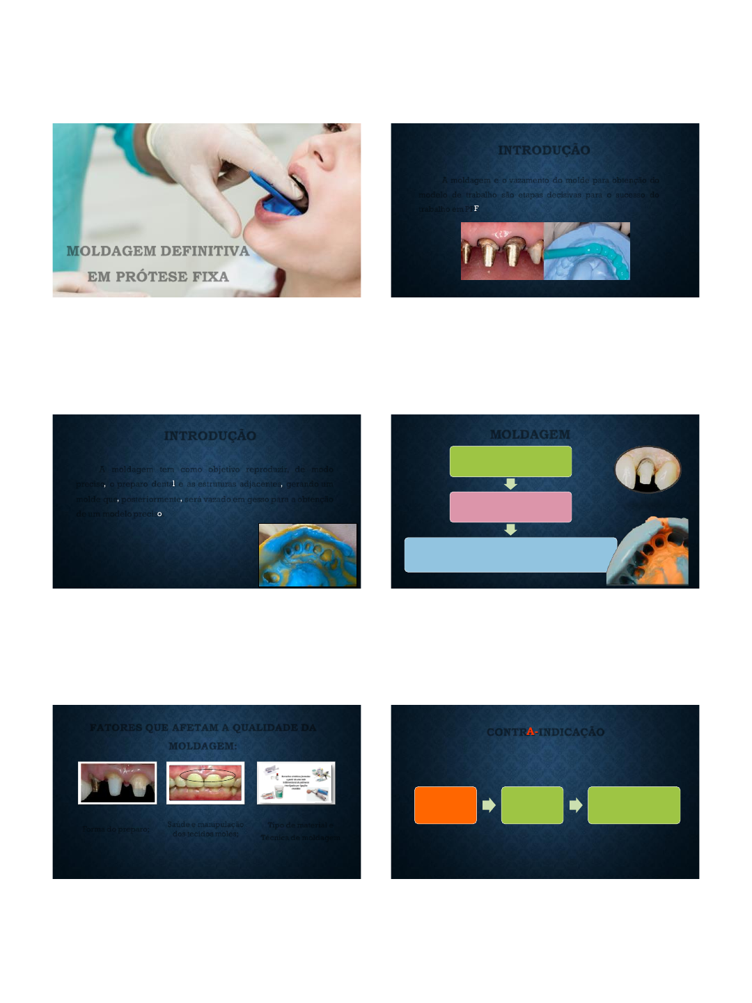 23/11/2022 1 MOLDAGEM DEFINITIVA EM PRÓTESE FIXA INTRODUÇÃO A moldagem e o vazamento do molde para obtenção do modelo de trabalho são etapas decisivas para o sucesso do trabalho em PPF. INTRODUÇÃO A moldagem tem como objetivo reproduzir, de modo preciso, o preparo dental e as estruturas adjacentes, gerando um molde que, posteriormente, será vazado em gesso para a obtenção de um modelo preciso. MOLDAGEM Qualidade da moldagem Qualidade do preparo (término) Margens devem estar nítidas, sem imperfeições, presença de continuidade e com estado de saúde do tecido gengival. FATORES QUE AFETAM A QUALIDADE DA MOLDAGEM: Forma do preparo; Saúde e manipulação dos tecidos moles; Tipo de material e Técnica de moldagem Tecido gengival inflamado Pois apresenta intenso exsudato sulcular Dificulta o afastamento e a reprodução do término do preparo CONTRA-INDICAÇÃO 23/11/2022 2 MOLDAGEM COM RETRAÇÃO GENGIVAL ➢ Cuidado para a moldagem não causar danos importantes ao tecido gengival. ➢ O sulco gengival e o epitélio juncional apresentam, em média, 0,69mm e 0,97mm de comprimento, respectivamente, e a terminação gengival do preparo está aproximadamente 0,5 mm dentro do sulco, sobra apenas entre 0,19 e 0,47 mm de sulco abaixo do término do preparo. PRINCÍPIOS BIOLÓGICOS O afastamento ou a retração gengival permite que o material de moldagem possa ser introduzido no interior do sulco gengival e reproduzir fielmente o término do preparo. Colocação dos fios Aplicação do material leve no sulco MOLDAGEM COM RETRAÇÃO GENGIVAL TÉCNICAS DE MOLDAGEM ➢A habilidade do profissional e o domínio da técnica e do material de moldagem são fatores determinantes para a realização desse procedimento com sucesso. ➢A região mais difícil a ser moldada é a região do término do preparo, por estar, na grande maioria dos casos, localizado no interior do sulco gengival. TÉCNICAS DE MOLDAGEM As técnicas mais utilizadas para promover a retração gengival empregam: ➢Meios mecânicos: casquete individual ➢Mecânicos-químicos: fios retratores ➢É necessário que o tecido gengival seja afastado do dente para permitir que o material de moldagem possa penetrar no sulco e reproduzir corretamente o término do preparo nessa região. Esse procedimento é conhecido como afastamento ou retração gengival. MOLDAGEM COM FIO RETRATOR 23/11/2022 3 MOLDAGEM COM FIO RETRATOR ➢A seleção do diâmetro do fio deve respeitar as distâncias biológicas, pois, se for muito pressionado, pode causar o rompimento do epitélio juncional. ➢Deve-se também avaliar a quantidade de gengiva inserida que envolve os dentes que serão moldados, pois pode ocorrer recessão gengival se a quantidadede gengiva inserida for menor do que 2 mm. MOLDAGEM COM FIO RETRATOR ➢Os fios apresentam diferentes diâmetros; ➢A seleção é feita em função das características morfológicas do sulco e da quantidade de gengiva inserida; ➢Fios de retração da Ultrapak-Ultradent tem, entre outros, tamanhos 0, 00 e 000, com diâmetros aproximados de 1,2, 0,8 e 0,5 mm. MOLDAGEM COM FIO RETRATOR ➢Os fios retratores geralmente são usados em associação com soluções químicas que diminuem o fluxo do fluido sulcular e o sangramento, agindo como auxiliares indiretos na dilatação sulcular. ➢A solução de cloreto de alumínio é a mais indicada, pois, além de sua eficácia, não apresenta efeitos colaterais, como taquicardia, aumento da pressão arterial e da frequência cardíaca, entre outros. MOLDAGEM COM FIO RETRATOR ➢Podem ser empregados um ou dois fios, e a indicação de uma outra técnica depende do profissional. No entanto, em sulcos rasos, a inserção de dois fios pode provocar grandes traumas teciduais, sendo indicado o uso de apenas um fio. ➢Moldagem com um fio. ➢Moldagem com dois fios. MOLDAGEM COM UM FIO MOLDAGEM COM UM FIO 23/11/2022 4 MISTURA MANUAL MANIPULAÇÃO SILICONA DE CONDENSAÇÃO SILICONE DE CONDENSAÇÃO ▪ Utilizadas para moldagem de trabalho. ▪ Formas de apresentação: - Pasta base - Pasta catalisadora - Massa pesada 23/11/2022 5 SILICONE DE CONDENSAÇÃO Pesado Leve Tempo de Trabalho • 2 a 3 minutos Tempo de Presa • 5 a 6 minutos Vazamento do Gesso • Imediato Tempo de Trabalho • 1 a 2 minutos Tempo de Presa • 3 a 4 minutos Vazamento do Gesso • Imediato SILICONE DE CONDENSAÇÃO VANTAGENS • Melhores propriedades elásticas na remoção; • Resistência ao rasgamento; • Biocompatibilidade; • Boa reprodução de detalhes; • Tempo de trabalho e polimerização adequado; • Odor agradável. DESVANTAGENS • Precisão inadequada se não for vazado imediatamente; • Custo elevado. SILICONE DE ADIÇÃO ▪ Liberação de gás hidrogênio, que pode produzir microbolhas negativas no gesso que foi vazado imediatamente após a obtenção do molde. ▪ Como forma de compensar a liberação de hidrogênio deve-se aguardar no mínimo 1 hora para vazar o molde. ▪ Disponível em várias consistências: manual ou automistura. SILICONE DE ADIÇÃO SILICONE DE ADIÇÃO MANIPULAÇÃO ▪ A contaminação por enxofre (sulfetos) proveniente de luvas de látex e de algumas luvas de vinil inibe a cura do material. ▪ Essa contaminação é tão nociva que mesmo o toque com luva nas áreas a serem moldadas pode inibir a cura do material, algumas vezes em áreas críticas. 23/11/2022 6 SILICONE DE ADIÇÃO Tempo de Trabalho • 1 a 2 minutos Tempo de Presa • 4 minutos Vazamento do Gesso • Aguardar 1 hora e pode armazenar o molde por até 1 semana. SILICONE DE ADIÇÃO VANTAGENS • Excelente estabilidade dimensional; • Excelente recuperação elástica; • Boa resistência ao rasgamento; • Ótima precisão de cópia; • Facilidade de manipulação; • Pequeno tempo de presa. DESVANTAGENS • Enxofre retarda a reação de presa. Evitar: luvas de látex, fios retratores com sulfatos férricos ou de alumínio; • Liberação de hidrogênio pode provocar bolhas 