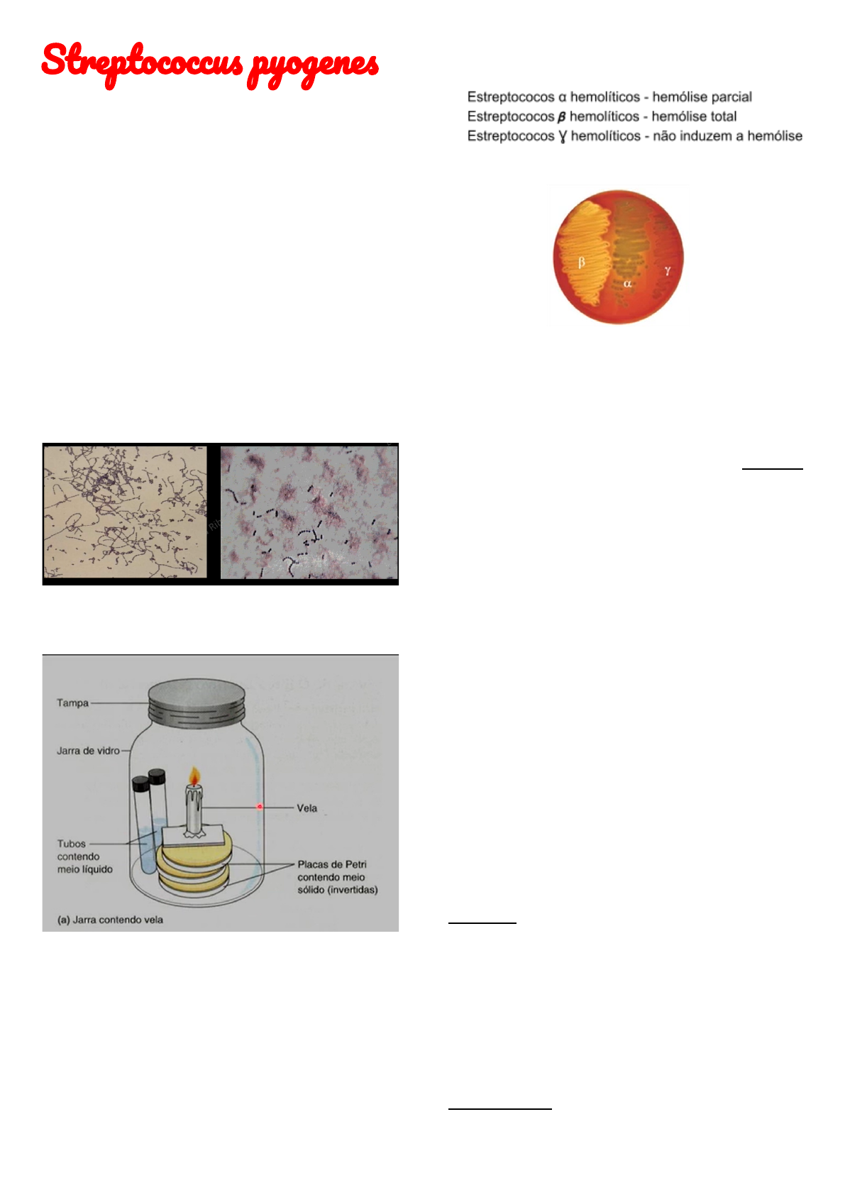 Streptococcu� pyogene� Bactéria carnívora Características do gênero Cocos gram-positivos dispostos em cadeias ou aos pares; maioria anaeróbios facultativos e capnofílicos; necessidades nutricionais complexas (para cultivo é importante os meios de culturas enriquecidos, como o ágar sangue ou ágar BHI); são catalase negativos (muitas infecções causadas por Estreptococos são confundidas com as infecções causada por Estafilococos, por isso é importante saber que são catalases negativas, características que as diferenciam. Ainda é importante saber o gênero da bactéria para o tratamento das doenças que elas ocasionam). Cultivo A vela dentro do ambiente fechado é para que o meio seja enriquecido com CO2 e favoreça o crescimento das bactérias. Classificação - Padrões hemolíticos: Streptococcus pyogenes Fazem hemólise total; também são chamados de Grupo A; possuem colônias brancas e puntiformes de 1-2mm, com zona de β- hemólise. São bactérias piogênicas. - manifestação clínica mais comum: Faringite estreptocócica, com sintomas que consistem em dor, febre alta, linfonodos aumentados, presença de secreção purulenta, tonsilite. - Epidemiologia da faringite: A via de transmissão é de pessoa a pessoa, por meio de perdigotos, com período de incubação de 2-4 dias. A população e os grupos mais susceptíveis são crianças entres 5-15 anos, apenas 20% ocorre em adultos. Tem características de distribuição sazonais durante o outono e inverno e os fatores de risco são pobreza, má-nutrição e aglomeração. Ps.: Alguns estudos identificaram que há susceptibilidade genética associada à doença, entretanto é um pouco controverso, pois uma família inteira pode manifestar a doença devido às características de transmissão. Estrutura microbiana x Fatores de virulência Cápsula: contribui para o processo de escape da bactéria do sistema imune dificultando o reconhecimento e consequentemente da fagocitose. É formada de ácido hialurônico. A sintomatologia da doença é bastante intensa, visto que a cápsula possibilita a multiplicação sem o reconhecimento do sistema imune e quando acontece o rompimento da cápsula, pela hialuronidase, a carga bacteriana já é elevada. Proteína M: Para entender a Proteína M é importante compreender porque o nosso sistema imune não ataca as células do próprio organismo ativando o sistema complemento Para que a ativação desse sistema não aconteça com as células do próprio organismo, elas apresentam uma proteína denominada Fator H em sua superfície. O Fator H impede que o c3b se ligue à superfície da célula quebrando-os. O Streptococcus apresenta a proteína M em sua superfície, que se associa ao fator H, que degrada o c3b. Em outras palavras, a proteína M sequestra o fator H, que degrada o c3b, inibindo a ativação do sistema complemento. Proteína tipo M: Nesse fator o sistema complemento deveria ser ativado pela via clássica. Uma proteína do sistema complemento se liga à região Fc do anticorpo e ativa a cascata, entretanto uma proteína tipo M se liga a essa região Fc do anticorpo e impede que o sistema complemento seja ativado e a opsonização. Proteína M e a febre reumática: a proteína M é estruturalmente idêntica às nossas proteínas da articulação, coração e sistema nervoso. Os anticorpos contra a proteína M também reconhecem as nossas estruturas causando uma doença autoimune chamada de febre reumática. Esses anticorpos reconhecem essas proteínas causando inflamação nas articulações (artrite), no coração (cardite - podendo ser assintomática à fulminante dependendo da quantidade de anticorpos e severidade do processo inflamatório), no sistema nervoso. Proteína F e ácido lipoprotéico: relacionadas à adesão dos microrganismos às nossas células. Enzimas: Estreptolisinas O (causa lise de células- molécula imunogênica - teste ASO ou ASLO), Estreptoquinase (lise de coágulos sanguíneos ocasionando em uma disseminação rápida do estreptococo nos tecidos) e a Dnase A-D (baixa viscosidade do material do abscesso facilitando a disseminação) Escarlatina: O Streptococcus é infectado por um vírus e entra no ciclo lisogênico, produzindo toxinas eritrogênicas que se comporta como um superantígeno. A escarlatina é uma infecção generalizada que causa eritema e acomete, principalmente, crianças. Outra característica da doença é a chamada boca de palhaço (o círculo oral é mais rígido e não apresenta tanta vermelhidão quanto o resto da pele) e língua de morango. Se tratada de maneira adequada à infecção na garganta, a escarlatina é consequentemente tratada. Febre reumática: doença auto imune gerada de uma complicação de uma faringite não tratada ou mal tratada por uma reação cruzada. Possibilitando, dessa forma, a permanência da estimulação antigênica e consequentemente a produção de anticorpos contra a proteína M. A incidência da febre reumática após faringite não tratada é de 3-4%. Diagnóstico da faringite Exames específicos: teste rápido para detecção de antígenos e a cultura de orofaringe para detecção bacteriana (padrão ouro). Tratamento a base de antibióticos coleta da amostra - cultivo em placa de ágar sangue (lembrar que o Streptococcus aureus é beta hemolítico) . Diagnóstico da febre reumática Alta titulação no teste ASLO e ASO e associação com os sintomas (critérios de Jones). Tratamento à base de corticóides. Às vezes os corticoides são associados a antibióticos para combater a infecção na garganta, para evitar que a pessoa seja re-infectada e a doença seja potencializada e agravada. Sinais e Sintomas Artrite presente em 70% dos casos; nódulos subcutâneos (menos de 10%), eritema marginado (menos de 10%); cardite (40-50%); coréia de sydenham (15%). Paciente com febre reumática - profilaxia antibiótica prolongada para evitar recorrência . Porque é importante saber se o pacien