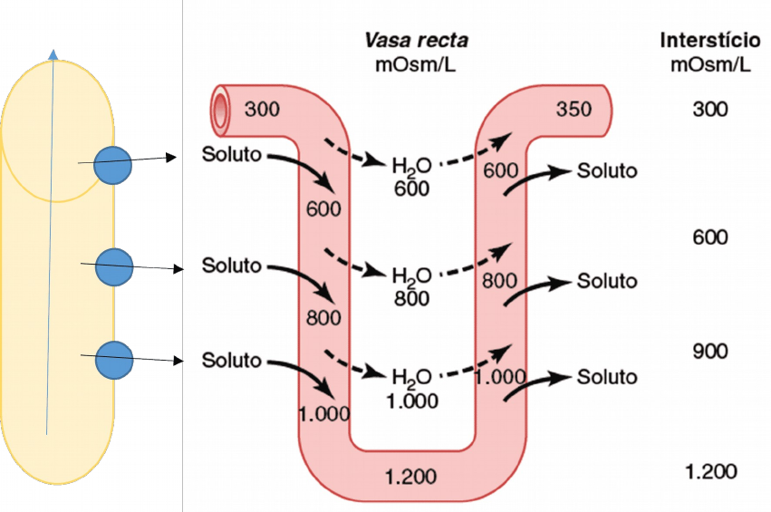 Alça de Henle: trocas por contracorrente Apresenta um ramo descendente com alta permeabilidade à água ocorrendo reabsorção passiva de água (osmose). Neste segmento ocorre ainda a secreção passiva de sais e uréia. Ao contrário, o ramo ascendente apresenta baixa permeabilidade à água e ocorre alta reabsorção por transporte ativo de sódio, cloreto e magnésio para o fluido peritubular. Na reabsorção de Na este sai da célula para o interstício + pela ação da bomba de sódio e potássio na membrana basolateral criando um gradiente elétrico para o Na na + membrana apical. Isso aciona o co-transportador Na + /K+ /2Cl - na membrana apical deslocando esses íons do fluido tubular para o interior da célula. Este transportador pode ser inibido pelos diuréticos de alça como a furosemida. O Cl - atinge o fluido intersticial através da passagem por canais na membrana basolateral a favor do gradiente de concentração e o K atravessa + canais tanto na membrana basolateral como na apical. A secreção de K e a reabsorção de Cl + - criam um potencial elétrico lúmen positivo que impulsiona os cátions para o fluido intersticial através dos espaços paracelulares.