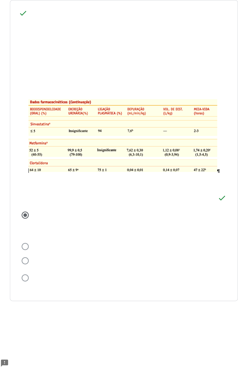 100/100 Clortalidona, pois tendo em vista que o tempo necessário para a excreção completa de um fármaco é por volta de 5 tempos de meia-vida (5-10 tempos de meia-vida), a comparação deste parâmetro entre os fármacos, com base nos dados da tabela, permite a�rmar que a clortalidona demandará mais tempo para sua excreção completa, já que apresenta o maior tempo de meia-vida (meia-vida média de 47h) Sinvastatina pois sua excreção urinária é insigni�cante Metformina pois tem o maior volume de distribuição e isso diminui a meia vida Metformina não obedece o padrão de wash out pois não tem ligação as com as proteínas plasmáticas S. César está atualmente em seguimento médico regular, e faz uso contínuo de inúmeros fármacos, dentre eles a sinvastatina (para o tratamento da dislipidemia), a metformina (para o controle da glicemia) e a clortalidona (um diurético). Analise a tabela abaixo, que contém algumas informações à respeito destes três fármacos, e a seguir responda: Qual destes três fármacos demandará mais tempo para sua excreção completa (wash out) após uma dose única? Explique, tendo em vista os dados apresentados na tabela. * 100/100 Não favorece, pois na forma molecular o fármaco será excretado. Não favorece, pois na sua forma ionizada o fármaco será mais reabsorvido. Favorece, pois na sua forma ionizada o fármaco será mais excretado. Favorece, pois na sua forma molecular o fármaco será mais reabsorvido. 100/100 Alta ligação da varfarina à albumina signi�ca mais fármaco para o tecido. Quando a aspirina desloca a varfarina, há um aumento dos níveis plasmáticos do anticoagulante livre e seus efeitos passam a ser subterapêuticos. Devido ao incremento na dose do anticoagulante, a varfarina deslocou a aspirina ligada à albumina. A concentração plasmática do anti-in�amatório livre �cou acima da faixa terapêutica, provocando sangramento. Os níveis sanguíneos da varfarina não foram monitorados, o que evidenciaria um aumento na biodisponibilidade e, portanto, na toxicidade da aspirina. Isso porque a aspirina foi deslocada da albumina pelo anticoagulante. Além do incremento na dose de varfarina, a aspirina deslocou a própria varfarina ligada à albumina. A concentração plasmática do anticoagulante livre �cou acima da faixa terapêutica, provocando hemorragia. Sua estrutura química favorece ou não a intoxicação? Por que? * Homem, 31 anos, é admitido no Pronto Atendimento referindo dispneia há 10 dias, associada a sangramento nasal, hematúria e melena há 3 dias. As manifestações mais recentes se iniciaram após um episódio gripal, quando a paciente automedicou-se com aspirina, além de aumentar a dose de varfarina por iniciativa própria. Ele usa varfarina há 7 anos devido a substituição de sua válvula cardíaca por uma artificial. Passou por exames; os valores de INR estavam alterados. O que pode ter ocorrido com esse paciente? * 100/100 Ao alcalinizar a urina com bicarbonato, o AAS aumentará sua fração molecular, sofrendo aprisionamento iônico no lúmen tubular. Ao alcalinizar a urina com bicarbonato, o AAS aumentará sua fração ionizada, havendo seu aprisionamento iônico plasma do capilar peritubular. Ao alcalinizar a urina com bicarbonato, o AAS aumentará sua fração ionizada, havendo seu aprisionamento iônico no túbulo nefrótico e eliminação. Ao alcalinizar a urina com bicarbonato, o AAS aumentará sua fração molecular sendo mais excretado pela urina. A administração de bicarbonato pode reverter esta intoxicação do fármaco. Como isto acontece? * 0/100 Pois a meia vida da azitromicina é longa (> 60h) enquanto que a meia vida da claritromicina é curta (4 h). Isso signi�ca que o tempo para atingir a Css da azitromicina é muito maior que o da claritromicina e como se deseja que os antibióticos comecem a ter seu efeito imediatamente é indicada uma dose de ataque para a azitromicina para que a Css seja atingida mais rapidamente. Pois a meia vida da claritromicina é longa (> 60h) enquanto que a meia vida da azitromicina é curta (4 h). Isso signi�ca que o tempo para atingir a Css da azitromicina é muito maior que o da claritromicina e como se deseja que os antibióticos comecem a ter seu efeito imediatamente é indicada uma dose de ataque para a azitromicina para que a Css seja atingida mais rapidamente. Nenhuma das alternativas estão corretas. Pois a meia vida da azitromicina é longa (> 60h) enquanto que a meia vida da claritromicina é curta (4 h). Isso signi�ca que o tempo para atingir a Css da azitromicina é muito menor que o da claritromicina e como se deseja que os antibióticos comecem a ter seu efeito imediatamente é indicada uma dose de ataque para a azitromicina para que a Css seja atingida mais rapidamente. Resposta correta Pois a meia vida da azitromicina é longa (> 60h) enquanto que a meia vida da claritromicina é curta (4 h). Isso signi�ca que o tempo para atingir a Css da azitromicina é muito maior que o da claritromicina e como se deseja que os antibióticos comecem a ter seu efeito imediatamente é indicada uma dose de ataque para a azitromicina para que a Css seja atingida mais rapidamente. A pneumonia pode ser tratada por diferentes antibióticos. Dentre as opções de tratamento existe a azitromicina 500 mg via oral dose única no dia 1, seguido de 250 mg via oral uma vez por dia nos dias 2 a 5 ou a claritromicina 250 mg oral a cada 12 horas por 7 dias. Explique porque no esquema de tratamento com azitromicina existe uma dose inicial maior que as doses subsequentes, enquanto que no esquema de tratamento com claritromicina a dose é igual desde o início do tratamento? * 100/100 não obterá os efeitos terapêuticos da digoxina se sua concentração plasmática estiver acima de 0,8 ng/mL. manifestará os efeitos tóxicos da digoxina se sua concentração plasmática estiver acima de 2 ng/mL. manifestará os efeitos tóxicos da digoxina s