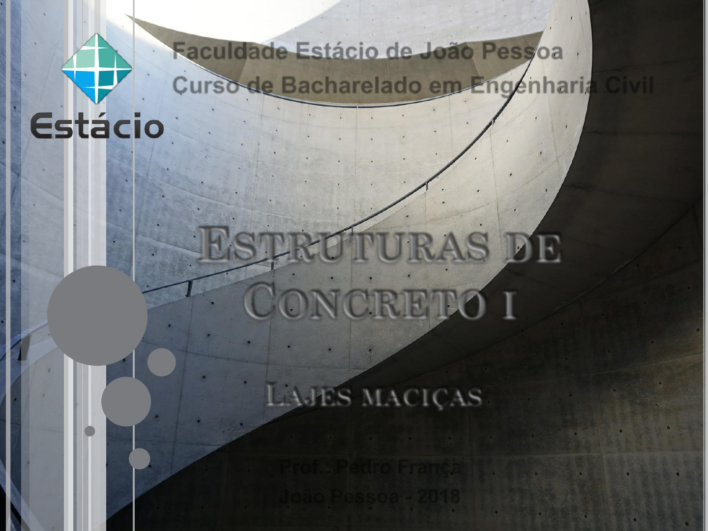 Faculdade Estácio de João Pessoa Curso de Bacharelado em Engenharia Civil ESTRUTURAS DE CONCRETO I Prof.: Pedro França João Pessoa - 2018 LAJES MACIÇAS INTRODUÇÃO As lajes são classificadas como elementos planos bidimensionais, que são aqueles onde duas dimensões, o comprimento e a largura, são da mesma ordem de grandeza e muito maiores que a terceira dimensão, a espessura; Destinam-se a receber a maior parte das ações aplicadas numa construção, normalmente de pessoas, móveis, pisos, paredes, e os mais variados tipos de carga; Nos edifícios usuais, as lajes maciças têm grande contribuição no consumo de concreto: aproximadamente 50% do total; INTRODUÇÃO As ações são comumente perpendiculares ao plano da laje, podendo ser divididas em distribuídas na área, distribuídas linearmente ou forças concentradas; Embora menos comuns, também podem ocorrer ações externas na forma de momentos fletores, normalmente aplicados nas bordas das lajes; As ações são normalmente transmitidas para as vigas de apoio nas bordas da laje, mas eventualmente também podem ser transmitidas diretamente aos pilares, quando são chamadas lajes lisas; INTRODUÇÃO Quando as ações estão contidas em seu plano, os elementos de superfície são chamados de chapas ou placas; Os elementos estruturais de superfície não plana são chamados de casca; INTRODUÇÃO Placas ou chapas; INTRODUÇÃO Placas ou chapas; INTRODUÇÃO Casca; LAJES MACIÇAS Laje maciça é aquela onde toda a espessura é composta por concreto, contendo armaduras longitudinais de flexão e eventualmente armaduras transversais; LAJES MACIÇAS As lajes maciças geralmente são apoiadas em vigas ou paredes ao longo das bordas, porém podem transferir suas cargas diretamente aos pilares; CLASSIFICAÇÃO DAS LAJES As lajes maciças podem ser classificadas segundo diferentes critérios, como em relação à forma geométrica, dos tipos de vínculos nos apoios, quanto à direção, etc; As formas geométricas podem ter as mais variadas formas possíveis, porém, a forma retangular é a grande maioria dos casos da prática; Hoje em dia, com os avançados programas computacionais existentes, as lajes podem ser facilmente calculadas e dimensionadas, segundo quaisquer formas geométricas e carregamentos que tiverem; CLASSIFICAÇÃO QUANTO À DIREÇÃO Uma classificação muito importante das lajes maciças é aquela referente à direção ou direções da armadura principal; Existem dois casos: laje armada em uma direção ou laje armada em duas direções; CLASSIFICAÇÃO QUANTO À DIREÇÃO 1) Lajes armadas em uma direção – são aquelas em que a relação entre o maior e o menor vão é maior que 2: CLASSIFICAÇÃO QUANTO À DIREÇÃO Os esforços solicitantes de maior magnitude ocorrem segundo a direção do menor vão, chamada direção principal; Na outra direção, chamada secundária, os esforços solicitantes são bem menores e, por isso, são comumente desprezados nos cálculos. Os esforços solicitantes e as flechas são calculados supondo-se a laje como uma viga com largura de 1 m, segundo a direção principal da laje, como será visto adiante. CLASSIFICAÇÃO QUANTO À DIREÇÃO 1) Lajes armadas em duas direções – os esforços solicitantes são importantes segundo as duas direções principais da laje: A relação entre os lados é: VÃO EFETIVO E VÃO LIVRE Em projeto de lajes, uma das etapas iniciais consiste em determinar os vãos livres (l0), os vãos efetivos ou teóricos (lef) e a relação entre os vãos teóricos; Vão livre é a distância livre entre as faces dos apoios; Vão efetivo ou teórico é a distância entre os centros dos apoios; VÃO EFETIVO OU LIVRE Os vãos efetivos das lajes nas direções principais (NBR 6118, item 14.6.2.4), considerando que os apoios são suficientemente rígidos na direção vertical, devem ser calculados pela expressão: VINCULAÇÃO NAS BORDAS De modo geral são três os tipos de apoio das lajes: paredes de alvenaria ou de concreto, vigas ou pilares de concreto; Para o cálculo dos esforços solicitantes e das deformações nas lajes torna-se necessário estabelecer os vínculos da laje com os apoios, sejam eles pontuais como os pilares, ou lineares como as vigas de borda; Existem, basicamente, três tipos: borda livre, borda simplesmente apoiada e borda engastada. VINCULAÇÃO NAS BORDAS a) Borda simplesmente apoiada – quando a borda da laje é continuamente suportada por vigas, paredes de alvenaria de tijolos cerâmicos, de blocos de concreto ou de pedras; No caso de vigas de concreto de dimensões correntes, a rigidez da viga à torção é pequena, de modo que a viga gira e deforma-se, acompanhando as pequenas rotações da laje, o que acaba garantindo a concepção teórica do apoio simples VINCULAÇÃO NAS BORDAS a) Borda simplesmente apoiada VINCULAÇÃO NAS BORDAS b) Borda engastada – quando a borda da laje tem continuidade além do apoio correspondente daquele lado (laje adjacente); Não há deslocamento nem na vertical e também as rotações são impedidas. VINCULAÇÃO NAS BORDAS b) Borda engastada VINCULAÇÃO NAS BORDAS b) Borda engastada VINCULAÇÃO NAS BORDAS a) Borda livre – caracteriza-se pela ausência de apoio, apresentando, portanto, deslocamentos verticais. Nos outros dois tipos de vinculação, não há deslocamentos verticais; VINCULAÇÃO NAS BORDAS Representação dos tipos de apoio: VINCULAÇÃO NAS BORDAS Exemplo: VINCULAÇÃO NAS BORDAS - OBSERVAÇÕES Quando duas lajes contínuas têm espessuras muito diferentes, pode ser mais adequado considerar a laje de menor espessura (L2) engastada na de maior espessura (L1), mas a laje com maior espessura pode ser considerada apenas apoiada na borda comum as duas lajes: VINCULAÇÃO NAS BORDAS - OBSERVAÇÕES Uma laje não deve ser considerada engastada em outra que tenha uma espessura mais do que 2 cm inferior; VINCULAÇÃO NAS BORDAS - OBSERVAÇÕES No caso onde as lajes não têm cont
