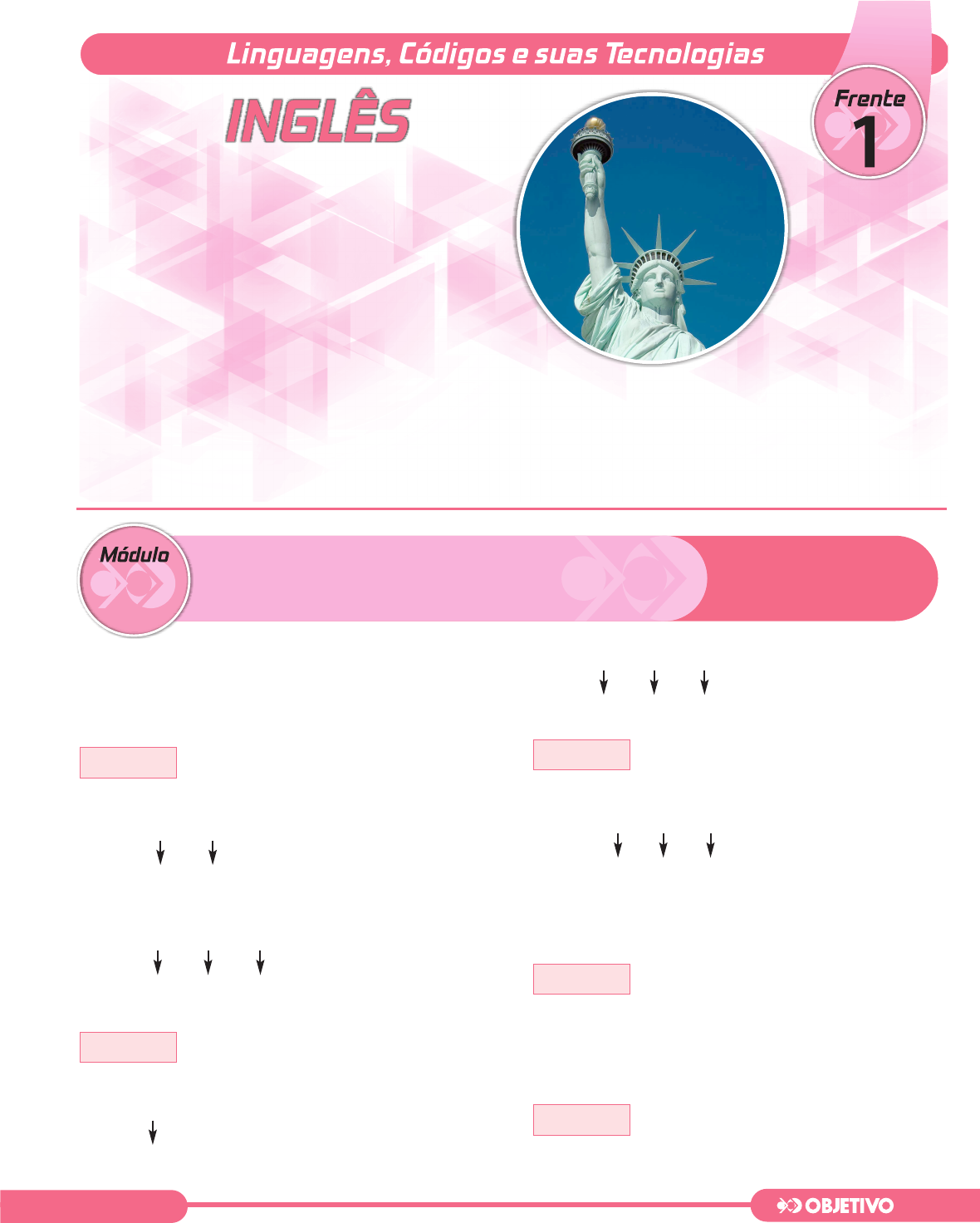 109INGLES Há perguntas em inglês iniciadas por pronomes interrogativos para se obter infor mações do tipo: “quem, o que, como, quando, onde?...” = (o) que, qual Funciona como sujeito ou objeto da oração. What makes you happy? (sujeito) verbo objeto principal What did you say? (objeto) auxiliar sujeito verbo principal = quem Funciona como sujeito ou objeto da oração. Who arrived late yesterday? (sujeito) verbo principal Who does she love? (objeto) auxiliar sujeito verbo principal = quem Funciona só como objeto de oração ou após preposições. Whom did you talk to yesterday? (objeto) verbo sujeito verbo auxiliar principal To whom did you talk? � = que, qual, quais Indica escolha ou opção. Which shirt do you prefer: the blue one or the red one? Which of those ladies is your mother? = onde Where are you going tonight? WHAT WHO WHOM WHICH WHERE The Statue of Liberty Grammar and Texts Módulos 17 – Interrogative Pronouns 18 – Text – Posting Selfies on Social Media Can Be Bad 19 – Text – Jeans that Clean the Air 20 – Text – Libra Crypto-currency 21 – Adverbs 22 – Text – Rent-A-Friend Agencies Growing in Japan 17 Interrogative Pronouns C3_2S_VERMELHO _Ingles_2021_YONNE.qxp 24/06/2021 08:43 Página 109 110 INGLES Complete the following sentences with interrogatives. Which� _____________ was the fastest runner: John or Jim? Why� _____________ did you have to go and talk to him about it? Now, he is very sad. What� ______________ do you mean? Who� _____________ phoned me a minute ago? whom� To _____________ did you send those flowers? How long� “_____________ does it take to finish this task?” “About twenty minutes”. I. Complete with the missing interrogative. Who��________________ went with you to London? Which��________________ of these books is your favorite? What��________________ is wrong with that exercise? Whose��________________ pen are you using? Is it mine? Who/Whom��______________________ is your daughter going to marry? My neighbor’s son. Where��________________ did you come from? Mexico. When� ________________ do you usually go to the movies? On Saturdays. How ________________ does she go to her aunt’s? By car. Why ________________ are you so sad? Who � ________________ is speaking? Jane is. = por que Why don’t you come to the movies with us? = quando “When were you born?” “In 1970.” = como “How is his sister?” “Fine.” = de quem “Whose dictionary is this?” “John’s.” Formas compostas de WHAT e HOW • WHAT + be + like? = como é “What is your boyfriend like?” “He’s tall and slim.” • WHAT about...? = que tal, o que você acha de...? What about having lunch now? � • WHAT do you call...? = como se chama...? qual é o nome...? What do you call this device? • WHAT ... FOR? = por que? para que? What are you doing this for? • HOW HOW FAR = qual é a distância? HOW DEEP = qual é a profundidade? HOW LONG = qual é o comprimento?, quanto tem po? HOW WIDE = qual é a largura? HOW TALL = qual é a altura? (pessoas) HOW HIGH = qual é a altura? (coisas) HOW OLD = qual é a idade? HOW MUCH = quanto(a)? HOW MANY = quantos(as)? HOW OFTEN = com que frequência? HOW FAST = a que velocidade? How do you do? = muito prazer WHY WHEN HOW WHOSE ATENÇÃO Exercícios Resolvidos Exercícios Propostos C3_2S_VERMELHO _Ingles_2021_YONNE.qxp 24/06/2021 08:43 Página 110 111INGLES II. Read the statements. Then ask questions about the underlined words. � Father has taken the newspaper. Who has taken the newspaper? � They want to go out. What do they want (to do)? � That house is mine. Whose house is that? � I am coming back on Friday. When are you coming back? � Mary married a sailor. Who/Whom did Mary marry? � I intend to remain here for two weeks. How long do you intend to remain here? � She is a very charming girl. What is she like? Shoes are made of leather. What are shoes made of? They were looking at the view. Where were they looking at? � Henry lives about three miles away. How far does Henry live? III. Translate into English. � Como são seus vizinhos? Eles são barulhentos e mal- educados. What are your neighbors like? They are noisy and impolite. � Que tal tomarmos um sorvete? What about having an ice-cream? � Quantos dólares você tem? How many dollars do you have? � Quanto você geralmente gasta em roupas? How much do you usually spend on clothes? � Qual é a idade de sua mãe? Ela tem 48 anos. How old is your mother? She is 48 years old. � Quantos alunos há em sua sala? How many students are there in your classroom? � De quem são aquelas mochilas? Whose backpacks are those? Com quem você foi ao cinema ontem? With whom did you go to the movies yesterday? Whom (who) did you go to the movies with yesterday? C3_2S_VERMELHO _Ingles_2021_YONNE.qxp 24/06/2021 08:43 Página 111 112 INGLES C3_2S_VERMELHO _Ingles_2021_YONNE.qxp 24/06/2021 08:43 Página 112 113INGLES Using social media too much and posting many selfies have caused a rise in narcissism, according to a new study. Narcissism is when someone becomes very selfish and believes they are very talented and beautiful. They need attention from other people and think they are better than everyone else. Researchers at universities in Swansea and Milan found that heavy users of social media sites like Facebook and Twitter showed a 25 per cent rise in narcissism in just four months. The researchers studied how 74 people aged 18 to 34 used social media and looked at how their personality changed. They said that posting selfies seemed to increase levels of narcissism in a way that text messaging does not. Professor Phil Reed, from the Department of Psychology at Swansea University, said: "There have been suggestions of links between narcissism and the use of selfies on social media, such as Facebook, but until this study, it was not known if using such platforms is associated with the growth in