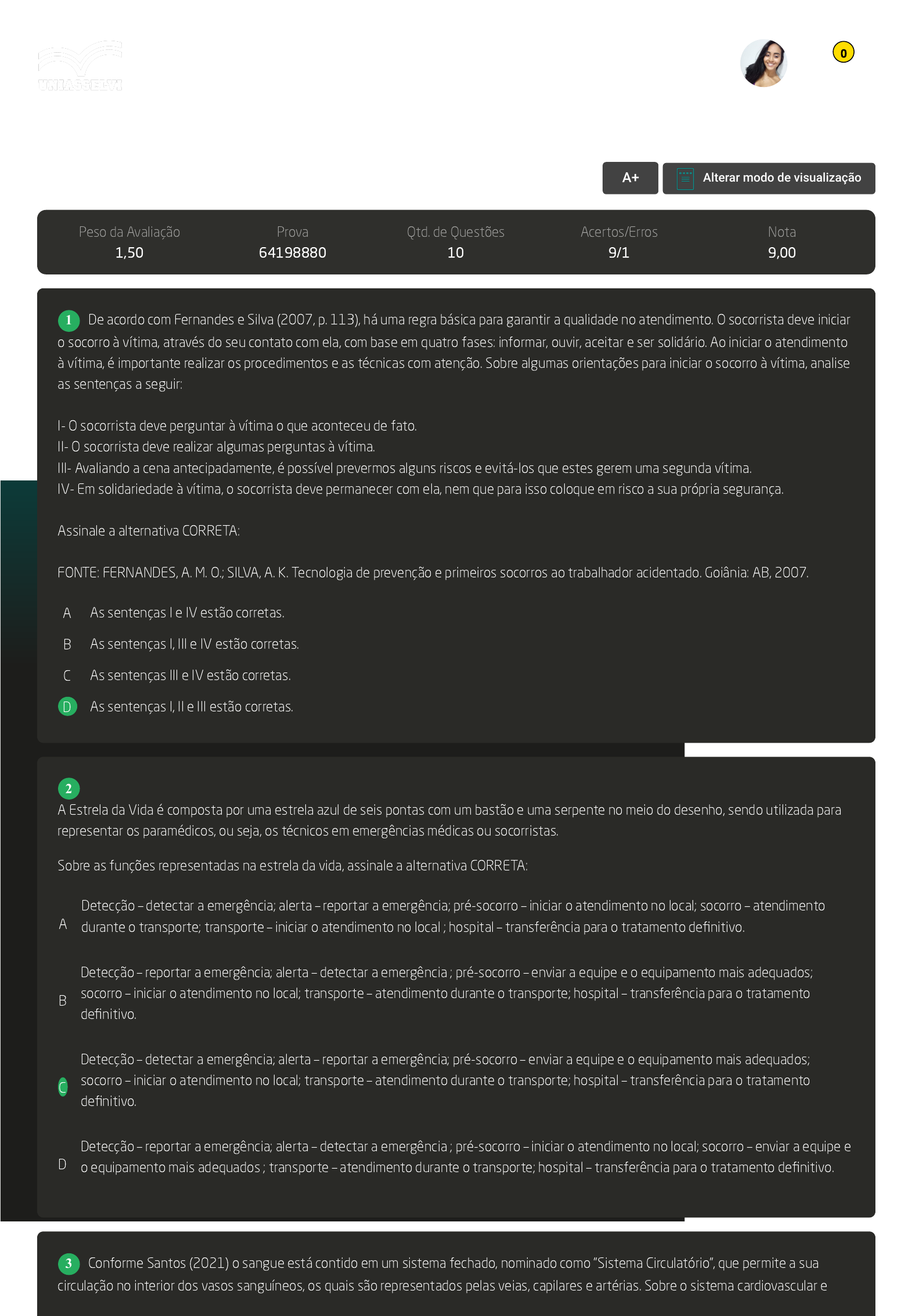 30/08/2023, 19:49 AVA https://ava2.uniasselvi.com.br/subject/grades-and-tests/answer-book/eyJ0ZXN0Ijp7InRlc3RDb2RlIjoiODIyMzUwIiwiZGVzY3JpcHRpb24iOiJBdmFsaWHDp8OjbyBJSSAtIEluZGl2aWR1YWwiLCJwYXJhbWV0ZXIiOjU0… 1/5 GABARITO | Avaliação II - Individual (Cod.:822350) Peso da Avaliação 1,50 Prova 64198880 Qtd. de Questões 10 Acertos/Erros 9/1 Nota 9,00 De acordo com Fernandes e Silva (2007, p. 113), há uma regra básica para garantir a qualidade no atendimento. O socorrista deve iniciar o socorro à vítima, através do seu contato com ela, com base em quatro fases: informar, ouvir, aceitar e ser solidário. Ao iniciar o atendimento à vítima, é importante realizar os procedimentos e as técnicas com atenção. Sobre algumas orientações para iniciar o socorro à vítima, analise as sentenças a seguir: I- O socorrista deve perguntar à vítima o que aconteceu de fato. II- O socorrista deve realizar algumas perguntas à vítima. III- Avaliando a cena antecipadamente, é possível prevermos alguns riscos e evitá-los que estes gerem uma segunda vítima. IV- Em solidariedade à vítima, o socorrista deve permanecer com ela, nem que para isso coloque em risco a sua própria segurança. Assinale a alternativa CORRETA: FONTE: FERNANDES, A. M. O.; SILVA, A. K. Tecnologia de prevenção e primeiros socorros ao trabalhador acidentado. Goiânia: AB, 2007. A As sentenças I e IV estão corretas. B As sentenças I, III e IV estão corretas. C As sentenças III e IV estão corretas. D As sentenças I, II e III estão corretas. A Estrela da Vida é composta por uma estrela azul de seis pontas com um bastão e uma serpente no meio do desenho, sendo utilizada para representar os paramédicos, ou seja, os técnicos em emergências médicas ou socorristas. Sobre as funções representadas na estrela da vida, assinale a alternativa CORRETA: A Detecção – detectar a emergência; alerta – reportar a emergência; pré-socorro – iniciar o atendimento no local; socorro – atendimento durante o transporte; transporte – iniciar o atendimento no local ; hospital – transferência para o tratamento definitivo. B Detecção – reportar a emergência; alerta – detectar a emergência ; pré-socorro – enviar a equipe e o equipamento mais adequados; socorro – iniciar o atendimento no local; transporte – atendimento durante o transporte; hospital – transferência para o tratamento definitivo. C Detecção – detectar a emergência; alerta – reportar a emergência; pré-socorro – enviar a equipe e o equipamento mais adequados; socorro – iniciar o atendimento no local; transporte – atendimento durante o transporte; hospital – transferência para o tratamento definitivo. D Detecção – reportar a emergência; alerta – detectar a emergência ; pré-socorro – iniciar o atendimento no local; socorro – enviar a equipe e o equipamento mais adequados ; transporte – atendimento durante o transporte; hospital – transferência para o tratamento definitivo. Conforme Santos (2021) o sangue está contido em um sistema fechado, nominado como "Sistema Circulatório", que permite a sua circulação no interior dos vasos sanguíneos, os quais são representados pelas veias, capilares e artérias. Sobre o sistema cardiovascular e VOLTAR A+ Alterar modo de visualização 1 2 3 Tairini Silva de Souza Nutrição (1865629) 0 30/08/2023, 19:49 AVA https://ava2.uniasselvi.com.br/subject/grades-and-tests/answer-book/eyJ0ZXN0Ijp7InRlc3RDb2RlIjoiODIyMzUwIiwiZGVzY3JpcHRpb24iOiJBdmFsaWHDp8OjbyBJSSAtIEluZGl2aWR1YWwiLCJwYXJhbWV0ZXIiOjU0… 2/5 sanguíneo, classifique V para as sentenças verdadeiras e F para as falsas: ( ) O coração é o órgão central do sistema cardiovascular, responsável pelo bombeamento de todo o sangue pelo corpo. ( ) O sistema circulatório, tem função de transporte de gases, nutrientes, produtos metabólicos e hormônios para todo o corpo. ( ) O sangue é um tecido conjuntivo viscoso e denso com uma temperatura aproximada de 38 ºC. ( ) O sangue, está constituído por uma parte líquida denominada plasma (55%) e uma parte celular, os elementos figurados (45%). Assinale a alternativa que apresenta a sequência CORRETA: A V - F - F - V. B V - V - V - V. C F - F - V - V. D V - F - V - F. Quando você chegar no local onde aconteceu o acidente, deve-se tomar o controle para ter o maior número de informações disponíveis. Após a verificação rápida da situação, algumas medidas devem ser tomadas. Sobre a avaliação do local de ocorrência, assinale a alternativa CORRETA: A O atendimento ao acidentado deve ser devagar, e a verificação se existem perigos adicionais não precisa ser analisada. B Para ter o controle da situação, deve-se falar em alto tom e dar ordens, deixando o acidentado nervoso. C Garantir a sua segurança enquanto socorrista, o próximo passo será fazer uma breve avaliação rápida, pontual e objetiva, a fim de determinar qual é a real situação ou grau do dano. D A ajuda de outras pessoas capacitadas pode atrapalhar o andamento da prestação dos primeiros socorros. Os equipamentos de proteção individual (EPIs) são dispositivos utilizados pelos profissionais contra possíveis riscos que ameaçam a sua saúde ou segurança durante o exercício de sua atividade laboral. De acordo com a NR-6, da Portaria nº 3214 de 08 de junho de 1978, do Ministério do Trabalho e Emprego, considera-se Equipamento de Proteção Individual - EPI: "todo dispositivo ou produto de uso individual destinado a proteger a saúde e a integridade física do trabalhador". Todas as precauções devem ser tomadas durante os exames e manipulação da vítima, a fim de evitar a contaminação do socorrista por possíveis agentes infecciosos, por produtos químicos (tóxicos, corrosivos, radioativos) presentes na superfície do corpo do acidentado, por seu sangue e/ou suas secreções. Com relação aos EPIs, analise as afirmativas a seguir: I- Tem por objetivo a proteção da