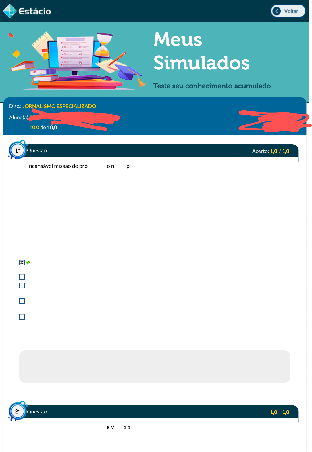 01/09/2023, 20:51 Estácio: Alunos https://simulado.estacio.br/alunos/ 1/5 Meus Simulados Teste seu conhecimento acumulado Disc.: JORNALISMO ESPECIALIZADO Aluno(a): YASMIN PINTO DOS SANTOS 202105077771 Acertos: 10,0 de 10,0 01/09/2023 Acerto: 1,0 / 1,0 Na incansável missão de provar que o nosso planeta é plano, os chamados terraplanistas estão planejando um encontro em Cólon, na Argentina, em que contarão com conferência de imprensa, palestras e workshops. Entretanto, a reunião está causando ainda mais polêmica por ser realizada em um espaço do governo argentino. No dia 20 de fevereiro, a cidade anunciou em sua página do Facebook que o Lago y Complejo Polideportivo Municipal seria sede do 1o Encontro Nacional e Internacional de Terraplanistas, evento que teria participação de pessoas de países como Chile, Espanha e Estados Unidos. O apoio fez com que o município recebesse críticas, como da Associação Argentina de Astronomia, que reclamou e con�rmou que sem dúvida o planeta é uma esfera. O grupo emitiu um comunicado expressando sua "profunda preocupação" pelo encontro de terraplanistas. "A promoção de instituições públicas reivindicando atividades de ideias claramente errôneas e descartadas há séculos, como a Terra ser plana, é inaceitável", disse o grupo. "Ainda mais no contexto de sub�nanciamento que atualmente está sofrendo todo o aparato cientí�co e tecnológico do país." O fato jornalístico em torno do qual se construiu essa notícia é: A conturbação política e cientí�ca gerada por pessoas que defendem hipóteses falsas, reivindicando a mesma validade de conhecimento cientí�co. O interesse dos cidadãos em conhecer um ponto de vista válido para se contrapor à ciência hegemônica. A descoberta de que a Terra, de fato, é plana, motivo pelo qual eventos são realizados, gerando resistência dos cientistas que querem impedir a mudança de paradigma. A importância da divulgação das diferentes opiniões, mesmo que contestem o conhecimento cientí�co hegemônico. A obstrução do debate público por pressão de cientistas contra uma hipótese válida e desvalorizada pela academia. Respondido em 01/09/2023 20:41:03 Explicação: A resposta correta é: A conturbação política e cientí�ca gerada por pessoas que defendem hipóteses falsas, reivindicando a mesma validade de conhecimento cientí�co. Acerto: 1,0 / 1,0 Sobre o jornalismo cientí�co, marque V para as a�rmativas verdadeiras e F para as falsas: ( ) São frequentes as recomendações sobre as cautelas que devem ser tomadas para a utilização de press releases como fonte privilegiada na composição das notícias. Questão1 a Questão2 a https://simulado.estacio.br/alunos/inicio.asp javascript:voltar(); 01/09/2023, 20:51 Estácio: Alunos https://simulado.estacio.br/alunos/ 2/5 ( ) O ideal é que os jornalistas leiam a versão integral dos estudos e relatórios em que se baseiam para compor suas matérias e que busquem outras opiniões abalizadas sobre o assunto. ( ) É comum um pesquisador participar de uma reunião cientí�ca para expor hipóteses, discutir a viabilidade de um novo procedimento cientí�co ou avaliar o desempenho de uma determinada tecnologia para, com isto, ouvir a opinião de seus colegas de saber. Nestes casos, o jornalista deve avaliar o que foi debatido e levar em consideração as críticas que foram feitas pelos especialistas ao teor do que foi apresentado no decorrer do evento. ( ) São frequentes as situações nas quais as universidades e os laboratórios industriais recorrem à mídia através de comunicados produzidos por seus departamentos de Relações Públicas. Tais comunicados, ao divulgar novas descobertas ou novas tecnologias, tendem a gerar expectativas junto ao público, pois, de regra, enfatizam que o novo conhecimento ou o novo produto apresenta melhor qualidade ou maior e�ciência que seus similares. Nestas ocasiões, os jornalistas não precisam ponderar se as informações recebidas atendem exclusivamente ao interesse público ou se visam interesses comerciais ou promocionais. A sequência, de cima para baixo, está correta em: F, F, V, V. F, F, F, V. V, F, V, F. V, V, V, F. V, F, F, F. Respondido em 01/09/2023 20:42:03 Explicação: A resposta correta é: V, V, V, F. Acerto: 1,0 / 1,0 Entre as novas frentes de especialização do jornalismo, destaca-se a que se aproxima do setor de Ciência & Tecnologia. É o chamado Jornalismo Cientí�co, cujo objetivo principal é: Realizar estudos sobre o jornalismo a partir de critérios cientí�cos. Produzir novas tecnologias de mídia para as empresas de Comunicação. Criar assessorias de imprensa para universidades e centros de pesquisa. Treinar cientistas e acadêmicos para a produção de textos jornalísticos. Traduzir, para o leitor/espectador/ouvinte leigo, as descobertas cientí�cas. Respondido em 01/09/2023 20:42:18 Explicação: A resposta correta é: Traduzir, para o leitor/espectador/ouvinte leigo, as descobertas cientí�cas. Acerto: 1,0 / 1,0 Sobre competências do jornalista de ciência, só não é correto a�rmar que: O jornalista de ciência precisa compreender os estudos cientí�cos. É preciso conhecer a ciência. É impossível saber tudo, mas é possível ter boas fontes. Questão3 a Questão4 a 01/09/2023, 20:51 Estácio: Alunos https://simulado.estacio.br/alunos/ 3/5 O jornalista cientí�co precisa usar jargão cientí�co nas reportagens. O jornalista de ciência precisa entender o que dizem os cientistas. Respondido em 01/09/2023 20:46:03 Explicação: A resposta correta é: O jornalista cientí�co precisa usar jargão cientí�co nas reportagens. Acerto: 1,0 / 1,0 Uma das características do jornalismo literário é: Basear-se apenas em entrevistas. Não entrevistar ninguém, usar apenas documentos. Usar técnicas literárias para narrar fatos jornalísticos. Tratar apenas de livros. Usar relatos �ccionais, por isso ele se chama jo