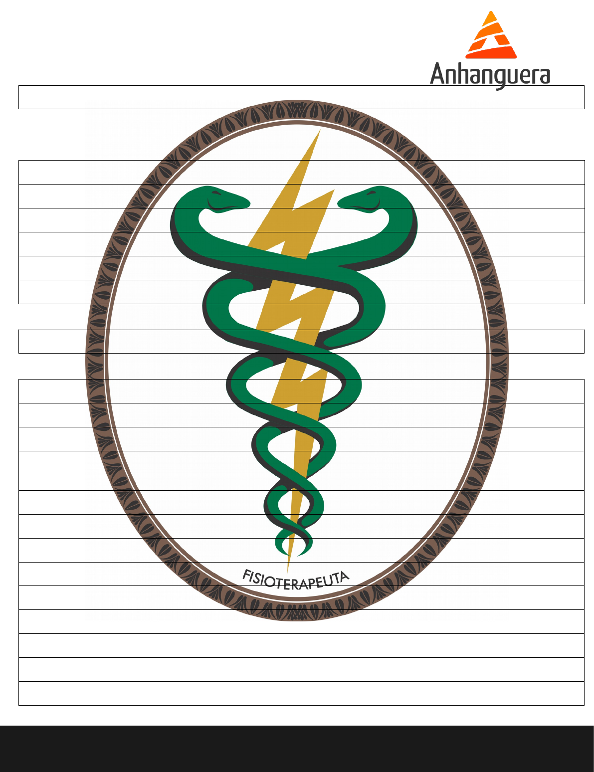 FICHA DE AVALIAÇÃO AVALIADOR: Data: / / Nome: Idade: Telefone: Profissão Nome do Médico: Diagnóstico Médico: ANAMNESE QP: HDP e HDA ( Porque está aqui, como aconteceu, quando, datas, patologias associadas, antecedentes patológicos, antecedentes cirúrgicos, medicamentos, etc) História Social ( AVDs, lazer, etilismo, tabagismo, atividade física – frequência/ quantidade, antecedentes familiares) Exames Complementares: (RX, ECG, TC, Laboratório,...): Sinais Vitais: PA:________________________________________________________________________________________ Exame Físico INSPEÇÃO: · Observação do paciente ( estado geral e emocional) · Verificação do estado geral da pele, alterações cutâneas e articulares detalhadas e localização · Presença de curativos, fixadores. Cicatrizes, manchas __________________________________________________________________________________________________________________________________________________________________________________________________________________________________________________________________________________________________________________________________________________________________________________________________________________________________________________________________ PALPAÇÃO: · Tônus, trofismo, presença de triggers points, dor a palpação (localização), edema-local ______________________________________________________________________________________________________________________________________________________________________________________________________________________________________________________________________________________________________________________________________________________________________________________________________________________________________________________________________________________________________________________________________________________________________________________________________________________________________________________ AVALIAÇÃO SUBJETIVA DA DOR ( graduação de 0 à 10) Característica : pontuada, agulhada, queimação, latejante, irradiada, etc. Data Grau Local Característica Quando ocorre Data Grau Local Característica Quando ocorre _____________________________________________________________________________________ Testes especiais de Ortopedia Diagnóstico fisioterapêutico: Objetivos de tratamento: Curto Prazo: Médio Prazo: Longo Prazo: Condutas do Programa de Tratamento: Curto Prazo: Médio Prazo: Longo Prazo: ______________________________________ ________________________________ Acadêmico Supervisor EVOLUÇÃO EVOLUÇÃO
