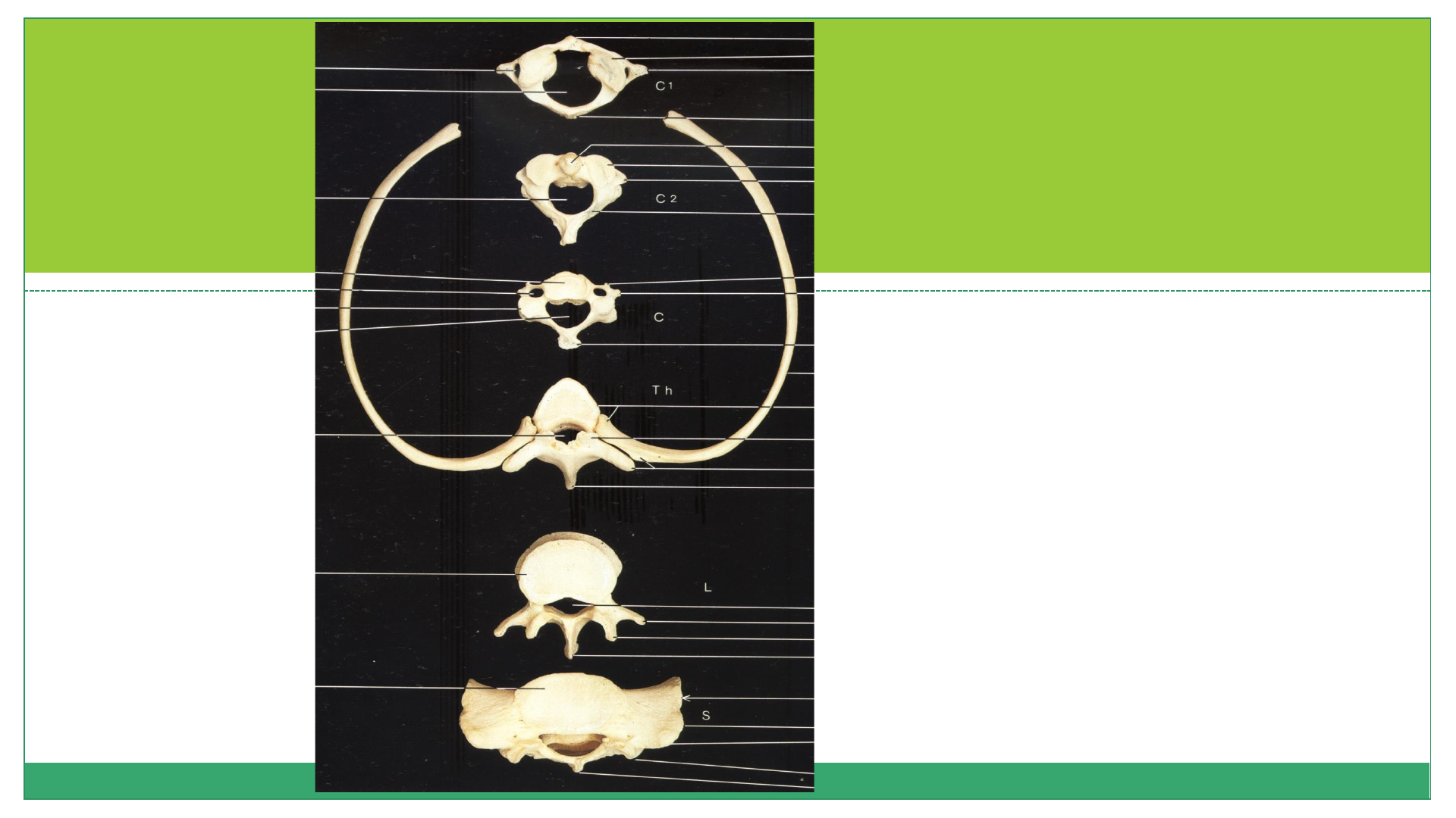 COLUNA VERTEBRAL COLUNA VERTEBRAL COLUNA VERTEBRAL •Vertebras •Discos Intervertebrais REGIÕES ❑Cervical (7) ❑Torácica (12) ❑Lombar (5) ❑Sacral – osso sacro (5 ossos fundidos) ❑Coccígea- osso cóccix (4 ossos fundidos) COLUNA VERTEBRAL Desenvovimento das curvaturas normais VÉRTEBRA COLUNA VERTEBRAL Características das vértebras As vértebras podem ser estudadas sobre três aspectos: características gerais, características regionais características individuais. Características gerais Corpo Arco Vertebral Pedículo Laminas Forame Vertebral Processos (7) Transverso (2) Espinhoso (1) Articular Superior (2) Articular Inferior (2) *margem epifisial Características gerais * margem epifisial (epífise anular) * Forame basivertebral Características gerais Corpo Vertebral - margem epifisial (epífise anular) - Face Articular - Forame Intervertebral - Canal vertebral - Disco Intervertebral 15 Processo Articular Superior de L1 Forame Intervertebral Processo Transverso Processo Espinhoso Processo Articular Inferior de L3 Face Articular do Processo Articular Inferior Vista Lateral Corpo Vertebral Disco Intervertebral 16 Face Articular do Processo Articular Superior Face Articular do Processo Articular Inferior de L3 Face Articular do Processo Articular Superior de L4 Processo Transverso Corpo Processo Articular Inferior de L4 Lâmina Disco Intervertebral Processo EspinhosoVista Posterior Face Articular do Processo Articular Superior Processo Articular Inferior de L3 Processo Articular Superior de L4 18 Vista Superior A B F G H C D E Identifique os acidentes anatômicos. V É R T E B R A S C E R V I C A I S V É R T E B R A S T O R Á C I C A S V É R T E B R A S L O M B A R E S S A C R O C Ó C C I X Características Regionais Vértebra Cervical Forame Transversário - Processo uncinado ou unco do corpo vertebral - Processo espinhoso bifido - Processo Transverso: Tubérculo anterior Tubérculo posterior Forame transversário Sulco do nervo espinhal Vértebra Cervical Sulco do nervo espinhal Vértebra Cervical - Forame Transversário – passagem para a artéria vertebral Vértebra Cervical Fóvea Costal do Processo Transverso (para o tubérculo da costela) Fóvea Costal do Superior do Corpo Vertebral (para a cabeça da costela) *Apresenta faceta(s) articular(es) para as costelas (fóvea costal) no corpo vertebral e processo transverso. Vértebra Torácica Vértebra Torácica Fóvea Costal do Processo Transverso Vértebra Torácica Características Regionais : Vértebra Torácica Características Regionais : Vértebra Torácica Processo Costiforme Apresenta processo acessório e processo mamilar. Características Regionais : Vértebra Lombar Características Regionais : Observe as diferenças entre as regiões Características Regionais : Observe as diferenças entre as regiões Vista Lateral SACRO SACRO Cóccix - Vista Anterior Cóccix - Vista Posterior CÓCCIX 37 Vista Superior A B F G H C D E A qual região da coluna vertebral pertence? Características Individuais V is ta S u p e r io r V is ta I n fe r io r ATLAS (CI) - massas laterais – faces articulares - Tubérculo para o Ligamento Transverso - arco anterior - tubérculo anterior - fóvea do dente - arco posterior - tubérculo posterior - sulco da artéria vertebral Vista Anterior Vista Posterior AXIS(CII) - Dente do Axis – Faces articulares Priscilla Naiff Coluna Cervical