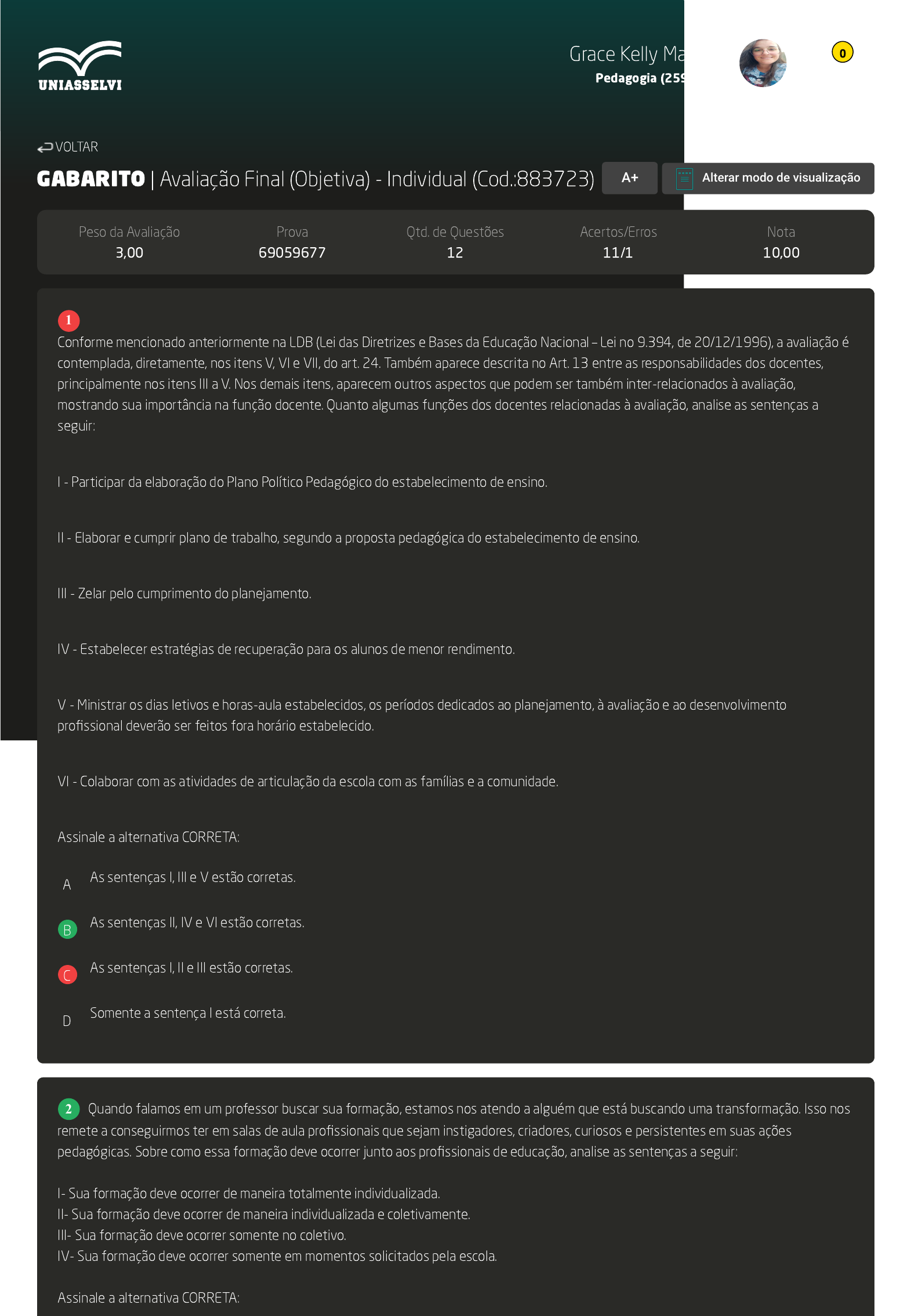 GABARITO | Avaliação Final (Objetiva) - Individual (Cod.:883723) Peso da Avaliação 3,00 Prova 69059677 Qtd. de Questões 12 Acertos/Erros 11/1 Nota 10,00 Conforme mencionado anteriormente na LDB (Lei das Diretrizes e Bases da Educação Nacional – Lei no 9.394, de 20/12/1996), a avaliação é contemplada, diretamente, nos itens V, VI e VII, do art. 24. Também aparece descrita no Art. 13 entre as responsabilidades dos docentes, principalmente nos itens III a V. Nos demais itens, aparecem outros aspectos que podem ser também inter-relacionados à avaliação, mostrando sua importância na função docente. Quanto algumas funções dos docentes relacionadas à avaliação, analise as sentenças a seguir: I - Participar da elaboração do Plano Político Pedagógico do estabelecimento de ensino. II - Elaborar e cumprir plano de trabalho, segundo a proposta pedagógica do estabelecimento de ensino. III - Zelar pelo cumprimento do planejamento. IV - Estabelecer estratégias de recuperação para os alunos de menor rendimento. V - Ministrar os dias letivos e horas-aula estabelecidos, os períodos dedicados ao planejamento, à avaliação e ao desenvolvimento profissional deverão ser feitos fora horário estabelecido. VI - Colaborar com as atividades de articulação da escola com as famílias e a comunidade. Assinale a alternativa CORRETA: A As sentenças I, III e V estão corretas. B As sentenças II, IV e VI estão corretas. C As sentenças I, II e III estão corretas. D Somente a sentença I está correta. Quando falamos em um professor buscar sua formação, estamos nos atendo a alguém que está buscando uma transformação. Isso nos remete a conseguirmos ter em salas de aula profissionais que sejam instigadores, criadores, curiosos e persistentes em suas ações pedagógicas. Sobre como essa formação deve ocorrer junto aos profissionais de educação, analise as sentenças a seguir: I- Sua formação deve ocorrer de maneira totalmente individualizada. II- Sua formação deve ocorrer de maneira individualizada e coletivamente. III- Sua formação deve ocorrer somente no coletivo. IV- Sua formação deve ocorrer somente em momentos solicitados pela escola. Assinale a alternativa CORRETA: VOLTAR A+ Alterar modo de visualização 1 2 Grace Kelly Martins Pedagogia (2595194) 0 A Somente a sentença IV está correta. B Somente a sentença II está correta. C As sentenças I e IV estão corretas. D As sentenças II e III estão corretas. O Planejamento de um sistema educacional é um Planejamento realizado nos três níveis: (nacional, estadual e municipal). Conforme Haydt (2008, p. 95): “Consiste no processo de análise e reflexão das várias facetas de um sistema educacional, para delimitar suas dificuldades e prever alternativas de solução”. Quanto ao planejamento escolar, analise as sentenças a seguir: I- O planejamento escolar é um processo que busca organizar e planejar todas as atividades propostas pela equipe gestora envolvendo tanto aspectos pedagógicos como administrativos. II- As ações do planejamento escolar necessitam ser planejadas de maneira que possam ser desenvolvidas pela equipe gestora, sem a participação dos demais membros. III- O planejamento escolar é um documento que pergunta: onde estamos e onde queremos chegar? Nesse entremeio, existem as estratégias, as quais estarão permeando todas as ações a serem desenvolvidas. IV- Todas as escolas necessitam possuir um planejamento escolar que sirva de base para suas atividades educativas. V- O planejamento escolar precisa ser bem elaborado, buscando compreender qual é a realidade da escola, quais são suas necessidades, o que se busca para melhoria, desde a estrutura física até a pedagógica. Assinale a sequência CORRETA: FONTE: HAYDT, R. C. C. Curso de didática geral. 6. ed. São Paulo: Ática, 2008. A As sentenças I, III, IV e V estão corretas. B As sentenças II, III e V estão corretas. C As sentenças I, II e III estão corretas. D As sentenças II, IV e V estão corretas. A formação inicial é o primeiro passo para o formar-se professor. Nessa fase, acontecem os primeiros contatos com o universo escolar. A partir disso, todo professor que inicia sua vida profissional, bem como o que já possui uma caminhada educativa, necessita ter sempre em mente o seu papel enquanto profissional. Sobre esse papel, assinale a alternativa CORRETA: A Manter uma postura desconectada da filosofia da escola. B Refletir, indagar e repensar sobre sua postura relativa à prática de ensino. C Deve realizar seu trabalho de maneira individualizada e sem muito diálogo. D Precisa desenvolver uma prática que envolva uma metodologia fragmentada, desconexa da realidade. 3 4 Grace Kelly Martins Pedagogia (2595194) 0 Para que a avaliação do olhar seja coerente, é necessário saber o que se deseja avaliar e realizar registros para poderem ser retomados sempre que necessário. Sobre quando, o que e como avaliar, associe os itens, utilizando o código a seguir: I- Quando. II- O que. III- Como. ( ) As atividades individuais e coletivas. Atividades significativas, fatos marcantes que exijam do aluno o seu posicionamento e aplicação do conhecimento individual em relação ao conteúdo abordado. ( ) Durante as aulas, enquanto as atividades estão sendo desenvolvidas pelos alunos, verificando se estão atingindo os objetivos propostos por você. Por isso, é importante saber o que se deseja observar. ( ) O ideal seria poder observar todos os alunos na mesma atividade, porém isso nem sempre é possível, visto que a maioria das turmas são grandes. Sendo assim, o professor pode eleger um grupo de alunos e realizar uma observação deles de forma mais atenta. Os registros devem ser simples, palavras, frases curtas, por códigos para que o professor não se perca em meio deles, pois estes precisam ser analisados constantemente para verificar os avanços individuais de cada um. Assinale a alternativa que apresenta a sequên