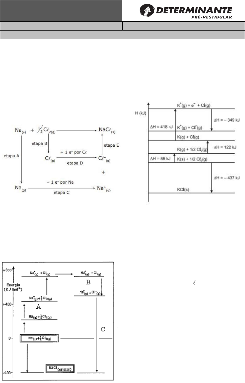 QUÍMICA Professor(a): JOSÉ HUGO Turma: CMMG_noite/2023 Tema: LIGAÇÕES QUÍMICAS Ligações Químicas I. Ligação Iônica II. Ligação Metálica III. Ligação Covalente l. Ligação Iônica 1) (Unimontes-MG–2010) A figura a seguir representa, graficamente, o processo descrito para a formação do cloreto de sódio (NaCl) sólido a partir dos átomos dos elementos no estado padrão. As etapas estão relacionadas às transformações ocorridas com absorção ou liberação de energia. Em relação a essas transformações, é correto afirmar que A) A sublimação de sódio ocorre com liberação de energia. B) As etapas de ionização ocorrem com absorção de energia. C) A dissociação de cloro produz dois mol de cloro atômico. D) As espécies iônicas se atraem em uma rede cristalina. 2) Observe o ciclo de Born-haber apresentado ao lado. No ciclo de Born-haber apresentado acima quais os nomes das energias representadas pelas letras A, B e C, respectivamente? A) Energia de ionização, eletronegatividade e entalpia de formação. B) Entalpia de dissociação, afinidade eletrônica e energia reticular. C) Energia de ionização, afinidade eletrônica e energia reticular. D) Energia de ionização, entalpia de sublimação e entalpia de formação. E) Energia de ionização, afinidade eletrônica e entalpia de formação. 3) (PUC SP 2013) O estudo da energia reticular de um retículo cristalino iônico envolve a análise do ciclo de Born-Haber. O diagrama de entalpia a seguir exemplifica o ciclo de Born- Haber do cloreto de potássio (KCl). A partir da análise do diagrama é INCORRETO afirmar que a) a entalpia de sublimação do potássio é de 89 kJ/mol. b) a entalpia de ligação Cl-Cl é de 244 kJ/mol. c) a entalpia de formação do KCl(s) é de –717 kJ/mol. d) o potencial de ionização do K(g) é de 418 kJ/mol. e) a reação entre o metal potássio e o gás cloro é exotérmica. 4) (G1 - ifce 2016) Os átomos se combinam através de ligações químicas buscando a estabilidade eletrônica. Existem três tipos de ligações químicas, sendo elas iônica, covalente e metálica. Diante da assertiva, os compostos CsC e BaS são considerados substâncias a) covalentes polares. b) iônicas. c) covalentes apolares. d) metálicas. e) coloidais. 5) (G1 - ifsul 2015) O principal componente do sal de cozinha é o cloreto de sódio. Este composto se apresenta no estado sólido nas condições ambientes (temperatura de 25 C e pressão de 1atm) em decorrência das fortes atrações que se estabelecem entre seus cátions e ânions. Quando dissolvido em água, são rompidas as ligações químicas a) dativas. b) iônicas. c) metálicas. d) covalentes. QUÍMICA Professor(a): JOSÉ HUGO Turma: CMMG_noite/2023 Tema: LIGAÇÕES QUÍMICAS 6) (FATEC-SP) A propriedade que pode ser atribuída à maioria dos compostos iônicos (isto é, aos compostos caracterizados predominantemente por ligações iônicas entre as partículas) é: a) dissolvidos em água, formam soluções ácidas. b) dissolvem-se bem em gasolina, diminuindo sua octanagem. c) fundidos (isto é, no estado líquido), conduzem corrente elétrica. d) possuem baixos pontos de fusão e ebulição. e) são moles, quebradiços e cristalinos. 7) (UNESP SP) Três substâncias puras, X, Y e Z, tiveram suas condutividades elétricas testadas, tanto no estado sólido como no estado líquido, e os dados obtidos encontram-se resumidos na tabela. Com base nessas informações, é correto classificar como substância(s) iônica(s) (A) Y e Z, apenas. (B) X, Y e Z. (C) X e Y, apenas. (D) Y, apenas. (E) X, apenas. 8) (Unimontes MG) A figura seguinte refere-se à estrutura de um sólido formado por suas unidades constituintes. Em relação ao sólido e suas unidades constituintes, é CORRETO o que se afirma em: a) As ligações químicas que se estabelecem entre as unidades constituintes da estrutura são iônicas. b) As unidades constituintes da estrutura são moléculas que permitem o deslize na rede cristalina. c) Deslizes na rede cristalina originam debilidades na resistência, devido às atrações interiônicas. d) As unidades constituintes dispõem-se em um arranjo desordenado, formando um sólido amorfo 9 (UFMG) Existem algumas propriedades que são adequadas para caracterizar os sólidos iônicos, uma vez que a grande maioria desses sólidos apresenta essas propriedades. Outras propriedades não são adequadas para esse fim, pois podem existir sólidos iônicos que não apresentam essas outras propriedades. Considere o conjunto dos sólidos iônicos. Entre as propriedades relacionadas, indique a que NÃO será exibida por um grande número de sólidos. a) Apresentar altas temperaturas de fusão. b) Conduzir corrente elétrica quando fundido. c) Ser isolante térmico e elétrico em estado sólido. d) Ser solúvel em água. e) Apresentar altas temperaturas de ebulição. 10) (Univ. Itaúna) O cloreto de sódio, NaCI, é uma substância iônica, sólida na temperatura ambiente. Sobre um cristal iônico de cloreto de sódio, todas as afirmativas são corretas, EXCETO: a) Todos os íons estão dispostos de forma organizada. b) Cada íon positivo atrai igualmente todos os íons negativos. c) Quando esse material sofre fusão, a atração entre os íons é enfraquecida. d) O que mantém o retículo é a atração eletrostática que ocorre entre os íons positivos e negativos 11) (UFMG) A figura representa uma seção plana de um cristal iônico, como Na+(s ) ou Ca2+O2- (s ) .Os íons foram numerados para facilitar a sua identificação. Considerando-se o modelo de ligação para compostos iônicos e os íons representados, é CORRETO afirmar que a) o ânion 6 apresenta ligações iônicas de mesma força com os cátions 2, 5, 7 e 10. b) o par de íons 2-6, no caso do cristal de Ca2+O2-está ligado por duas ligações iônicas. c) o ânion 1 não apresenta interação eletrostática com o cátion 7. d) o par de íons 1-5 está ligado ao par de íons