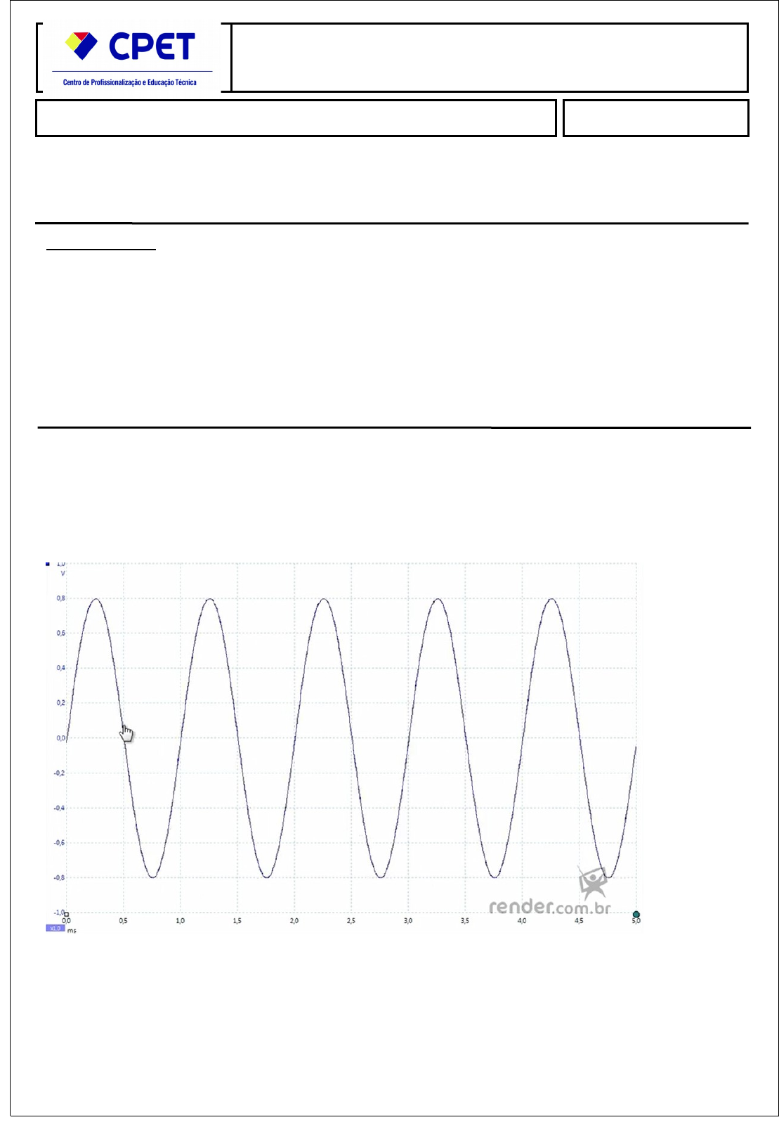Osciloscópio (2023) Data: Aluno(a): CPF: Atividade Prática Final INSTRUÇÕES: · Esta Atividade contém questões totalizando 10 (dez) pontos; · Você deve preencher dos dados no Cabeçalho para sua identificação: · Nome /CPF/Data · As respostas devem ser digitadas abaixo de cada pergunta; · Ao terminar salve o arquivo no formato .PDF ou .DOCX; · Envio o arquivo pelo sistema no local indicado; · Em caso de dúvidas consulte o seu Tutor. · ATENÇÃO O NÃO PREENCHIMENTO DOS DADOS ACARRETARÁ NA ANULAÇÃO DA ATIVIDADE. Questão 1: Quais são as ondas de tensão medidas pelo osciloscópio? Questão 2: informe o tempo decorrido e amplitude: Questão 3) Para responder essa questão COPIE O LINK ABAIXO E COLE NO SEU NAVEGADOR NA BARRA DE ENDEREÇOS: https://pzdsp.com/elab/ LEIA E SIGA O PASSO A PASSO PARA RESPONDER. Coloque a frequência no gerador de funções em 200hz, coloque o offset 1v e a amplitude em 5v e utilize o osciloscópio para fazer esta medição, ajuste a onda para melhor visualização do período e tire um “prtSc” e envie abaixo. Atenção, a questão será somente valida se retirar o prtsc da tela com data e a forma de onda igual a que está abaixo. Atividade Prática Serviços de Turismo e Viagens - GUI