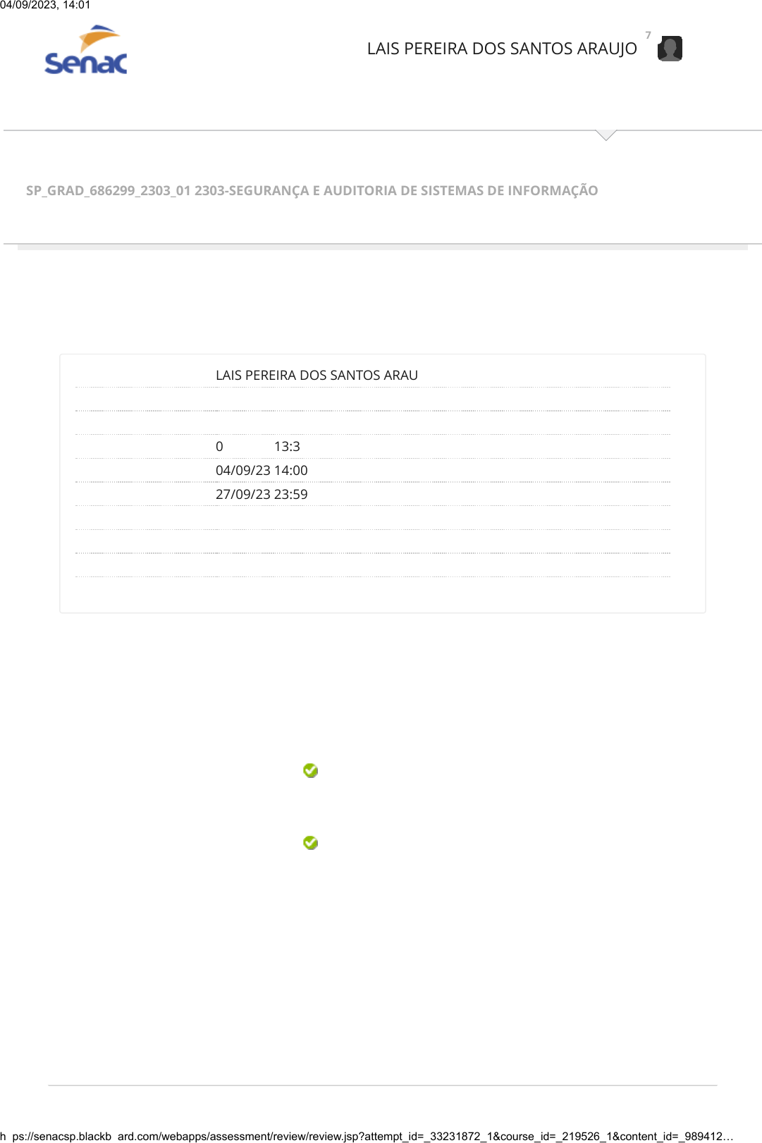 04/09/2023, 14:01 Revisar envio do teste: Clique aqui para iniciar o Quiz &ndash... https://senacsp.blackboard.com/webapps/assessment/review/review.jsp?attempt_id=_33231872_1&course_id=_219526_1&content_id=_989412… 1/6 Revisar envio do teste: Clique aqui para iniciar o Quiz SP_GRAD_686299_2303_01 2303-SEGURANÇA E AUDITORIA DE SISTEMAS DE INFORMAÇÃO Quiz REVISAR ENVIO DO TESTE: CLIQUE AQUI PARA INICIAR O QUIZ Usuário LAIS PEREIRA DOS SANTOS ARAUJO Curso 2303-SEGURANÇA E AUDITORIA DE SISTEMAS DE INFORMAÇÃO Teste Clique aqui para iniciar o Quiz Iniciado 04/09/23 13:36 Enviado 04/09/23 14:00 Data de vencimento 27/09/23 23:59 Status Completada Resultado da tentativa 9 em 10 pontos Tempo decorrido 24 minutos Resultados exibidos Todas as respostas, Respostas enviadas, Respostas corretas, Comentários Pergunta 1 Resposta Selecionada: b. Respostas: a. b. c. d. Comentário da resposta: Você está estruturando a política de segurança da informação na sua empresa e começará a estudar controles voltados ao compromisso da alta direção, responsabilidades e autorizações. A esse tipo de controle, dá-se o nome de: Organização interna Organização natural Organização interna Organização administrativa Organização de envolvidos Alternativa B. Organização interna. Organização interna: são controles que tratam do compromisso da alta direção, responsabilidades, autorizações, acordos de confidencialidade, contato com autoridades e grupos de interesses nas áreas de segurança. Sala de Aula Tutoriais 1 em 1 pontos LAIS PEREIRA DOS SANTOS ARAUJO 78 https://senacsp.blackboard.com/webapps/blackboard/execute/courseMain?course_id=_219526_1 https://senacsp.blackboard.com/webapps/blackboard/content/listContent.jsp?course_id=_219526_1&content_id=_9894077_1&mode=reset https://www.ead.senac.br/ https://senacsp.blackboard.com/webapps/portal/execute/tabs/tabAction?tab_tab_group_id=_260_1 https://senacsp.blackboard.com/webapps/portal/execute/tabs/tabAction?tab_tab_group_id=_210_1 https://senacsp.blackboard.com/webapps/login/?action=logout 04/09/2023, 14:01 Revisar envio do teste: Clique aqui para iniciar o Quiz &ndash... https://senacsp.blackboard.com/webapps/assessment/review/review.jsp?attempt_id=_33231872_1&course_id=_219526_1&content_id=_989412… 2/6 Pergunta 2 Resposta Selecionada: c. Respostas: a. b. c. d. Comentário da resposta: A norma ISO 27002 é um conjunto de boas práticas de segurança da informação. Sobre essa norma, podemos afirmar que: Não faz restrição ao porte da empresa para sua aplicabilidade Só se aplica a empresas com mais de 500 funcionários Só se aplica a empresas de grande porte Não faz restrição ao porte da empresa para sua aplicabilidade Não é eficaz em empresas muitos grandes, pois os controles são muitos genéricos Alternativa C. Não faz restrição ao porte da empresa para sua aplicabilidade. A norma não cita nada sobre o porte da empresa. Pergunta 3 Resposta Selecionada: a. Respostas: a. b. c. d. Comentário da resposta: A quem a política de segurança da informação normalmente delega a responsabilidade da classificação da informação de um ativo? Ao proprietário do ativo. Ao proprietário do ativo. Ao diretor da empresa. Ao gerente de TI. Ao �me de elaboração da polí�ca de segurança. Alternativa A. Ao proprietário do ativo. A política de segurança da informação normalmente delegará ao proprietário do ativo que faça a classificação da informação. Pergunta 4 O seguinte trecho foi retirado de uma política de segurança hipotética: "Os usuários não devem empregar clientes de Internet Service Provider (ISP) e linhas dial-up para acessar a internet com os 1 em 1 pontos 1 em 1 pontos 0 em 1 pontos 04/09/2023, 14:01 Revisar envio do teste: Clique aqui para iniciar o Quiz &ndash... https://senacsp.blackboard.com/webapps/assessment/review/review.jsp?attempt_id=_33231872_1&course_id=_219526_1&content_id=_989412… 3/6 Resposta Selecionada: d. Respostas: a. b. c. d. Comentário da resposta: computadores da organização X. Toda a atividade de acesso à internet deve passar através dos firewalls da organização X de modo que os controles de acesso e os mecanismos de segurança possam ser aplicados". O trecho não é um bom exemplo de diretriz segurança da informação. Por quê? O trecho apresenta ambiguidades A regra está muito genérica e não está impondo penalidades O trecho está fazendo uso de termos técnicos O trecho está usando termos em inglês, enquanto a política deve ser escrita toda em português O trecho apresenta ambiguidades Alternativa B. O trecho está fazendo uso de termos técnicos. Uma política de segurança da informação deve ser acessível a todos os membros da organização e o uso de termos técnicos não contribui para essa prática. Pergunta 5 Resposta Selecionada: b. Respostas: a. b. c. d. Comentário da resposta: A ação da segurança da informação consiste em minimizar riscos. Sobre os riscos associados à informação, qual dos itens abaixo é um risco em potencial? O baixo nível de conscientização dos colaboradores sobre a importância em proteger a informação. O desencontro de informações na empresa. O baixo nível de conscientização dos colaboradores sobre a importância em proteger a informação. A falta de conhecimento sobre como funciona a empresa. O alto grau de proteção da informação. Alternativa B. O baixo nível de conscientização dos colaboradores sobre a importância em proteger a informação. A disseminação do conhecimento sobre a importância da segurança da informação atua na diminuição do risco à efetividade de uma política de segurança da informação. 1 em 1 pontos 04/09/2023, 14:01 Revisar envio do teste: Clique aqui para iniciar o Quiz &ndash... https://senacsp.blackboard.com/webapps/assessment/review/review.jsp?attempt_id=_33231872_1&course_id=_219526_1&content_id=_989412… 4/6 Pergunta 6 Resposta Selecionada: c. Respostas: a.