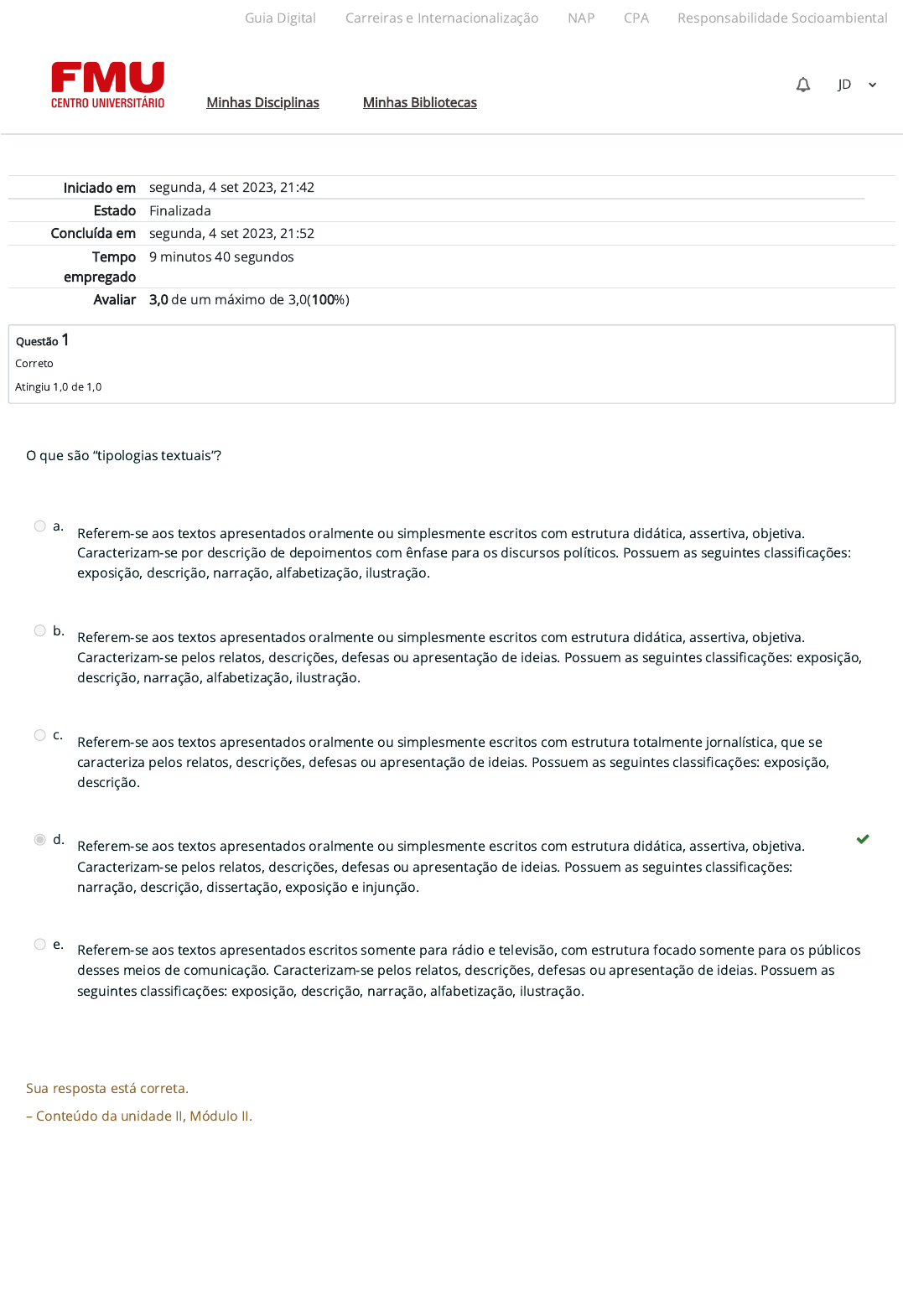 04/09/2023, 22:05 Questionário - Módulo II: Revisão da tentativa https://ambienteacademico.com.br/mod/quiz/review.php?attempt=2807999&cmid=1137202 1/3 Iniciado em segunda, 4 set 2023, 21:42 Estado Finalizada Concluída em segunda, 4 set 2023, 21:52 Tempo empregado 9 minutos 40 segundos Avaliar 3,0 de um máximo de 3,0(100%) Questão 1 Correto Atingiu 1,0 de 1,0 O que são “tipologias textuais”? a. Referem-se aos textos apresentados oralmente ou simplesmente escritos com estrutura didática, assertiva, objetiva. Caracterizam-se por descrição de depoimentos com ênfase para os discursos políticos. Possuem as seguintes classi�cações: exposição, descrição, narração, alfabetização, ilustração. b. Referem-se aos textos apresentados oralmente ou simplesmente escritos com estrutura didática, assertiva, objetiva. Caracterizam-se pelos relatos, descrições, defesas ou apresentação de ideias. Possuem as seguintes classi�cações: exposição, descrição, narração, alfabetização, ilustração. c. Referem-se aos textos apresentados oralmente ou simplesmente escritos com estrutura totalmente jornalística, que se caracteriza pelos relatos, descrições, defesas ou apresentação de ideias. Possuem as seguintes classi�cações: exposição, descrição. d. Referem-se aos textos apresentados oralmente ou simplesmente escritos com estrutura didática, assertiva, objetiva. Caracterizam-se pelos relatos, descrições, defesas ou apresentação de ideias. Possuem as seguintes classi�cações: narração, descrição, dissertação, exposição e injunção. e. Referem-se aos textos apresentados escritos somente para rádio e televisão, com estrutura focado somente para os públicos desses meios de comunicação. Caracterizam-se pelos relatos, descrições, defesas ou apresentação de ideias. Possuem as seguintes classi�cações: exposição, descrição, narração, alfabetização, ilustração. Sua resposta está correta. – Conteúdo da unidade II, Módulo II. Guia Digital Carreiras e Internacionalização NAP CPA Responsabilidade Socioambiental Minhas Disciplinas Minhas Bibliotecas JD https://codely-fmu-content.s3.amazonaws.com/Moodle/GuiaDigital/Guia+digital/index.html https://carreiras.fmu.br/ https://codely-fmu-content.s3.amazonaws.com/Moodle/NAP/inicial/nap/fmu/index.html https://codely-fmu-content.s3.amazonaws.com/Moodle/CPA/landing_CPA/index.html https://portal.fmu.br/sustentabilidade https://ambienteacademico.com.br/ https://ambienteacademico.com.br/ https://ambienteacademico.com.br/course/view.php?id=236 04/09/2023, 22:05 Questionário - Módulo II: Revisão da tentativa https://ambienteacademico.com.br/mod/quiz/review.php?attempt=2807999&cmid=1137202 2/3 Questão 2 Correto Atingiu 1,0 de 1,0 Como é caracterizado o texto injuntivo, que pode ser também descrito como instrucional? a. O texto injuntivo ou instrucional se caracteriza pela abordagem explicativa e na metodologia para se desenvolver uma determinada ação. Pode ser o texto para uma receita culinária, manual técnico de um determinado produto, bula de remédio, editais para concursos, ou editais para outras �nalidades. Dessa forma, o objetivo é oferecer instrução, detalhar explicações, mas sem argumentos para convencimentos b. O texto injuntivo ou instrucional oferece ao público instruções gerais sobre temas diversos, com foco no público universitário e se caracteriza pela publicitária e explicativa no caso gerando convencimentos para compra de bens e produtos. Dessa forma sob detalhes técnicos e tecnológicos c. O texto injuntivo ou instrucional instrui pelo método descritivo com fotos ou vídeos quando pela internet. se caracteriza pela abordagem exclusivamente acompanhada de ilustração. Neste caso com a �nalidade de detalhar explicações com argumentos e convencimentos d. O texto injuntivo ou instrucional se caracteriza pela abordagem explicativa e na metodologia para se desenvolver uma determinada ação. Pode ser o texto para uma receita culinária, manual técnico de um determinado produto, bula de remédio, editais para concursos, ou editais para outras �nalidades. Dessa forma, o objetivo é oferecer instrução, detalhar explicações, mas sem argumentos para convencimentos e. O texto injuntivo ou instrucional se caracteriza pela abordagem explicativa a realização de uma determinada compra. Pode ser um texto utilizado para um manual. Dessa forma, o objetivo convencimentos para aquisição de bens e produtos Sua resposta está correta. – Conteúdo da unidade II, Módulo II. Guia Digital Carreiras e Internacionalização NAP CPA Responsabilidade Socioambiental Minhas Disciplinas Minhas Bibliotecas JD https://codely-fmu-content.s3.amazonaws.com/Moodle/GuiaDigital/Guia+digital/index.html https://carreiras.fmu.br/ https://codely-fmu-content.s3.amazonaws.com/Moodle/NAP/inicial/nap/fmu/index.html https://codely-fmu-content.s3.amazonaws.com/Moodle/CPA/landing_CPA/index.html https://portal.fmu.br/sustentabilidade https://ambienteacademico.com.br/ https://ambienteacademico.com.br/ https://ambienteacademico.com.br/course/view.php?id=236 04/09/2023, 22:05 Questionário - Módulo II: Revisão da tentativa https://ambienteacademico.com.br/mod/quiz/review.php?attempt=2807999&cmid=1137202 3/3 Questão 3 Correto Atingiu 1,0 de 1,0 O gênero textual é identi�cado por meio de três quesitos principais. Assinale a sequência correta desses quesitos. a. formatação do texto – objetivo do texto – exposição b. função do texto – contexto do texto – atividade léxica c. objetivo do texto – coesão – injunção d. objetivo do texto - atividade léxica - função argumentativa e. objetivo do texto - função do texto - contexto do texto Sua resposta está correta. – Conteúdo da unidade II, Módulo II. ◄ Módulo II Seguir para... Módulo III ► Guia Digital Carreiras e Internacionalização NAP CPA Responsabilidade Socioambiental Minhas Disciplinas Minhas Bib