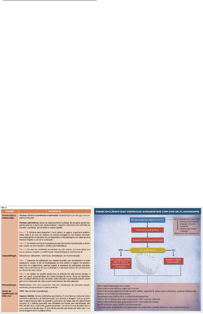 Marc 09: HPV Objetivos: 1- Entender o rastreamento e o estadiamento (citologia e colposcopia), bem como o manejo de acordo com o resultado; 2- Compreender a fisiopatologia do HPV, as manifestações clínicas, seu tempo de incubação, os tipos, a epidemiologia e os fatores de risco; 3- Entender as formas de prevenção, o diagnóstico e o tratamento do HPV; 4- Discutir sobre a vacinação: indicações e contraindicações. HPV É o responsável por 99% dos casos de câncer de colo. Trata-se de um parasita intracelular, capaz de acelerar a velocidade das mitoses celulares, o que aumenta a chance de desenvolvimento de atipias. Estudos recentes revelaram que o HPV possui proteínas que interagem com os genes supressores de tumor. Na maioria das vezes a infecção cervical pelo HPV é transitória e regride espontaneamente, entre seis meses a dois anos após a exposição. O pequeno número de casos nos quais a infecção persiste é causada por um tipo viral oncogênico e pode ocorrer o desenvolvimento de lesões precursoras. Além de aspectos relacionados à própria infecção pelo HPV, outros fatores ligados à imunidade, à genética, à idade (em mulheres mais jovens, menos que 30 anos, tende a regredir) e ao comportamento sexual também influenciam. Existem mais de 100 subtipos de HPV. Os subtipos 16 e 18 são os mais mitogênicos. O tipo 16 é o mais prevalente e o mais frequente entre os carcinomas de células escamosas. O tipo 18 é o mais comum entre os adenocarcinomas. O HPV pode ser classificado em tipos de baixo e de alto risco de desenvolver câncer. Como já dito, existem 12 tipos identificados como de alto risco (HPV tipos 16, 18, 31, 33, 35, 39, 45, 51, 52, 56, 58 e 59) que têm probabilidade maior de persistir e estarem associados a lesões pré- cancerígenas. Os subtipos 16 e 18 são responsáveis por aproximadamente 70% de todos os carcinomas cervicais, por serem os mais mitogênicos. Os HPV de tipo 6 e 11, de baixo risco e encontrados na maioria dos condilomas genitais e papilomas laríngeos, parecem não oferecer nenhum risco de progressão para malignidade. Também são descritos como tipos de baixo risco o 42, 43 e 44. Epidemiologia O papiloma vírus humano (HPV) pode acometer pessoas de qualquer idade, mas é mais frequente na faixa compreendida entre 20 e 40 anos, período de maior atividade sexual. Pelo menos 50% das mulheres sexualmente ativas são ou já foram portadoras aos 50 anos de idade. É a infecção sexualmente transmitida mais comum do trato genital feminino. O aumento da promiscuidade sexual, a diminuição da idade da primeira relação sexual e a abolição do uso de condom a favor da contracepção oral aumentam a frequência de infecção por HPV. Formas Clínicas Após a exposição, o vírus coloniza todo o epitélio do trato genital inferior. A ampla variação individual de manifestações clínicas é regulada pela resposta imunológica local ou sistêmica do hospedeiro, além da presença ou ausência de cofatores. A infecção pelo HPV pode ter diferentes evoluções: cura espontânea, com desaparecimento do vírus; persistência do vírus associada à citologia normal ou a alterações citopáticas discretas; alterações celulares transitórias que desaparecem espontaneamente; alterações celulares que, apesar de persistentes, não progridem; alterações celulares que evoluem para carcinoma in situ ou invasivo. A lesão mais evidente é o condiloma acuminado, que acomete a vulva e a pele do períneo ou o colo uterino. Os tipos virais mais comumente associados a estas lesões são o 6 e o 11. Diagnóstico e Rastreamento Os HPV, atualmente não podem ser propagados em sistemas de culturas de células. Por este motivo, o diagnóstico da infecção por HPV é obtido pela detecção dos seus efeitos morfológicos sobre a citologia e histopatologia, ou do seu Ácido Desoxirribonucleico (DNA). É importante salientar que não existe método ideal para identificação do HPV. Cada método é limitado pelo custo e pela disponibilidade. Tratamento O objetivo principal do tratamento não é a erradicação do vírus, pois ainda não temos drogas ou métodos capazes de conseguir este objetivo, mas sim destruir a lesão. Na verdade, quem destrói o vírus é o sistema imunológico da paciente. A simples presença do vírus, sem ocasionar nenhuma lesão, não necessita de tratamento, além do que, boa parte das lesões, principalmente condilomas pequenos e lesões de baixo grau, tem grande potencial de regressão espontânea. Os objetivos são: (a) erradicar condilomas (HPV 6 e 11) acuminados por questões estéticas, para evitar infecções secundárias e para prevenção de possível malignidade; (b) prevenir a evolução para malignidade; (c) prevenção da transmissão vertical e diminuir a possibilidade de formação de condilomas gigante, o que poderia obstruir um parto via vaginal; (d) prevenção da transmissão horizontal. Como em toda infecção, estão indicadas medidas gerais como higiene, recomendação do uso de preservativo, encaminhamento do parceiro para investigação e orientação, e tratamento das infecções secundárias. - Tratamento do Condiloma Acuminado: Pode ser destruído por cauterização com eletrocautério, laser, substâncias químicas, imunomoduladores ou ressecção cirúrgica. Nas lesões extensas de vulva, a fulguração com eletrocautério ou destruição com laser deve ser preferida. Nas mais localizadas pode-se usar o TCA (ácido tricloroacético). Algumas lesões muito volumosas necessitam de ressecção cirúrgica. → Preparado de podofilina: é uma resina extraída de plantas associada a duas substâncias sabidamente carcinogênicas que interfere na mitose celular e causa danos na microcirculação com lesão endotelial que resultam em necrose celular. Possui baixa eficácia e vários efeitos adversos. Além disso é neurotóxica para o feto; → Ácido tricloroacético: substância cáustica que atua lo