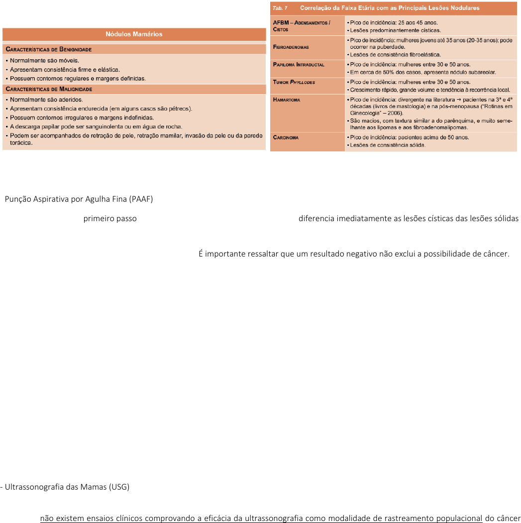 Marc 13: Nódulos mamários Objetivos 1- Aprender a fisiopatologia, a etiologia, os fatores de risco e as manifestações clínicas dos nódulos mamários; 2- Compreender o rastreamento, o diagnóstico clínico e diferencial e os tipos histológicos dos nódulos; 3- Elucidar a classificação (Bi-rads) e tratamento diferenciando nódulos benignos e malignos; 4- Entender a importância do diagnóstico precoce do CA de mama. Nódulos são lesões que podem ser delimitados em três dimensões (largura, comprimento e profundidade). O seu achado é em geral assimétrico, quando em comparação com a outra mama. Em aproximadamente 80% dos casos, os nódulos palpáveis são de origem benigna. Os adensamentos são diferentes dos nódulos porque são lesões delimitadas em apenas duas dimensões (largura e comprimento). Em caso da presença de nódulos, deve-se investigar a data da percepção, velocidade de crescimento, localização, consistência, relação com traumatismos ou ciclo menstrual. Os pseudonódulos são achados palpatórios fisiológicos que simulam tumores por diferenças de consistência do parênquima mamário. Os exemplos de pseudonódulos incluem: tecido adiposo aprisionado entre os ligamentos de Cooper, prolongamento axilar, junção costoesternal em pacientes magras e diferença de consistência na região subareolar com o parênquima, dentre outros. Como investigar - Punção Aspirativa por Agulha Fina (PAAF) A PAAF é o primeiro passo na investigação dos nódulos mamários, pois diferencia imediatamente as lesões císticas das lesões sólidas. É um procedimento ambulatorial, de simples realização e baixo custo. Possui sensibilidade e especificidade superiores a 90%. Pode ser empregada em tumores clinicamente identificáveis ou guiada por ultrassonografia ou exame radiológico. O limite deste método é apenas fornecer material para estudo citopatológico e não fornecer diagnóstico. É importante ressaltar que um resultado negativo não exclui a possibilidade de câncer. Podem-se encontrar dois resultados: cistos e tumores sólidos. Nos cistos simples, o fluido aspirado não é sanguinolento e a massa desaparece após a aspiração. Nos carcinomas intracísticos ou neoplasias parcialmente císticas, ocorre líquido aspirado sanguinolento, massa palpável persistente após aspiração do líquido, recidiva frequente dos cistos. Já os tumores sólidos são diagnosticados após a falha em aspirar líquido com a PAAF. Sempre diante de um nódulo suspeito, a citologia só possui valor se positiva. Nesta situação, se for negativa, é obrigatória a realização de biópsia. A saída de líquido amarelo-esverdeado e a ausência de massa residual dispensam o estudo citológico do líquido. Em outras palavras, o líquido pode ser desprezado. O próximo passo consiste na solicitação de exames de imagem para avaliar o sítio onde a lesão se encontrava. Caso estes exames sejam normais, a paciente só deverá retornar em quatro a seis semanas. Caso os exames revelem alterações sugestivas de malignidade, está formalmente indicada a biópsia. É importante salientar que o tipo de exame de imagem a ser solicitado dependerá da idade da paciente. A presença de um nódulo sólido e/ou de líquido sanguinolento e/ou de nódulo residual ou a existência de mais de duas recidivas de cistos simples indicam o estudo citológico acompanhado da solicitação de exames de imagem (solicitados de acordo com a idade da paciente), e da realização de biópsia. A citologia negativa não encerra a investigação de um nódulo suspeito de malignidade. A aspiração de líquido sanguinolento, a presença de massa palpável após a retirada de todo líquido, mais de duas recidivas de coleções de líquido e a persistência de densidade mamográfica após a aspiração favorecem a hipótese de carcinoma intracístico ou carcinoma parcialmente cístico. Nestas situações, a realização de biópsia está formalmente indicada para estudo histopatológico. - Ultrassonografia das Mamas (USG) Possui grande eficácia no diagnóstico de lesões clínicas e subclínicas pela utilização de transdutores de alta frequência. Até o presente momento, não existem ensaios clínicos comprovando a eficácia da ultrassonografia como modalidade de rastreamento populacional do câncer de mama. No grupo de alto risco, a ultrassonografia pode ser utilizada em conjunto com a mamografia, com a finalidade de melhorar o desempenho do rastreamento. É um método que assegura boa diferenciação entre nódulos sólidos e císticos; apresenta adequada eficiência na definição de imagem em mamas densas (pacientes jovens) e complementa o rastreio mamográfico; garante boa acurácia na identificação de lesões vegetantes intracísticas; permite a localização de pequenos tumores para retirada cirúrgica ou para punções; e possibilita a avaliação do resultado da quimioterapia primária. É um método indicado principalmente em mulheres jovens, lactantes e gestantes, para se evitar a exposição à radiação ionizante. As desvantagens incluem a incapacidade na detecção de microcalcificações e a baixa resolução em mamas lipossubstituídas. A complementação da mamografia com a ultrassonografia pode ser considerada obrigatória e com grande benefício no diagnóstico nas seguintes situações: quando há lesão palpável sem expressão na mamografia (pela alta densidade do parênquima mamário ou localização em “zonas cegas”); nos nódulos regulares ou lobulados, que possam representar cisto; e nas lesões densificantes (assimetria difusa, área densa) que podem representar lesão sólida, cisto ou parênquima mamário. A complementação pode ser dispensada nos pequenos nódulos de aspecto benigno em mamas adiposas. - Mamografia de Alta Resolução (MMG) É o método principal e seguro de auxílio ao exame clínico no câncer de mama. Definitivamente, é o método propedêutico mais importante 