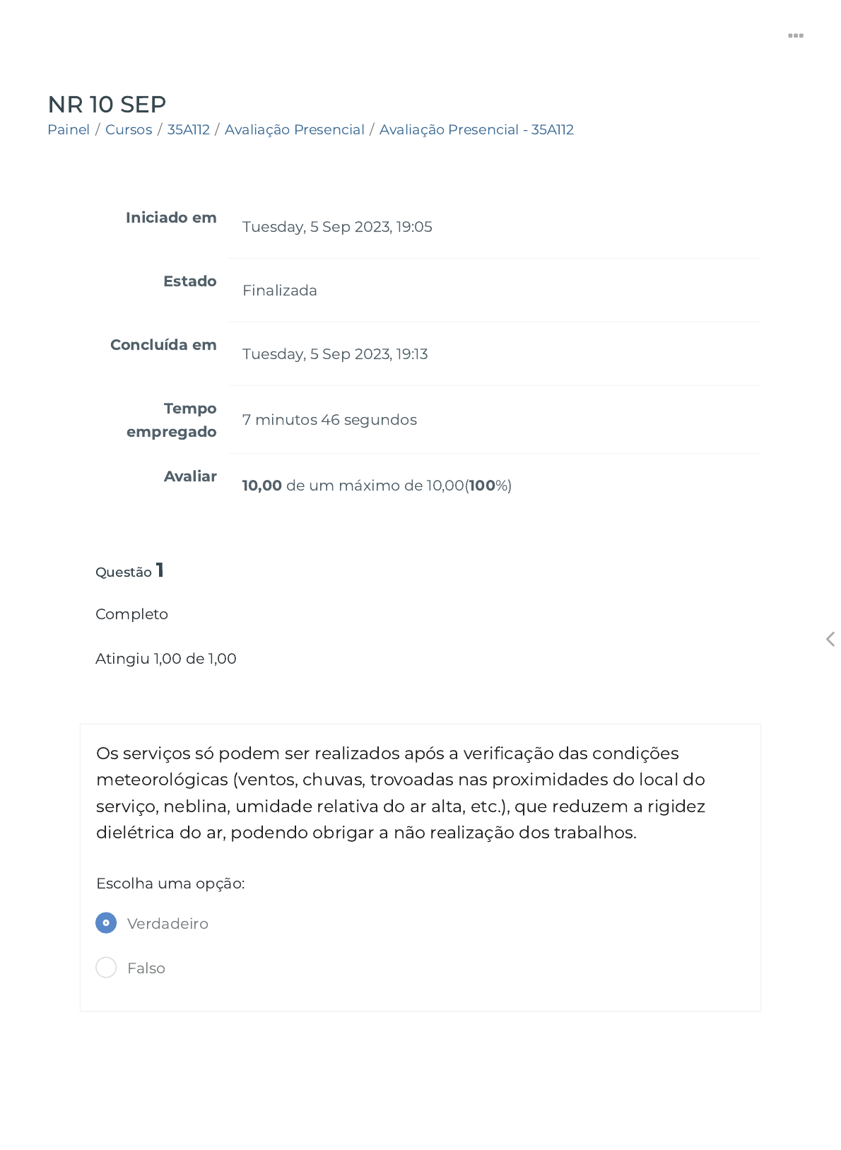 Painel / Cursos / 35A112 / Avaliação Presencial / Avaliação Presencial - 35A112 NR 10 SEP Iniciado em Tuesday, 5 Sep 2023, 19:05 Estado Finalizada Concluída em Tuesday, 5 Sep 2023, 19:13 Tempo empregado 7 minutos 46 segundos Avaliar 10,00 de um máximo de 10,00(100%) Questão 1 Completo Atingiu 1,00 de 1,00 Os serviços só podem ser realizados após a veri�cação das condições meteorológicas (ventos, chuvas, trovoadas nas proximidades do local do serviço, neblina, umidade relativa do ar alta, etc.), que reduzem a rigidez dielétrica do ar, podendo obrigar a não realização dos trabalhos. Escolha uma opção: Verdadeiro Falso https://ava.politecnicabr.com.br/my/ https://ava.politecnicabr.com.br/course/index.php https://ava.politecnicabr.com.br/course/view.php?id=1034 https://ava.politecnicabr.com.br/course/view.php?id=1034#section-25 https://ava.politecnicabr.com.br/mod/quiz/view.php?id=32591 https://ava.politecnicabr.com.br/ Questão 2 Completo Atingiu 1,00 de 1,00 São considerados procedimentos para desenergização, exceto: Escolha uma opção: a. Constatação da ausência de tensão b. Entrar no potencial da rede com adotando as técnicas adequadas. c. Impedimento da reenergização d. Secionamento e. Instalação do conjunto aterramento temporário e equipotencialização https://ava.politecnicabr.com.br/ Questão 3 Completo Atingiu 1,00 de 1,00 São considerados sistemas de proteção coletiva, exceto: Escolha uma opção: a. Coberturas para condutor e isolador de pino e suspensão até 15 kV b. Coberturas para cruzeta c. Luvas e mangas isolantes de borracha d. Coberturas para chave fusível e. Coberturas para postes https://ava.politecnicabr.com.br/ Questão 4 Completo Atingiu 1,00 de 1,00 São características das mangas isolantes de borracha, exceto: Escolha uma opção: a. São fabricadas para se trabalhar com redes energizadas. b. Oferece uma ótima proteção quando trabalhadas em ambientes úmidos ou molhados. c. Apresentam as melhores caraterísticas de maciez e um composto de borracha altamente dielétrico. d. Tem um formato ligeiramente encurvado que permite uma forma natural em torno da curva do cotovelo. https://ava.politecnicabr.com.br/ Questão 5 Completo Atingiu 1,00 de 1,00 Os pro�ssionais realizam seus trabalhos em locais que estão no mesmo potencial da terra, ou seja, se posicionando em escadas e executando todo o serviço através de ferramentas e equipamentos adequados. Este procedimento se refere ao método de trabalho: Escolha uma opção: Questão 6 Completo Atingiu 1,00 de 1,00 Os riscos ergonômicos são signi�cativos nas atividades do setor elétrico e estão relacionados a fatores biomecânicos, organizacionais, psicossociais e ambientais. Escolha uma opção: Em altura Ao contato Noturno À distância Ao potencial Verdadeiro Falso https://ava.politecnicabr.com.br/ Questão 7 Completo Atingiu 1,00 de 1,00 Os pro�ssionais �cam em potencial intermediário, isolados em potencial da terra ou da rede, executando as tarefas ao contato, através de cestas aéreas ou plataformas, usando ferramentas e equipamentos adequados. Este procedimento se refere ao método de trabalho: Escolha uma opção: À distância Em altura Noturno Ao contato Ao potencial https://ava.politecnicabr.com.br/ Questão 8 Completo Atingiu 1,00 de 1,00 Inicia-se onde a energia elétrica é transformada, normalmente em subestações elevadoras, elevadas a níveis de tensão padronizados em 69, 138, 230 ou 500 kV, e transportada em corrente alternada através de cabos elétricos, até as subestações abaixadoras. Esta organização se refere a qual fase da energia elétrica? Escolha uma opção: a. Geração b. Consumo c. Transmissão d. Distribuição https://ava.politecnicabr.com.br/ Questão 9 Completo Atingiu 1,00 de 1,00 O aterramento temporário que fará escoar pela terra as correntes provocadas por uma energização acidental sem colocar em risco a vida do colaborador, é considerado um sistema de proteção coletiva. Escolha uma opção: Questão 10 Completo Atingiu 1,00 de 1,00 Os riscos de origem elétrica são: o choque elétrico, arco elétrico e campo eletromagnético. Escolha uma opção: Verdadeiro Falso Verdadeiro Falso https://ava.politecnicabr.com.br/ © 2022 - Escola Politécnica Brasileira Entre em Contato https://www.politecnicabr.com.br 0800 084 2627 0800 084 2627 Links Úteis Dicas da nossa Diretora Acadêmica Planner de Estudos Declaração de Matrícula Orientações do AVA Abertura de Ticket Fale com o Tutor Cronograma de Estudos Manual de Estágio Manual de Competência Siga-nos nas redes sociais https://ava.politecnicabr.com.br/mod/quiz/0 https://www.politecnicabr.com.br/ https://soundcloud.com/user-501638417/sets/escola-politecnica-brasileira https://storage.googleapis.com/sirius-pubstore/semestre_plannerdeestudo%20poli.pdf https://storage.googleapis.com/sirius-pubstore/declaracao_matricula.pdf https://storage.googleapis.com/sirius-pubstore/orientacoes_ava.pdf https://storage.googleapis.com/sirius-pubstore/abertura_ticket.pdf https://storage.googleapis.com/sirius-pubstore/fale_com_tutor.pdf https://storage.googleapis.com/sirius-pubstore/cronograma_estudos.pdf https://storage.googleapis.com/sirius-pubstore/manual_estagio.pdf https://storage.googleapis.com/sirius-pubstore/manual_competencia.pdf https://www.facebook.com/politecnicabr https://www.instagram.com/politecnicabr_oficial https://ava.politecnicabr.com.br/