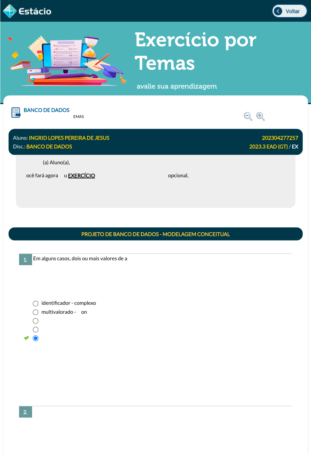 28/08/2023, 16:36 Estácio: Alunos https://simulado.estacio.br/alunos/ 1/3 Exercício por Temas avalie sua aprendizagem Em alguns casos, dois ou mais valores de atributos em um modelo de Entidade-Relacionamento estão relacionados. Por exemplo, os atributos Idade e Data de Nascimento de uma pessoa. Para uma Entidade − Pessoa em particular, o valor de Idade pode ser determinado pela data corrente e o valor de Data de Nascimento da pessoa. Portanto, o atributo Idade é chamado atributo ...I... do atributo Data de Nascimento, que, por sua vez, é chamado atributo ...II... . As lacunas I e II são, correta e respectivamente, preenchidas com: Em Modelo de Entidade de Relacionamento, possuímos entidades e atributos. A esse respeito, analise as assertivas e assinale a alternativa que aponta a(s) correta(s). I. O objeto básico de um MER é uma entidade, "algo" do mundo real, com uma existência independente. II. Uma entidade pode ser um objeto com uma existência física (por exemplo, uma pessoa, um carro, uma casa ou um funcionário) ou um objeto com uma existência conceitual (por exemplo, uma empresa, um trabalho ou um curso BANCO DE DADOS Lupa DGT0282_202304277257_TEMAS Aluno: INGRID LOPES PEREIRA DE JESUS Matr.: 202304277257 Disc.: BANCO DE DADOS 2023.3 EAD (GT) / EX Prezado (a) Aluno(a), Você fará agora seu EXERCÍCIO! Lembre-se que este exercício é opcional, mas não valerá ponto para sua avaliação. O mesmo será composto de questões de múltipla escolha. Após responde cada questão, você terá acesso ao gabarito comentado e/ou à explicação da mesma. Aproveite para se familiarizar com este modelo de questões que será usado na sua AV e AVS. PROJETO DE BANCO DE DADOS - MODELAGEM CONCEITUAL 1. identi�cador - complexo multivalorado - monovalorado armazenado - derivado resultante - unívoco derivado - armazenado Data Resp.: 28/08/2023 16:31:54 Explicação: A resposta correta é: derivado - armazenado. 2. javascript:voltar(); javascript:voltar(); javascript:diminui(); javascript:aumenta(); 28/08/2023, 16:36 Estácio: Alunos https://simulado.estacio.br/alunos/ 2/3 universitário). III. Os valores dos atributos que descrevem cada entidade se tornarão a maior parte dos dados armazenados no banco de dados. IV. Cada entidade tem atributos ¿ propriedades particulares que a descrevem. Por exemplo, uma entidade empregada pode ser descrita pelo nome do empregado, idade, endereço, salário e trabalho (função). Em relação aos conceitos de bancos de dados, é correto a�rmar que: Na nomenclatura de banco de dados, restrição corresponde a uma regra que deve ser obedecida pelo SGBD. Seja a restrição "um funcionário não pode ter salário maior que seu chefe imediato", esta deve ser classi�cada como restrição de: Logo da análise dos requisitos de um projeto de banco de dados para representar as estradas de um País, obteve-se as seguintes especi�cações: As estradas são descritas pelo nome o�cial, apelido (pode ser mais de um), tipo, extensão. I, II, III e IV. Apenas I. Apenas I, III e IV. Apenas II, III e IV. Apenas I, II e III. Data Resp.: 28/08/2023 16:33:30 Explicação: A resposta correta é: I, II, III e IV. 3. Um atributo não pode possuir cardinalidade. Um atributo pode possuir cardinalidade de relacionamentos. Em uma generalização/especialização total, para cada ocorrência da entidade genérica, existe sempre uma ocorrência em uma das entidades especializadas. Um relacionamento não pode possuir cardinalidade. O conjunto de valores que um atributo pode assumir é a cardinalidade do atributo. Data Resp.: 28/08/2023 16:35:40 Explicação: A resposta correta é: Em uma generalização/especialização total, para cada ocorrência da entidade genérica, existe sempre uma ocorrência em uma das entidades especializadas. 4. Domínio Tabela Chave Semântica Unicidade Data Resp.: 28/08/2023 16:32:29 Explicação: A resposta correta é: Semântica. 5. 28/08/2023, 16:36 Estácio: Alunos https://simulado.estacio.br/alunos/ 3/3 As estradas se classi�cam em: Federais, estaduais e municipais. As estradas se dividem em trechos. Porém um trecho pertence sempre a única estrada e não poderá fazer parte de outra estrada. Existe o trecho inicial e trecho �nal de uma estrada. Na criação de um modelo de entidades-relacionamento para o problema descrito acima, marque a alternativa correta: O apelido da estrada vai ser o atributo identi�cador pois é o nome pelo qual a estrada é mais conhecida. TRECHO será modelada como uma especialização de ESTRADA. A classi�cação das estradas gerará três atributos para a entidade ESTRADA: Federal, estadual e municipal. TRECHO pode ser modelada como uma entidade fraca com relação a ESTRADA. Teremos três entidades para representar trecho: TRECHO_INICIAL, TRECHO_FINAL e TRECHO. Sendo TRECHO uma entidade fraca que se relaciona com as outras duas. Data Resp.: 28/08/2023 16:32:16 Explicação: A resposta correta é: TRECHO pode ser modelada como uma entidade fraca com relação a ESTRADA. Não Respondida Não Gravada Gravada Exercício por Temas inciado em 28/08/2023 16:31:06.