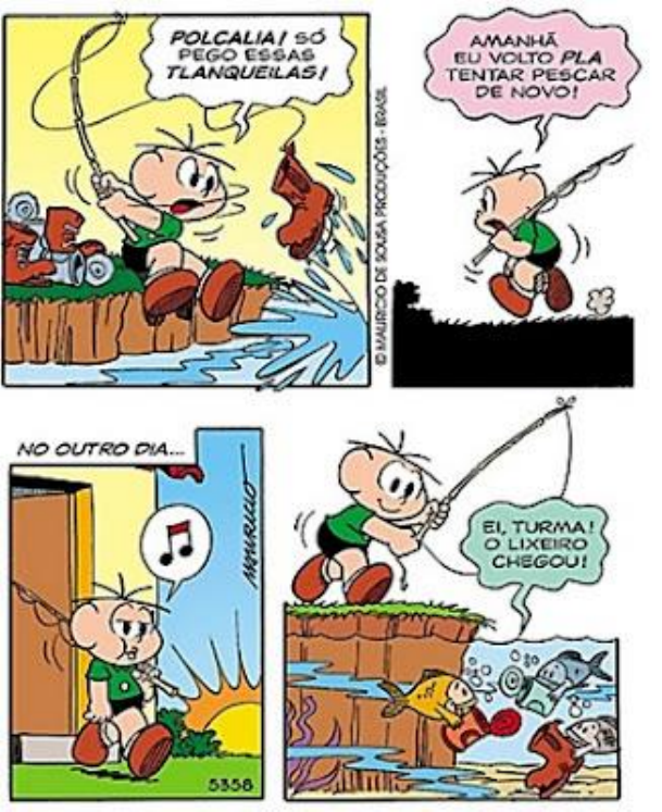 EMEF MARECHAL RONDON Nome:______________________________________________________________________ Turma: 5º C Data: 08/09/2023 Professor: Rodrigo Duarte AULA ORIENTADA PARA 08/09/2023 LÍNGUA PORTUGUESA 1. No primeiro quadrinho, que palavra marca a ação praticada por Cebolinha? _______________________________________________________________________ 2. No segundo quadrinho, há três verbos, escreva-os abaixo. _______________________________________________________________________ 3. A expressão da tirinha que revela um verbo de ação no passado é: a) “Só pego essas tlanqueilas!” b) Amanhã eu volto...” c) “No outro dia...” d) “O lixeiro chegou!” 4. Esse trecho da história se refere a algo que a) está acontecendo. b) ainda acontecerá. c) já aconteceu. 5. Os verbos destacados no trecho indicam a ação do personagem (o lobo). Esses verbos estão no tempo a) presente. b) passado. c) futuro. MATEMÁTICA Escreva a fração correspondente a parte colorida de cada figura