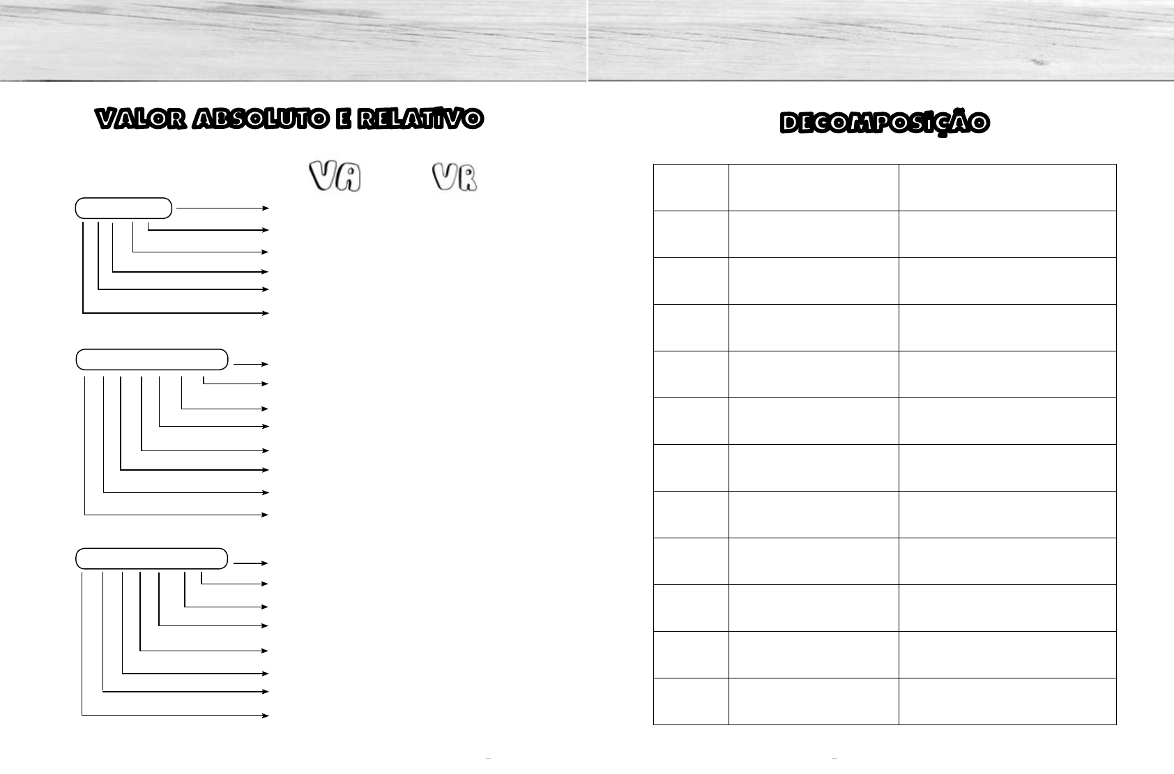 6 5 4. 1 2 4 2 3. 1 3 6. 4 8 5 4 6. 1 9 8. 2 3 7 78 79 REFORÇO ESCOLAR – 4O ANO REFORÇO ESCOLAR – 4O ANO DECOMPOSIÇÃO Decomponha e escreva como são lidos os números representador por: 11.429 10.000 + 1.000 + 400 + 20 + 9 Onze mil, quatrocentos e vinte e nove. 34.675.112 9.452 674 1.235 1.325.678 786 43.543 198 2.345.657 234.564 3.675 VALOR ABSOLUTO E RELATIVO Escreva os valores absoluto e relativo dos algarismos a seguir: _________________ _________________ _________________ _________________ _________________ _________________ _________________ _________________ _________________ _________________ _________________ _________________ _________________ _________________ _________________ _________________ _________________ _________________ _________________ _________________ _________________ _________________ _________________ _________________ _________________ _________________ _________________ _________________ _________________ _________________ _________________ _________________ _________________ _________________ _________________ _________________ _________________ _________________ _________________ _________________ _________________ _________________ _________________ _________________ 30.000.000 + 4.000.000 + 600.000 + 70.000 + 5.000 + 100 +1 0 + 2 Trinta e quatro milhões, seiscentos e setenta e cinco mil, cento e doze. 9.000 + 400 + 50 + 2 Nove mil quatrocentos e cinquenta e dois. 600 + 70 + 4 Seiscentos e setenta e quatro. 1.000 + 200 + 30 + 5 Mil duzentos e trinta e cinco. 1.000.000+300.000+20.000+ 5.000+600+70+8 Um milhão, trezentos e vinte e cinco mil, seiscentos e setenta e oito. 700 + 80 + 6 Setecentos e oitenta e seis. 40.000 + 3.000 + 500 + 40 + 3 Quarenta e três mil, quinhentos e quarenta e três. 100 + 90 + 8 Cento e noventa e oito. 2.000.000+300.000+40.000+ 5.000+600+50+7 Dois milhões, trezentos e quarenta e cinco mil, seiscentos e cinquenta e sete. 200.000 + 30.000 + 4.000 + 500 + 60 + 4 Duzentos e trinta e quatro mil, quinhentos e sessenta e quatro. 3.000 + 600 + 70 + 5 Três mil, seiscentos e setenta e cinco. 4 2 1 4 5 6 4 20 100 4.000 50.000 600.000 5 8 4 6 3 1 3 2 7 3 2 8 9 1 6 4 7 30 200 8.000 90.000 100.000 6.000.000 40.000.000 5 80 400 6.000 30.000 100.000 3.000.000 20.000.000 warnnmommssmasm® c c ( ) ) m m DIGG M FIO S i G7AO 6 5 4. 1 2 4 2 3. 1 3 6. 4 8 5 4 6. 1 9 8. 2 3 7 78 79Oficina de REFORÇO ESCOLAR – 4O ANO Oficina de REFORÇO ESCOLAR – 4O ANO DECOMPOSIÇÃO Decomponha e escreva como são lidos os números representador por: 11.429 10.000 + 1.000 + 400 + 20 + 9 Onze mil, quatrocentos e vinte e nove. 34.675.112 9.452 674 1.235 1.325.678 786 43.543 198 2.345.657 234.564 3.675 VALOR ABSOLUTO E RELATIVO Escreva os valores absoluto e relativo dos algarismos a seguir: _________________ _________________ _________________ _________________ _________________ _________________ _________________ _________________ _________________ _________________ _________________ _________________ _________________ _________________ _________________ _________________ _________________ _________________ _________________ _________________ _________________ _________________ _________________ _________________ _________________ _________________ _________________ _________________ _________________ _________________ _________________ _________________ _________________ _________________ _________________ _________________ _________________ _________________ _________________ _________________ _________________ _________________ _________________ _________________ 30.000.000 + 4.000.000 + 600.000 + 70.000 + 5.000 + 100 +1 0 + 2 Trinta e quatro milhões, seiscentos e setenta e cinco mil, cento e doze. 9.000 + 400 + 50 + 2 Nove mil quatrocentos e cinquenta e dois. 600 + 70 + 4 Seiscentos e setenta e quatro. 1.000 + 200 + 30 + 5 Mil duzentos e trinta e cinco. 1.000.000+300.000+20.000+ 5.000+600+70+8 Um milhão, trezentos e vinte e cinco mil, seiscentos e setenta e oito. 700 + 80 + 6 Setecentos e oitenta e seis. 40.000 + 3.000 + 500 + 40 + 3 Quarenta e três mil, quinhentos e quarenta e três. 100 + 90 + 8 Cento e noventa e oito. 2.000.000+300.000+40.000+ 5.000+600+50+7 Dois milhões, trezentos e quarenta e cinco mil, seiscentos e cinquenta e sete. 200.000 + 30.000 + 4.000 + 500 + 60 + 4 Duzentos e trinta e quatro mil, quinhentos e sessenta e quatro. 3.000 + 600 + 70 + 5 Três mil, seiscentos e setenta e cinco. 4 2 1 4 5 6 4 20 100 4.000 50.000 600.000 5 8 4 6 3 1 3 2 7 3 2 8 9 1 6 4 7 30 200 8.000 90.000 100.000 6.000.000 40.000.000 5 80 400 6.000 30.000 100.000 3.000.000 20.000.000 valor absoluto e relativo decomposição