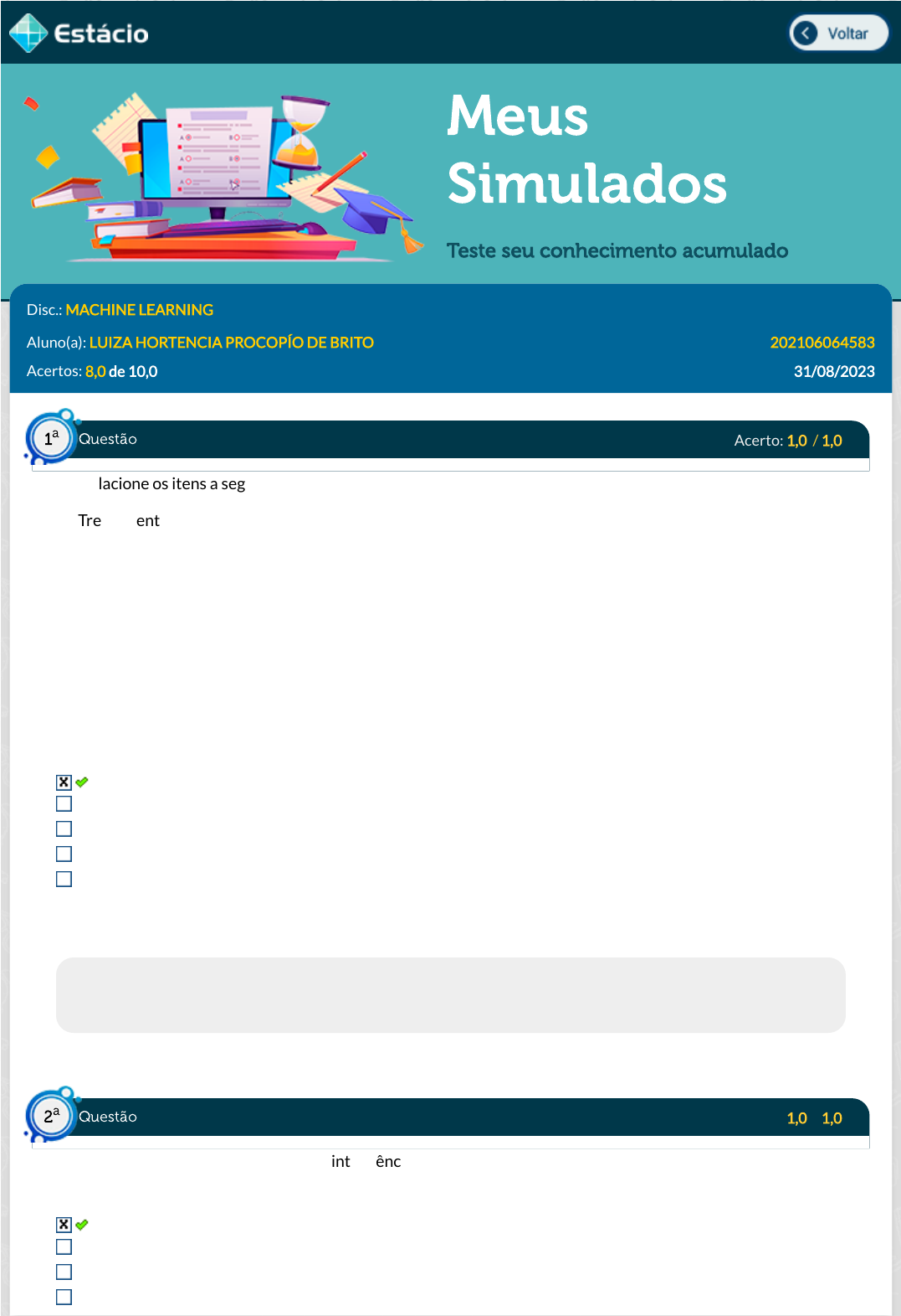 06/09/2023, 18:59 Estácio: Alunos https://simulado.estacio.br/alunos/ 1/6 Meus Simulados Teste seu conhecimento acumulado Disc.: MACHINE LEARNING Aluno(a): LUIZA HORTENCIA PROCOPÍO DE BRITO 202106064583 Acertos: 8,0 de 10,0 31/08/2023 Acerto: 1,0 / 1,0 Correlacione os itens a seguir: (S) Treinamento supervisionado (N) Treinamento não supervisionado com I - A rede neural arti�cial aprende a partir de padrões conhecidos. II - O treinamento é direcionado para diminuir o erro na saída. III - Os padrões de treinamento possuem apenas entradas. Assinale a alternativa correta: I(S), II (S) e III (N) I(S), II (S) e III (S) I(N), II (N) e III (N) I(N), II(N) e III (S) I(N), II (S) e III (S) Respondido em 31/08/2023 16:50:06 Explicação: Resposta correta: I(S), II (S) e III (N) Acerto: 1,0 / 1,0 Comparando inteligência humana com inteligência arti�cial, os sistemas que pensam e agem como humanos, e os sistemas que pensam e agem racionalmente são, respectivamente: Ciência Cognitiva, Teste de Turing, Lógica e Agentes racionais. Lógica, Teste de Turing, Ciência Cognitiva e Agentes racionais. Ciência Cognitiva, Teste de Turing, Agentes racionais e Lógica. Ciência Cognitiva, Lógica, Teste de Turing e Agentes racionais. Questão1 a Questão2 a https://simulado.estacio.br/alunos/inicio.asp javascript:voltar(); 06/09/2023, 18:59 Estácio: Alunos https://simulado.estacio.br/alunos/ 2/6 Lógica, Teste de Turing, Agentes racionais e Ciência Cognitiva. Respondido em 31/08/2023 16:52:05 Explicação: Resposta correta: Ciência Cognitiva, Teste de Turing, Lógica e Agentes racionais. Acerto: 1,0 / 1,0 Uma nuvem de palavras é um recurso grá�co (usado principalmente na Internet) para descrever os termos mais frequentes de um determinado texto. O tamanho da fonte em que a palavra é apresentada é uma função da frequência da palavra no texto: palavras mais frequentes são desenhadas em fontes de tamanho maior, palavras menos frequentes são desenhadas em fontes de tamanho menor. Qual é a técnica de análise de dados descrita pelo texto acima? Redes Neurais. Agrupamento. Regressão Linear. Classi�cação. Processamento de Linguagem Natural. Respondido em 31/08/2023 17:00:21 Explicação: Resposta correta: Processamento de Linguagem Natural. Acerto: 1,0 / 1,0 A Mineração de Dados (DM ¿ Data Mining) é uma das etapas da Descoberta do Conhecimento em Base de Dados (KDD ¿ Knowledge Discovery in Databases), sendo considerada a principal etapa do processo de KDD. Neste processo, existe um conceito essencial, por dois motivos principais, que tem a seguinte de�nição: "podem ser usadas após a etapa de Mineração de Dados, a �m de ordenar ou �ltrar os padrões descobertos de acordo com o grau de interesse associado a estes padrões; podem ser usadas para restringir ou guiar o espaço de busca de Mineração de Dados, melhorando a e�ciência da busca ao eliminar conjuntos de padrões que não satisfaçam a condições predeterminadas". (GOLDSCHMIDT; PASSOS; BEZERRA, 2015.) Representação do conhecimento. Similaridade e distância. Aprendizado por reforço. Aprendizado indutivo. Medidas de interesse. Respondido em 31/08/2023 17:04:36 Explicação: Resposta correta: Medidas de interesse. Questão3 a Questão4 a 06/09/2023, 18:59 Estácio: Alunos https://simulado.estacio.br/alunos/ 3/6 Acerto: 1,0 / 1,0 Questão5 a 06/09/2023, 18:59 Estácio: Alunos https://simulado.estacio.br/alunos/ 4/6 Qual o elemento da teoria da informação que é levado em consideração na otimização da função de Ganho de Informação? Volumetria. Variância. Entropia. Linearidade. Desvio Padrão. Respondido em 31/08/2023 16:56:45 Explicação: Resposta correta: Entropia. Acerto: 0,0 / 1,0 Qual hiperparâmetro da �oresta aleatória garante capacidade de maior generalização e capacidade de lidar com alta variabilidade dos dados? Desvio Padrão. Variância. Criterion. Número de Estimadores. Média de Poisson. Respondido em 31/08/2023 17:08:38 Explicação: Resposta correta: Número de Estimadores. Acerto: 1,0 / 1,0 Uma das etapas mais importantes do ciclo de vida de uma rede neural é a de treinamento. Em relação ao treinamento dos modelos de aprendizado profundo, selecione a opção correta. O modelo de rede neural de convolução é superior à rede neural recorrente, que, por sua vez, é superior à rede neural profunda. Para que possam obter suas saídas, as redes neurais recorrentes usam as entradas atuais e levam em consideração aquelas que ocorreram antes delas. As redes neurais recorrentes utilizam o algoritmo de alimentação direta para realizar o seu treinamento. As redes neurais profundas compartilham os seus parâmetros por todas as etapas de processamento da rede. Os processos de treinamento de cada modelo de rede são individuais, não contendo nenhum tipo de semelhança entre si. Respondido em 31/08/2023 17:08:39 Explicação: Questão6 a Questão7 a 06/09/2023, 18:59 Estácio: Alunos https://simulado.estacio.br/alunos/ 5/6 Resposta correta: Para que possam obter suas saídas, as redes neurais recorrentes usam as entradas atuais e levam em consideração aquelas que ocorreram antes delas. Acerto: 1,0 / 1,0 O aprendizado de máquina tem um potencial gigantesco de aplicações práticas que ainda estão sendo exploradas. Muitas dessas aplicações já fazem parte do dia a dia. No site do SageMaker da Amazon, são apresentados diversos casos de uso que tratam de aplicações práticas. Em relação às aplicações com aprendizado de máquina, selecione a opção correta que pode ser utilizada para traçar estratégias de gerenciamento de estoque. Visão computacional Previsão sob demanda Direção autônoma Detecção de fraudes Manutenção preditiva Respondido em 31/08/2023 17:05:44 Explicação: Resposta correta: Previsão sob demanda Acerto: 0,0 / 1,0 A preparação da string de busca faz parte de que fase do entendimento do problema? Análise exploratória. Levantamento de 