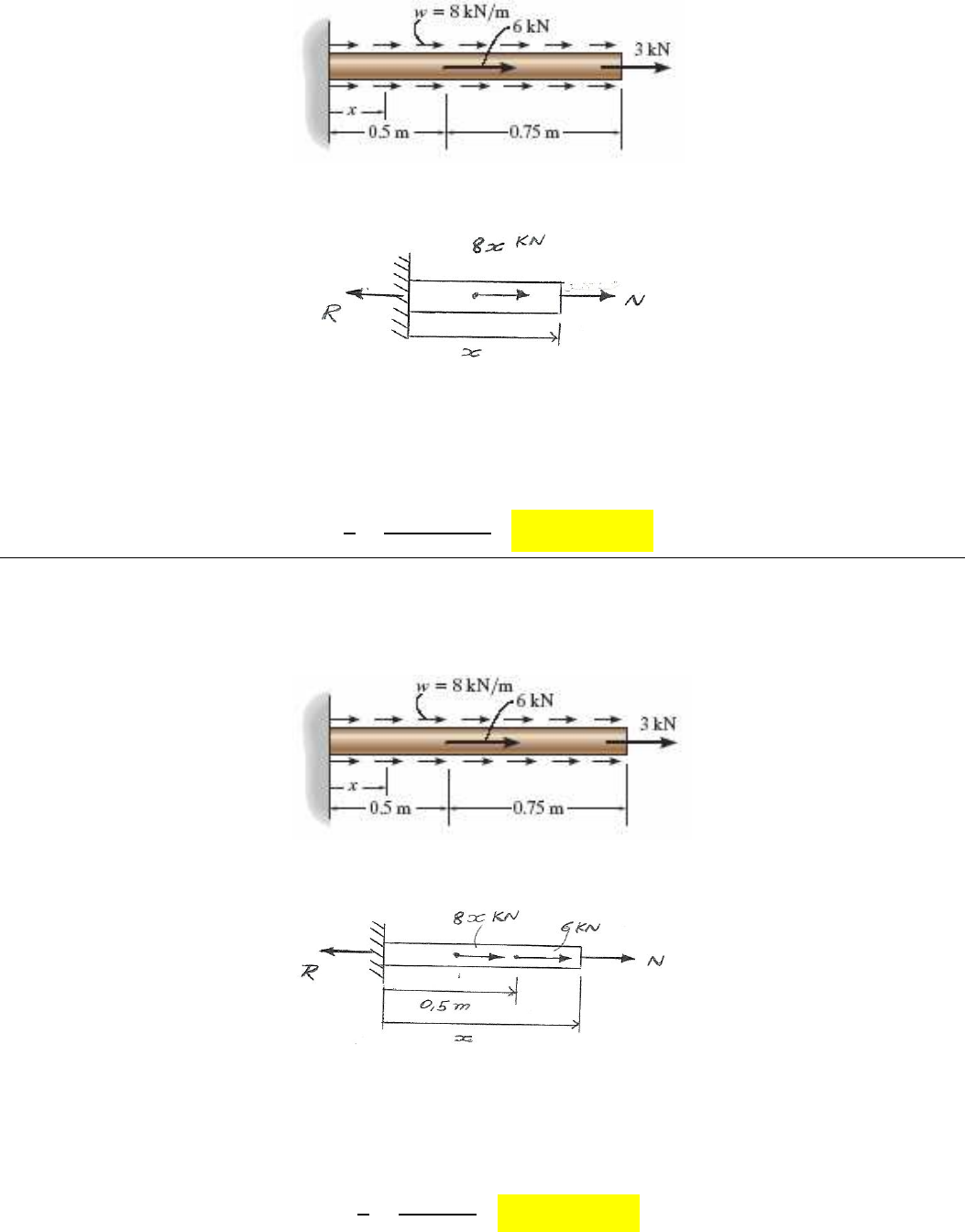 Tensão 48 Resolução: Steven Róger Duarte 1.73. A área da seção transversal da barra é 400(10-6) m². Se ela estiver sujeita a uma carga axial distribuída uniformemente ao longo de seu comprimento e a duas cargas concentradas como mostra a figura, determine a tensão normal média na barra em função de x para . Figura 1.73 ∑ ; ∑ 3 + 6 + 8 x 1,25 – R = 0 N + 8x – 19 = 0 R = 19 kN N = (19 – 8x) kN σ = ( )( ) = (47,5 – 20x) MPa 1.74. A área da seção transversal da barra é 400(10-6) m². Se ela estiver sujeita a uma carga axial distribuída uniformemente ao longo de seu comprimento e a duas cargas concentradas como mostra a figura, determine a tensão normal média na barra em função de x para . Figura 1.74 ∑ ; ∑ 3 + 6 + 8 x 1,25 – R = 0 N + 6 + 8x – 19 = 0 R = 19 kN N = (13 – 8x) kN σ = = (32,5 – 20x) MPa